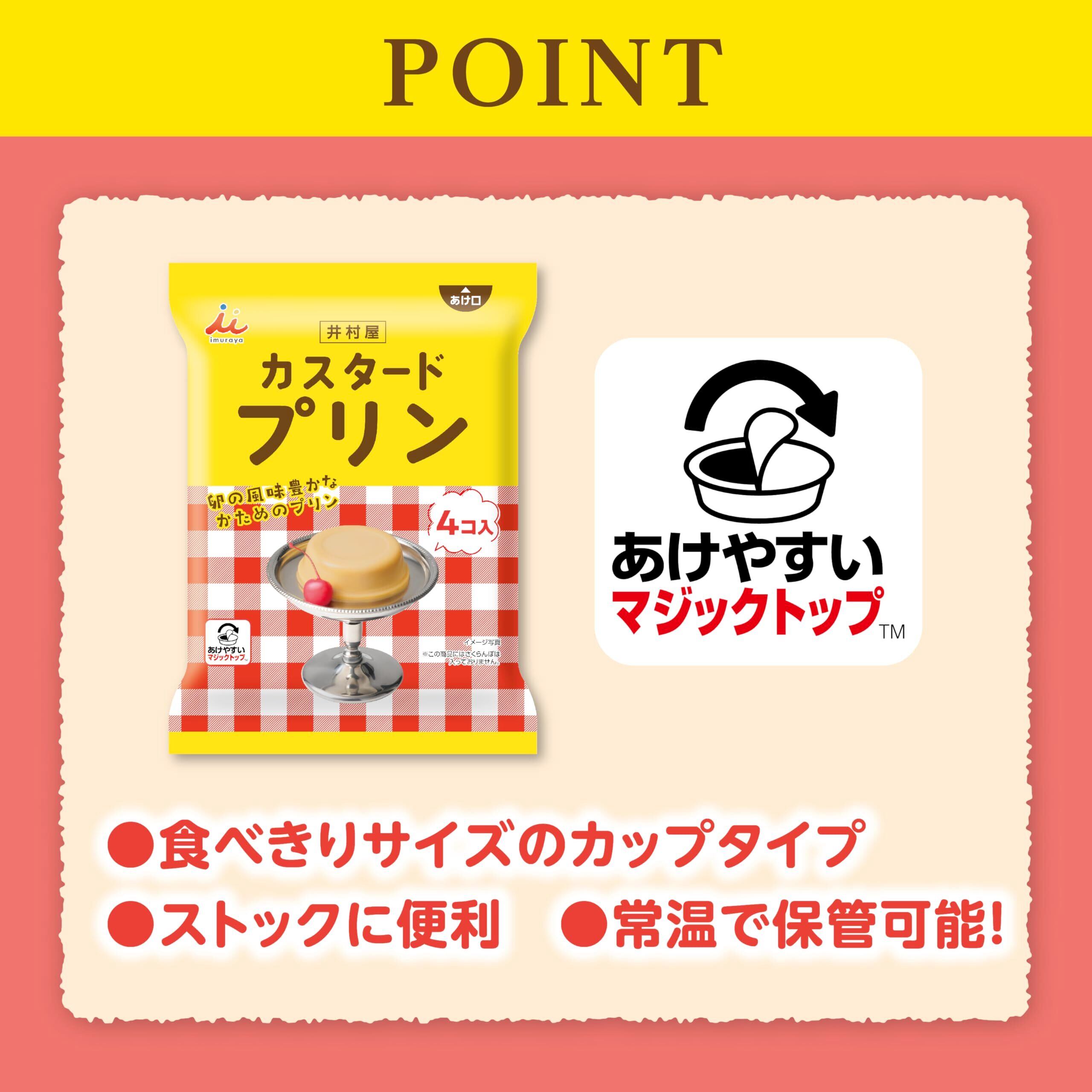 食べたい時に手軽に食べられる、常温で保存可能なプリンです。国産卵の濃厚な風味とコク、レトロ感のある硬めの食感が特徴です。ゲル化剤を使用せず、卵の力で固める昔ながらのこだわり製法で仕上げました。みんなで分け合える4コ入で、子供~大人まで、世代を問わずお楽しみいただけます。パッケージには開けやすいマジックトップを採用し、少ない力で簡単に開封できます。食後のデザート、小腹がすいたとき、甘いものでほっとひと息つきたいときにオススメです。