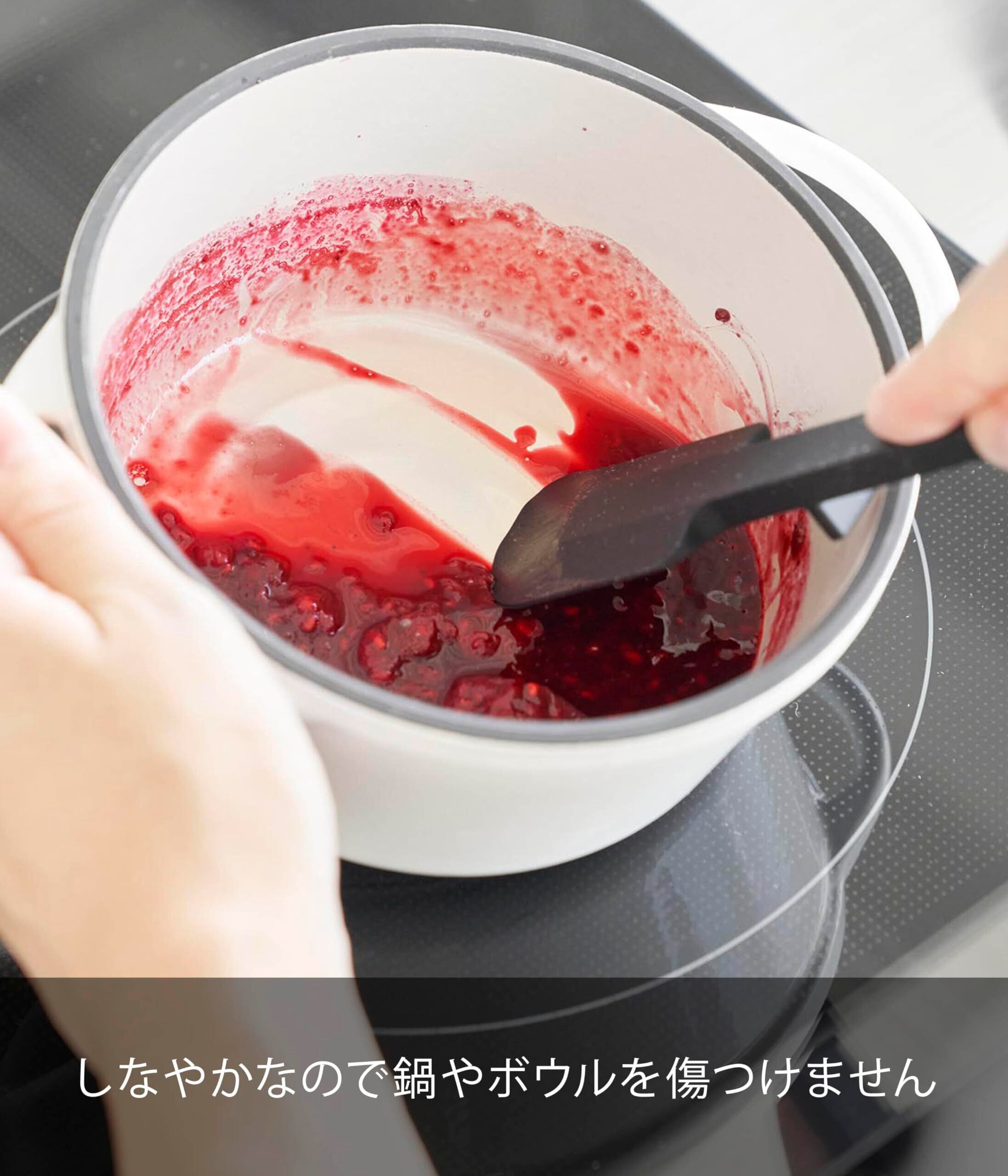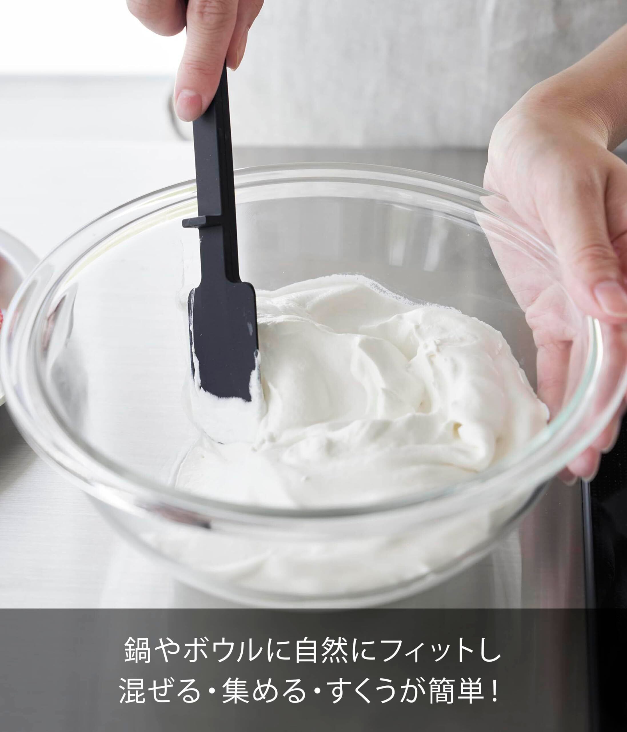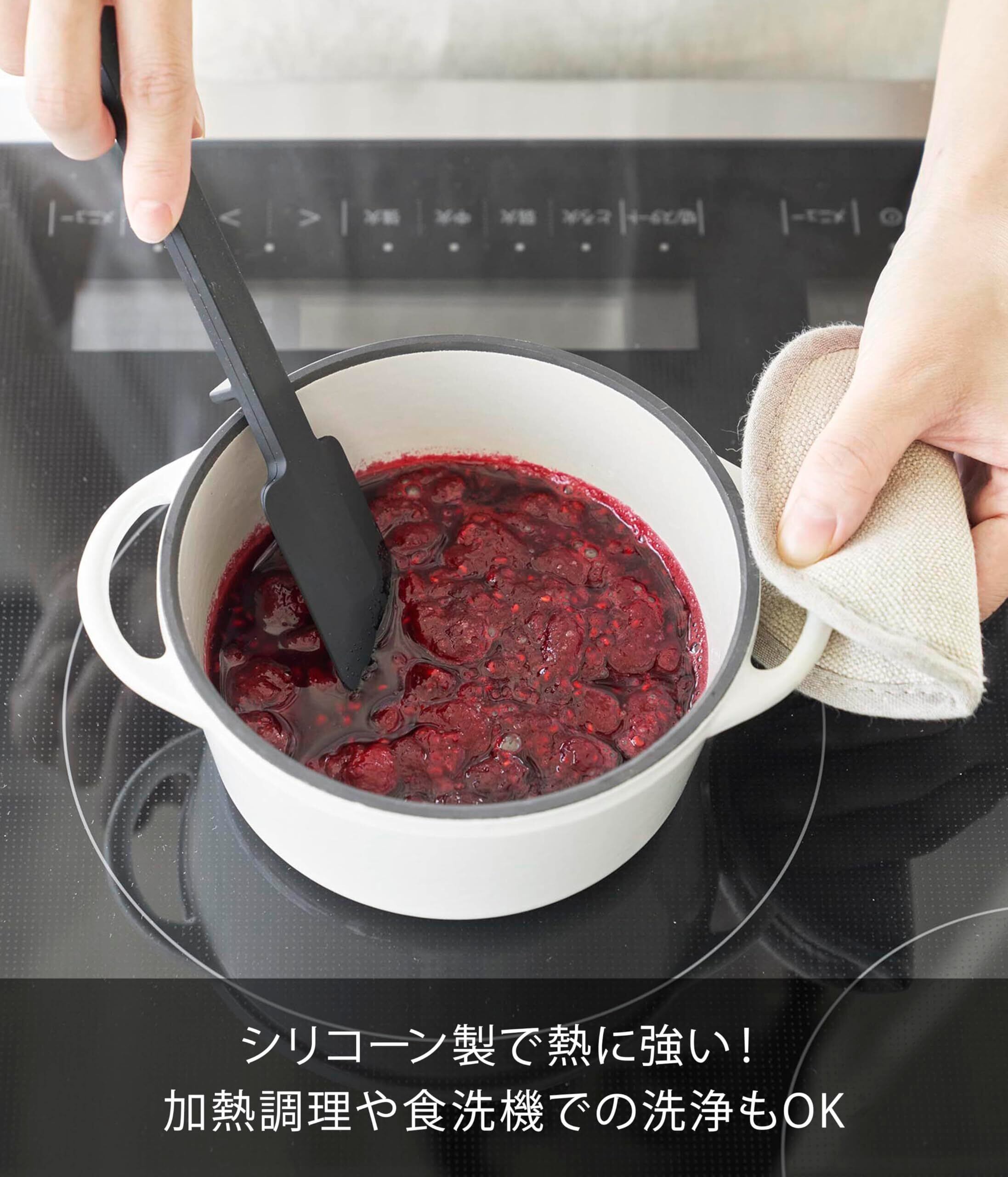 シリコーン製で滑りにくく熱に強い、コンパクトで使いやすいサイズのヘラです。
