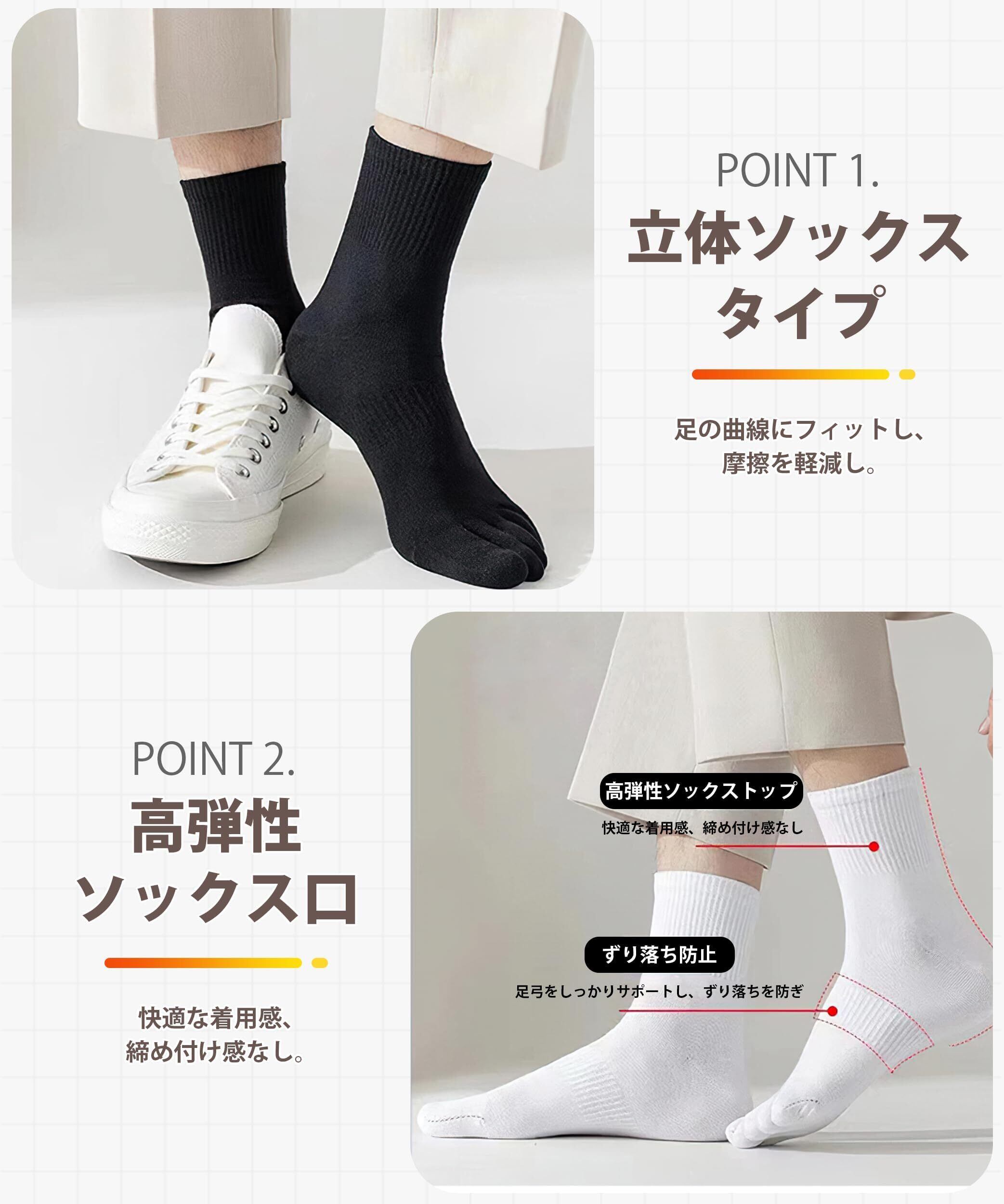 【指の間の摩擦をやさしく減らし・水虫予防にも最適】AOYの五本指ソックスは、指の間の摩擦をやさしく減らし、従来の靴下より足の健康をサポートします。従来の靴下は足の指が擦れ合い、タコや巻き爪の原因になりますが、五本指ソックスは指を分けて摩擦を減らし、足指を守ります。また、AOYの五本指ソックスは脚の指を分けて通気性を高め、汗の蓄積を防ぎ、足の指間の湿気を減らすことで、足の真菌感染(例えば水虫)のリスクも軽減します。足の健康を守るために、AOYの五本指ソックスは日常的に活躍するアイテムとしておすすめです。