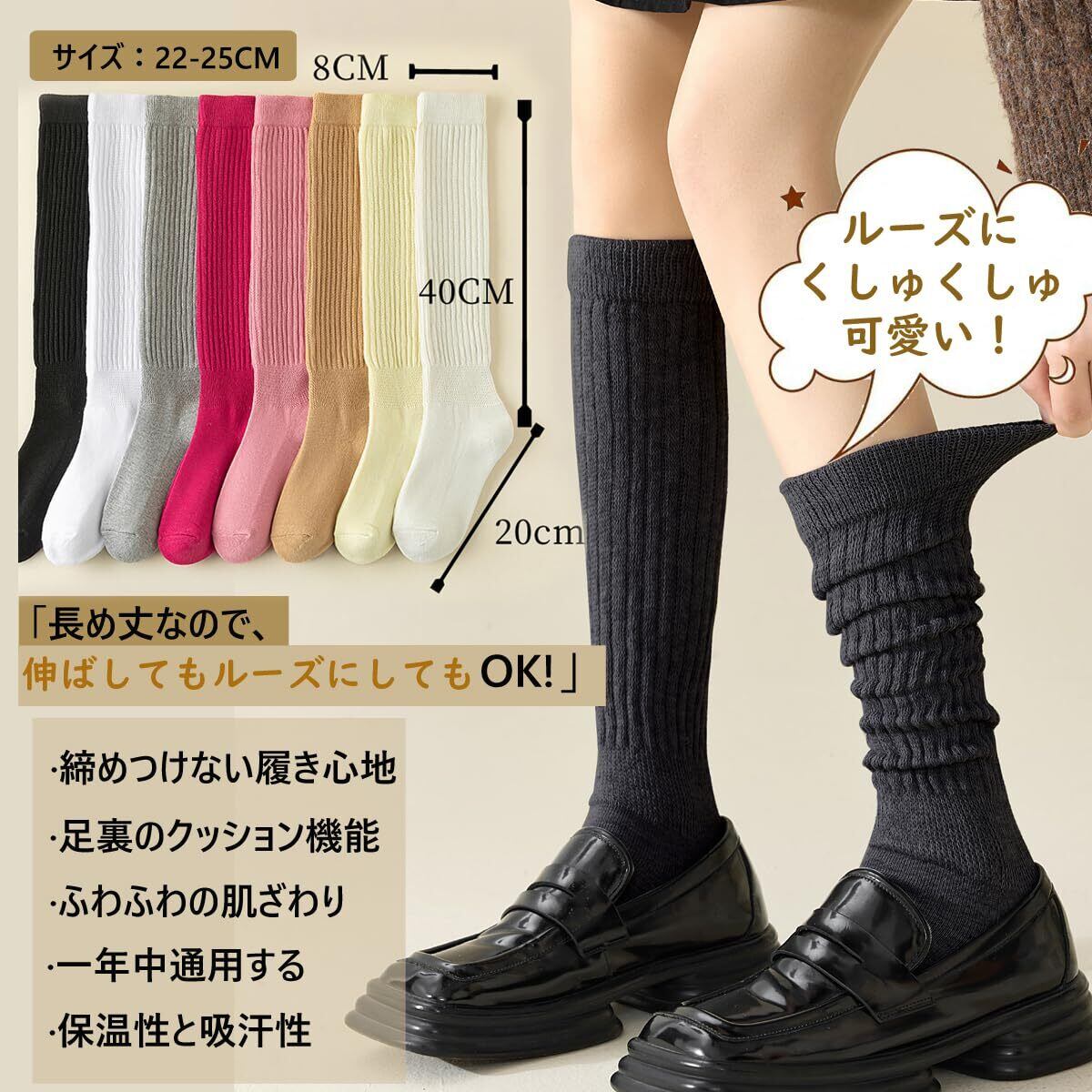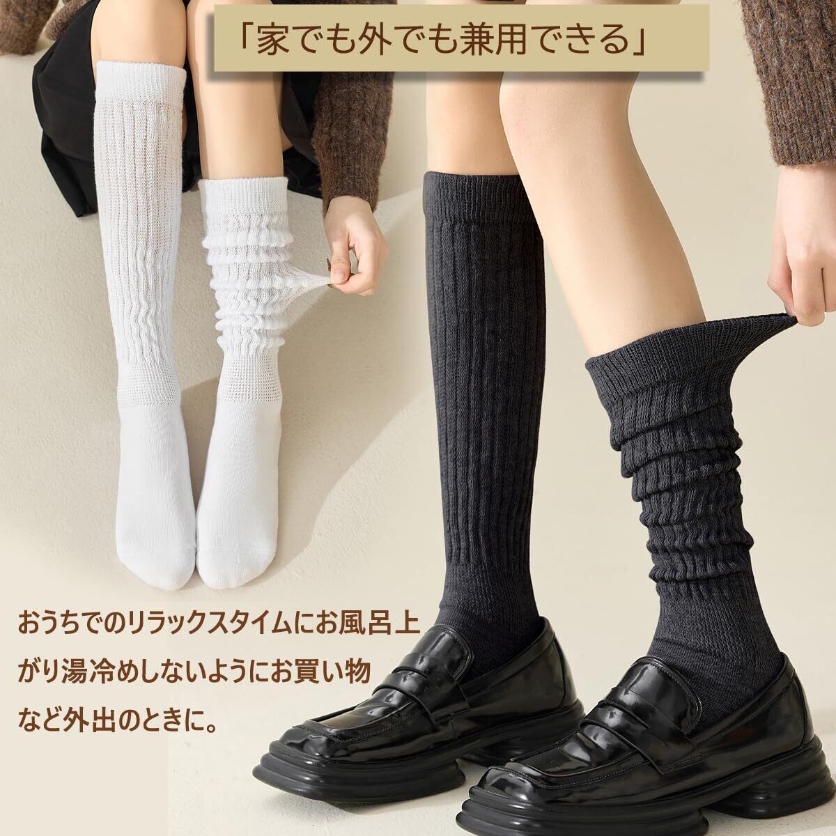 3.ひざ下くらいまで伸びるハイソックスです。ふくらはぎあたりでくしゅくしゅルーズに履いてもOK。自分の好みに合わせて、ルーズソックスとハイソックスを自由に切り替えることができます。【美脚効果】ハイソックスはレッグラインをスッキリ細く魅せてくれるので、美脚と脚長効果抜群だけでなく、足首上の長さが保温効果もあります。可愛いスカートに合わせるのにひざから下の長さ丈脚がすっきり見えると大人気。