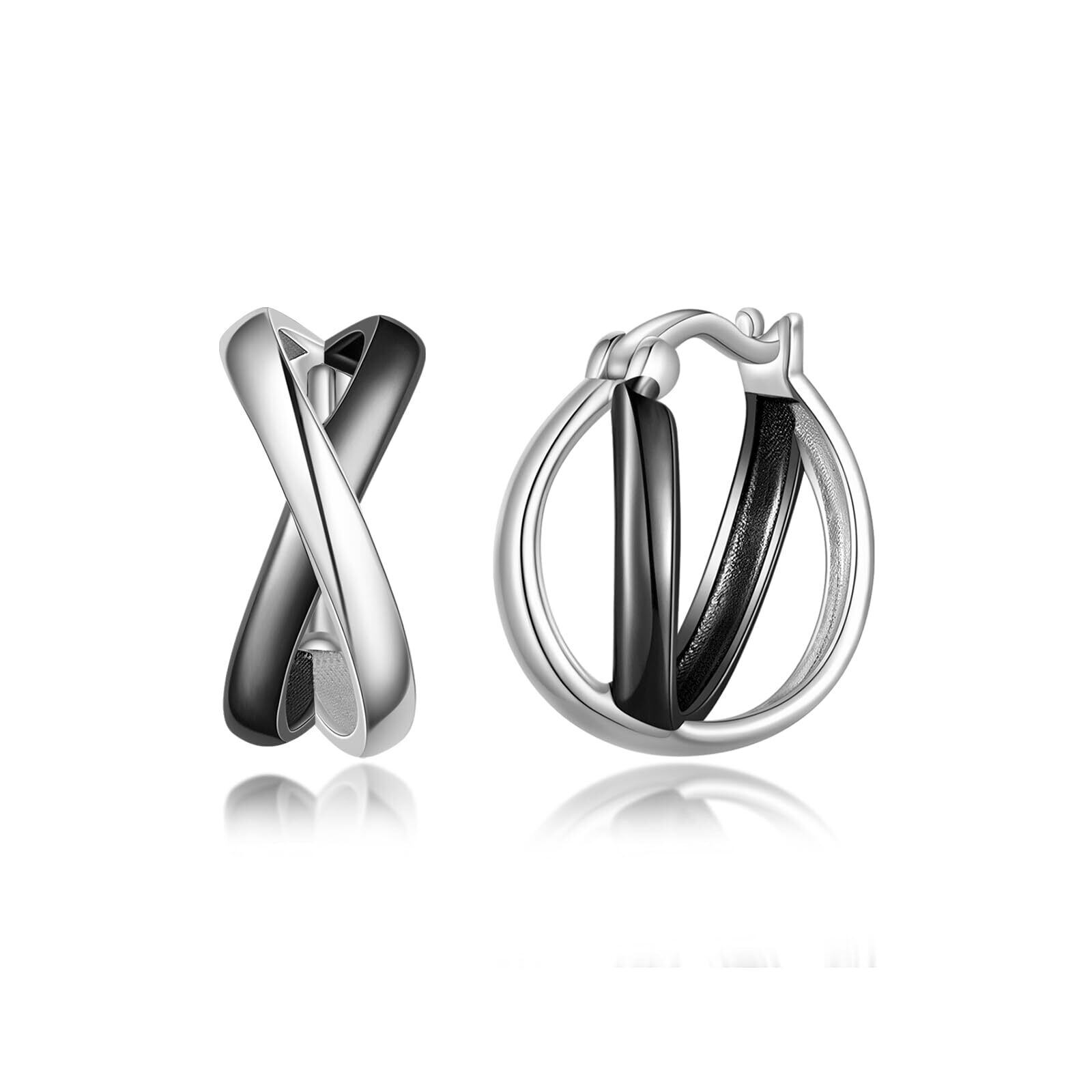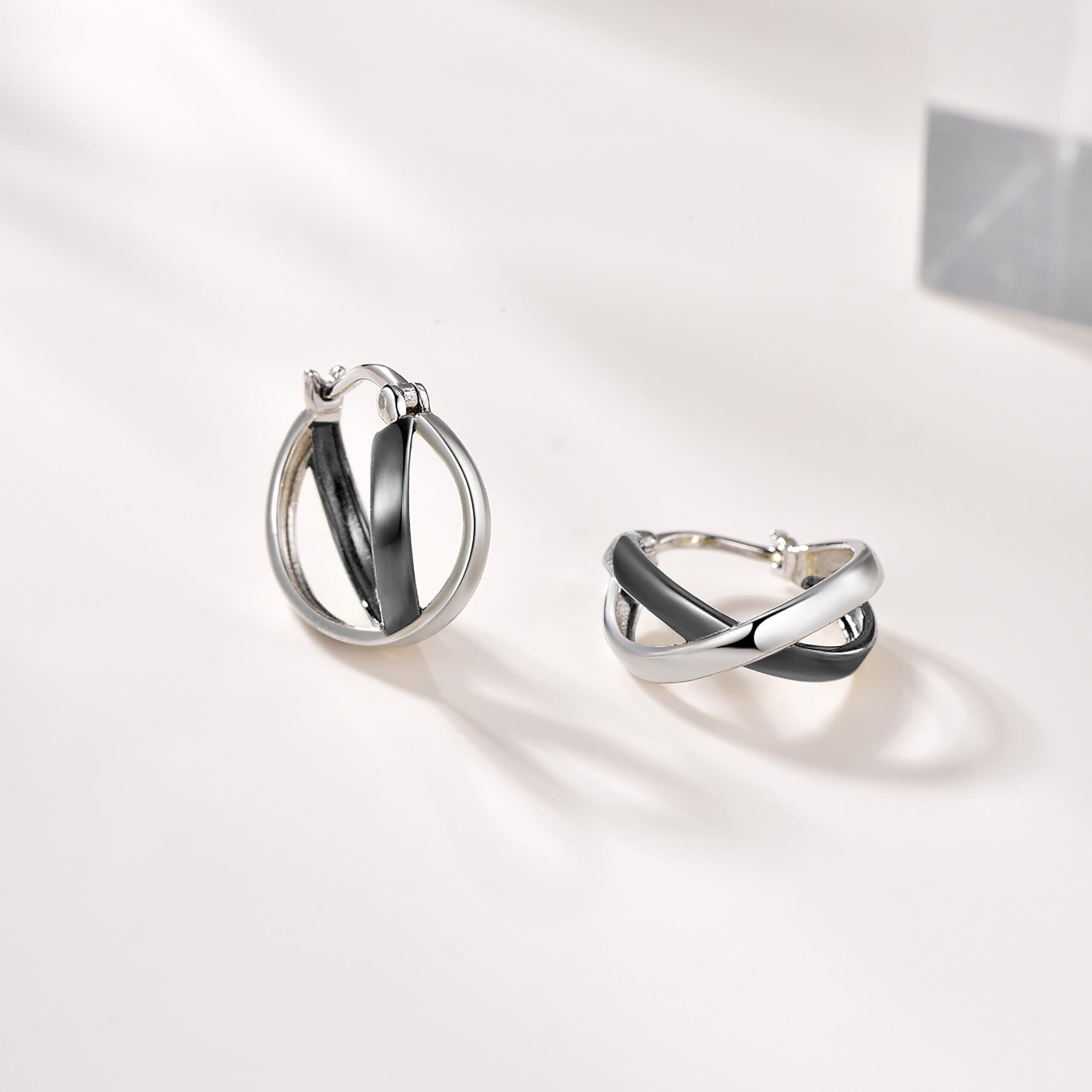 洗練された曲線:シルバーとブラックが描く力強い美——この黒フープピアスは、冷徹なシルバーと重厚なブラックの邂逅をモダンなデザインに昇華。鋭くしなやかな曲線が耳元にクールな風格を刻み、金属の冷たい輝きと黒の圧倒的な存在感が、ビジネスからカジュアルまであらゆるスタイルを引き締めます
