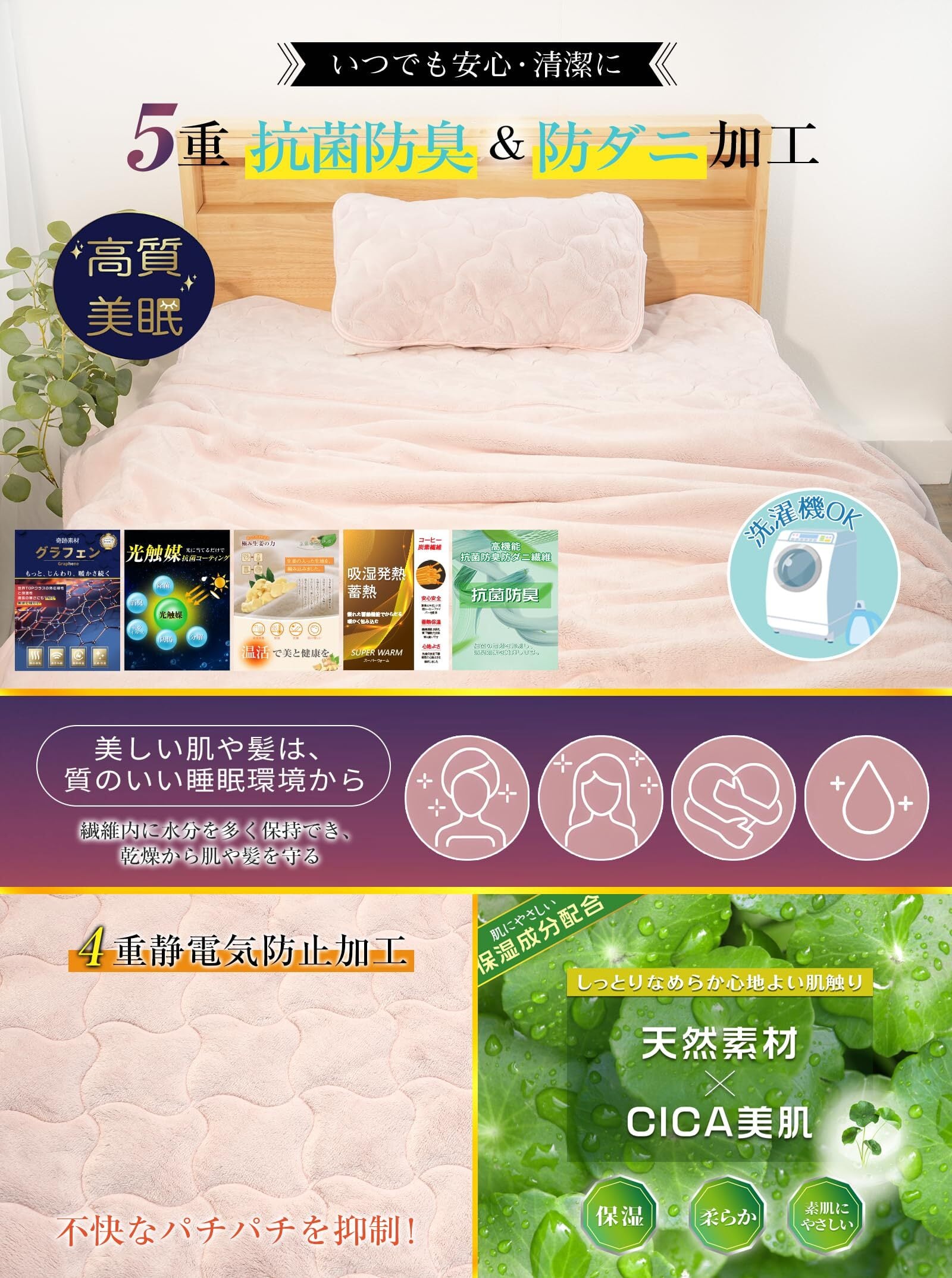 【4重静電気防止×CICA保湿加工で『高質美眠』を実現!】①表生地には導電性繊維が混合されており、静電気によるパチパチ感を軽減させ、ホコリや花粉等が付きにくくなっています。②生地基布に優れた電気伝導性も備えているグラフェン素材を採用。グラフェンを配合した生地は最高レベルの静電気防止性能を実現できます。③放電を促す帯電防止剤を塗布することで、あったか起毛素材に起こりがちなパチパチ感を抑制。④韓国美容でも話題の、肌荒れを防ぐ「天然由来の保湿成分」CICA(ツボクサエキス)を配合することで、繊維内に水分を多く保持でき、保湿効果を高めています。睡眠時の摩擦や乾燥から肌や髪を守り、お肌のケアと良質の睡眠を同時にかなえることができます。洗濯を繰り返しても効果は持続。