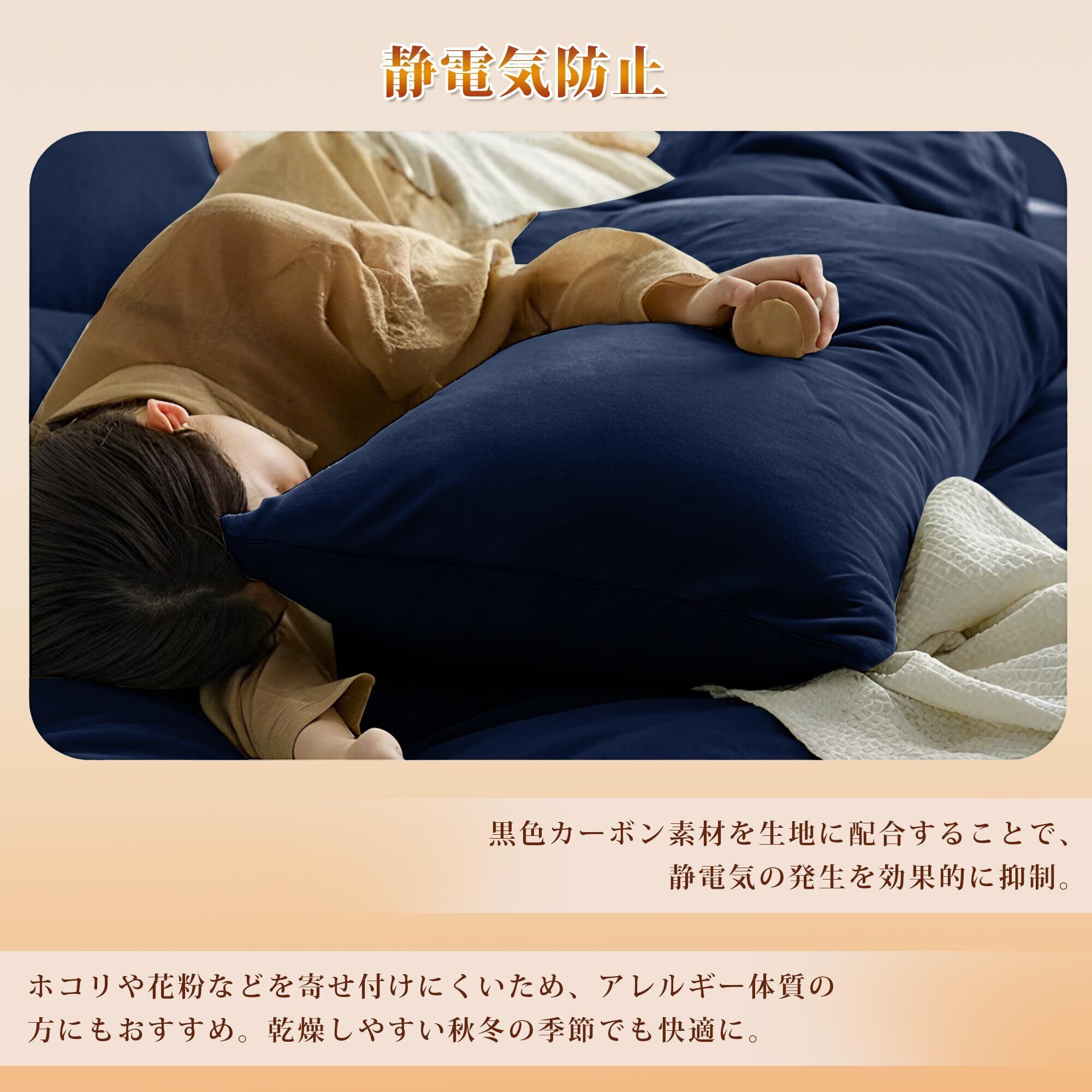 【静電気防止加工済み】カーボン糸を織り込み、パチパチする静電気を抑制。お肌や髪の毛へのダメージを軽減し、快適な睡眠をサポートできます。