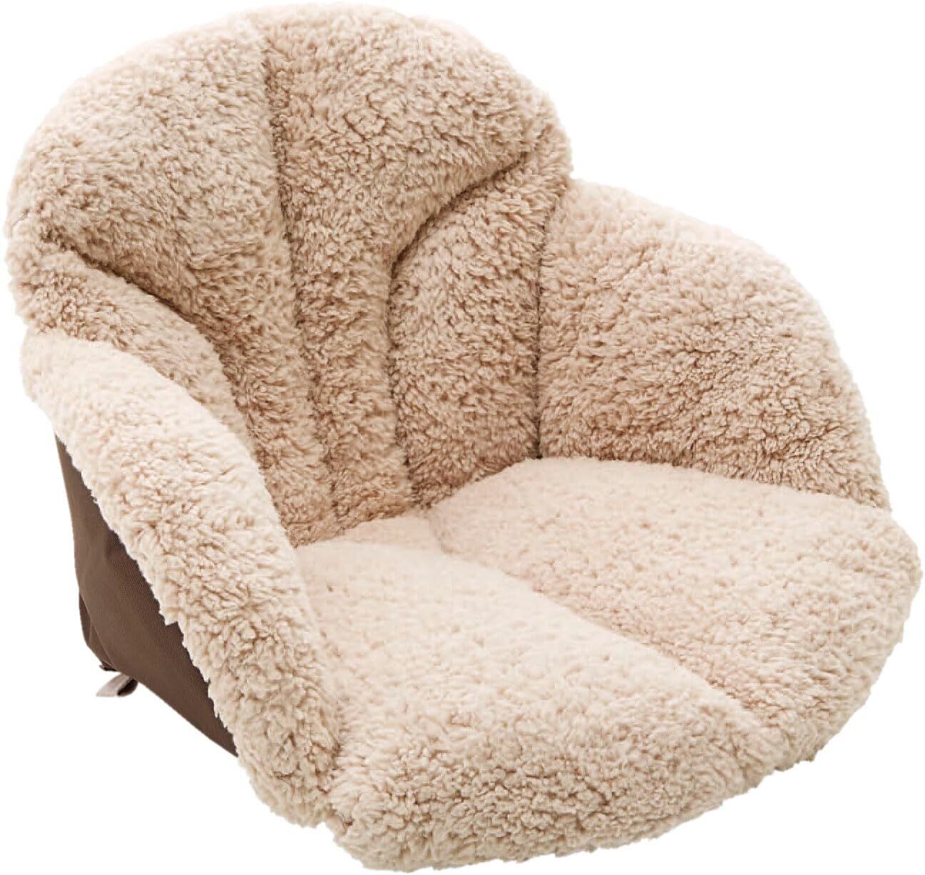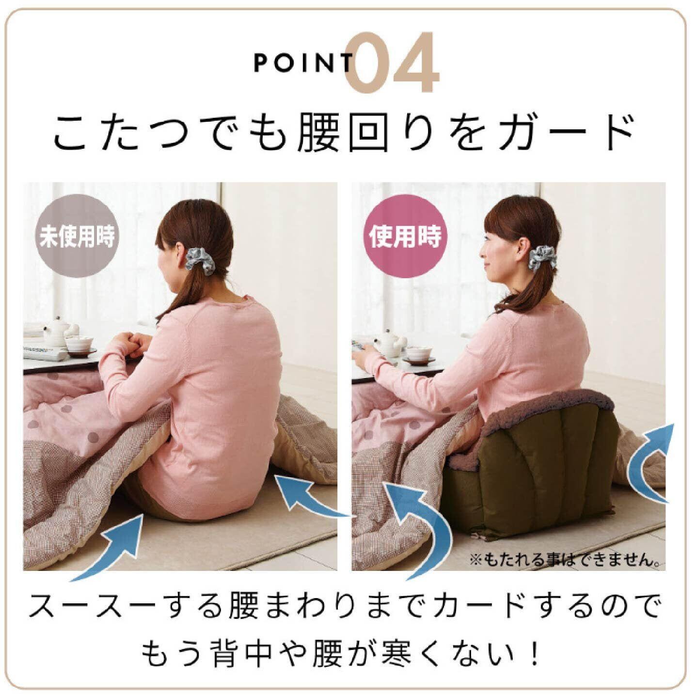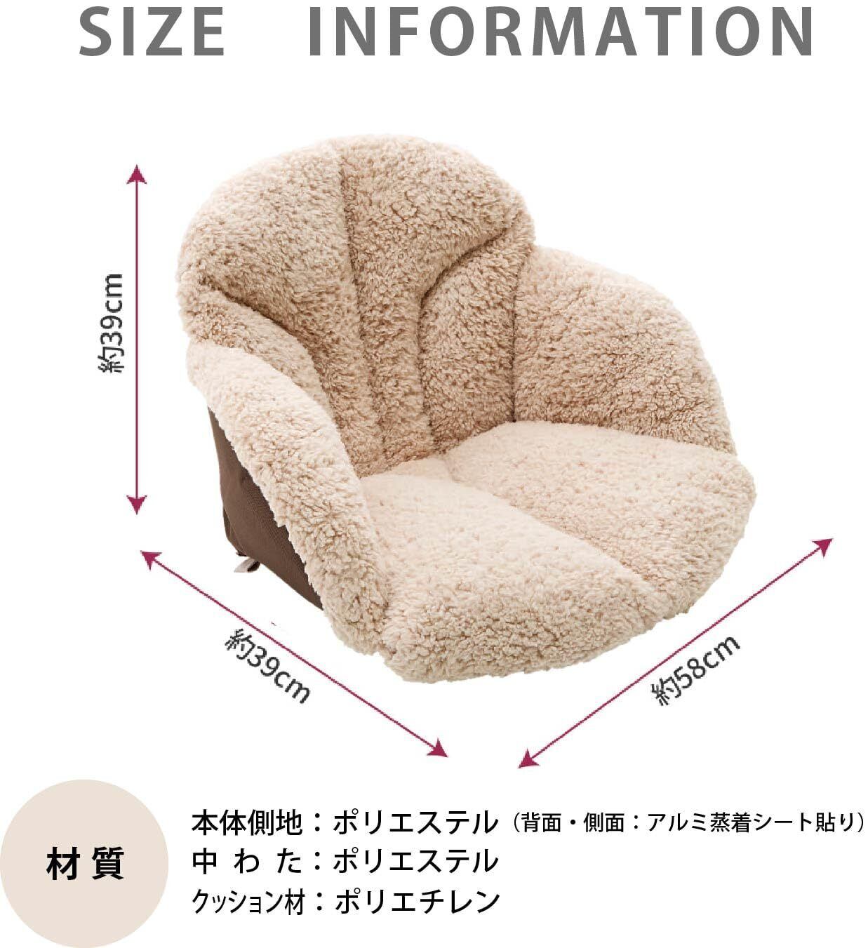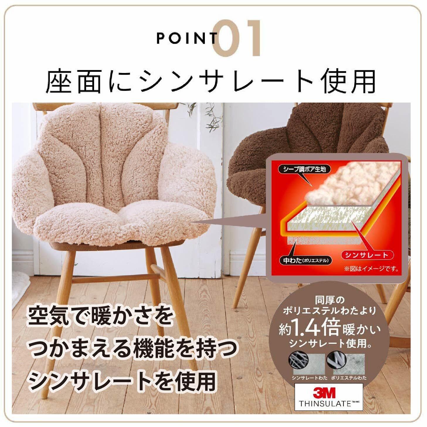 ふわふわ毛布で包み込んで腰・背中ぬくぬく。 座面に同厚のポリエステルわたより約1.4倍暖かいシンサレート使用。 空気で暖かさをつかまえる。