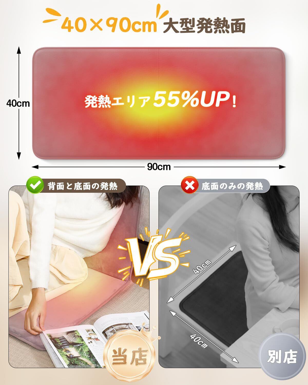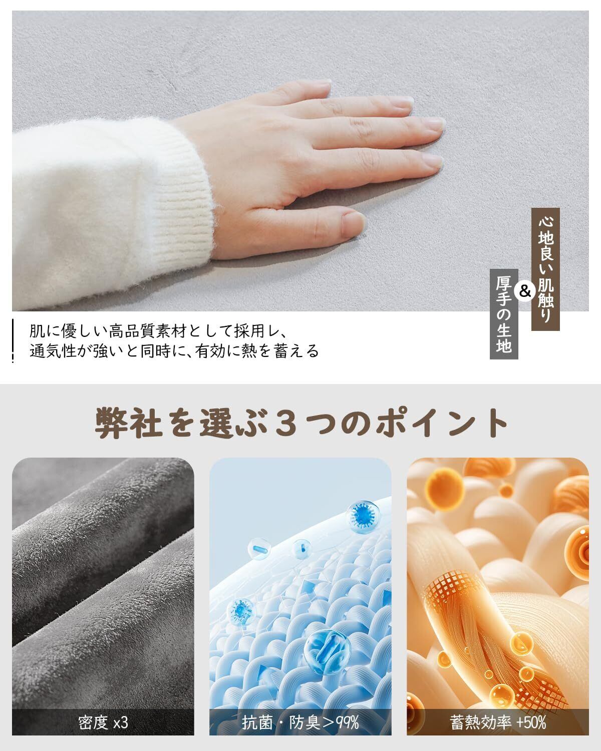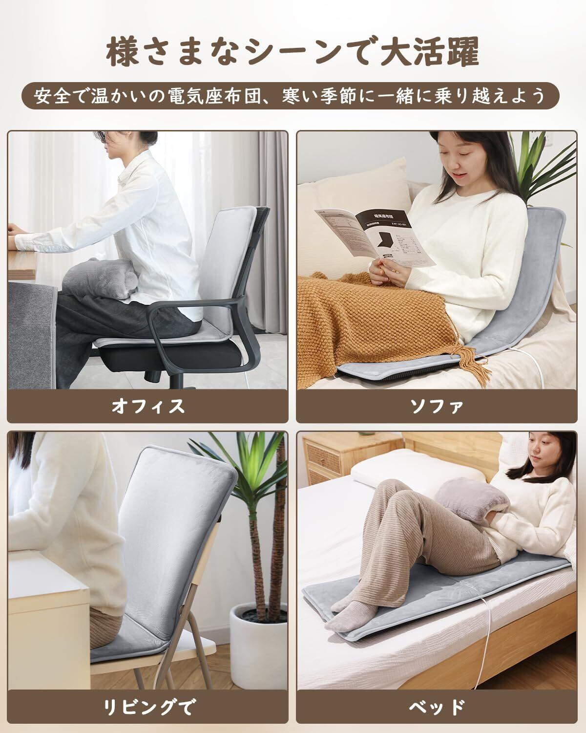 【肌に優しい高品質素材】通気性に優れた特殊編み生地は、極上の肌触りとへたりにくい耐久性を両立。内側と外側の高強度断熱層が熱リスクを二重にガードする、6層構造の軽量設計です。どこでも、何にでも使える柔軟性が魅力。 オフィスでは椅子のマットに、リビングでは足元ヒーターに、寝室ではひざ掛けに。柔らかく折りたたんでも跡が残らず、押し入れやリュックにもすっきり収納できます。家族の日常はもちろん、大切なペットのくつろぎスペースとして、また温もりを贈る季節のご挨拶にも最適な、一枚で多役をこなす理想的なホットマットです。