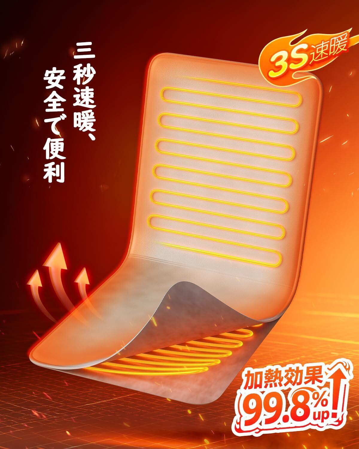 【3秒高速発熱 & 9段階温度調節】わずか3秒で春の日差しのような温もりが広がる「高速発熱」を実現します。座面と背もたれのダブル発熱構造が、40cm×90cmの広いエリアをムラなく温めます。21℃から45℃まで細かく調整できる9段階温度調節で、朝の忙しい時間も、夜のくつろぎタイムも、あなたにぴったりの温かさをお届けします。