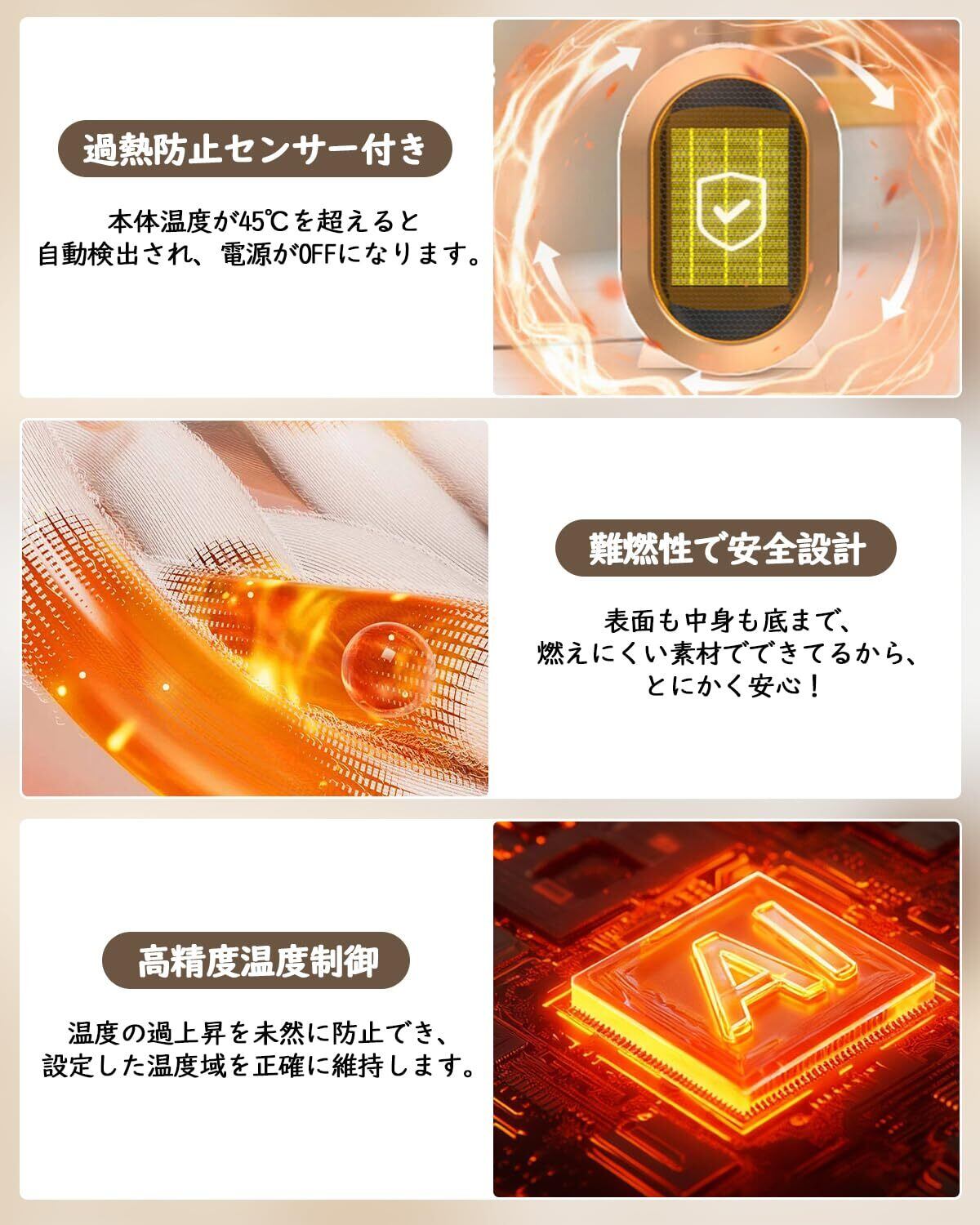 【最高水準の安全設計】当社製品は日本のPSE認証を取得済みであり、その安全基準を大きく上回る設計思想を実現しています。第一の安全層として、過熱を感知すると即座に電源を遮断する「温度異常感应装置」を内蔵。第二の安全層では、万一に備えた物理的な「二重独立ヒューズ」が最後の砦となります。この二段階システムにより、一部過熱や内部異常が発生した場合でも、多重防御で確実に安全を確保します。さらに発熱部には素材劣化を抑える特殊設計を採用し、基盤から難燃材料を使用。PSE認証の要求を満たすだけでなく、小さなお子様がいるご家庭でも、就寝時の長時間使用でも、見守られているような安心感の中でゆったりとした温もりをお届けします。