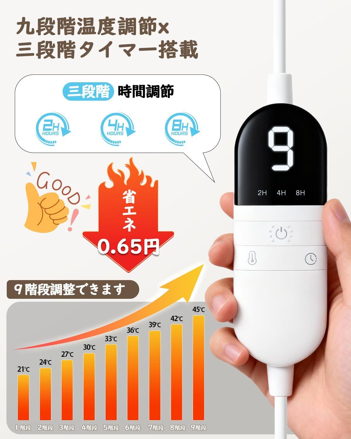 【進化型タイマー&スマート節電設計―集中もくつろぎもこれ1台で】作業や就寝に合わせて2、4、8時間の自動オフタイマーを選べ、消し忘れを完全防止。電源/タイマーボタンの長押しですぐ起動でき、暗い中でも直感的に操作可能です。さらに、超低消費電力(※1時間約0.65円)を実現します。高効率発熱で暖かさを保ちながら、従来の暖房器具と比べて圧倒的な省エネ性を発揮します。集中したいオフィスワークにも、安心して寛げるリビングタイムにも、時間と電気代を節約するスマートな温もりをお届けします。