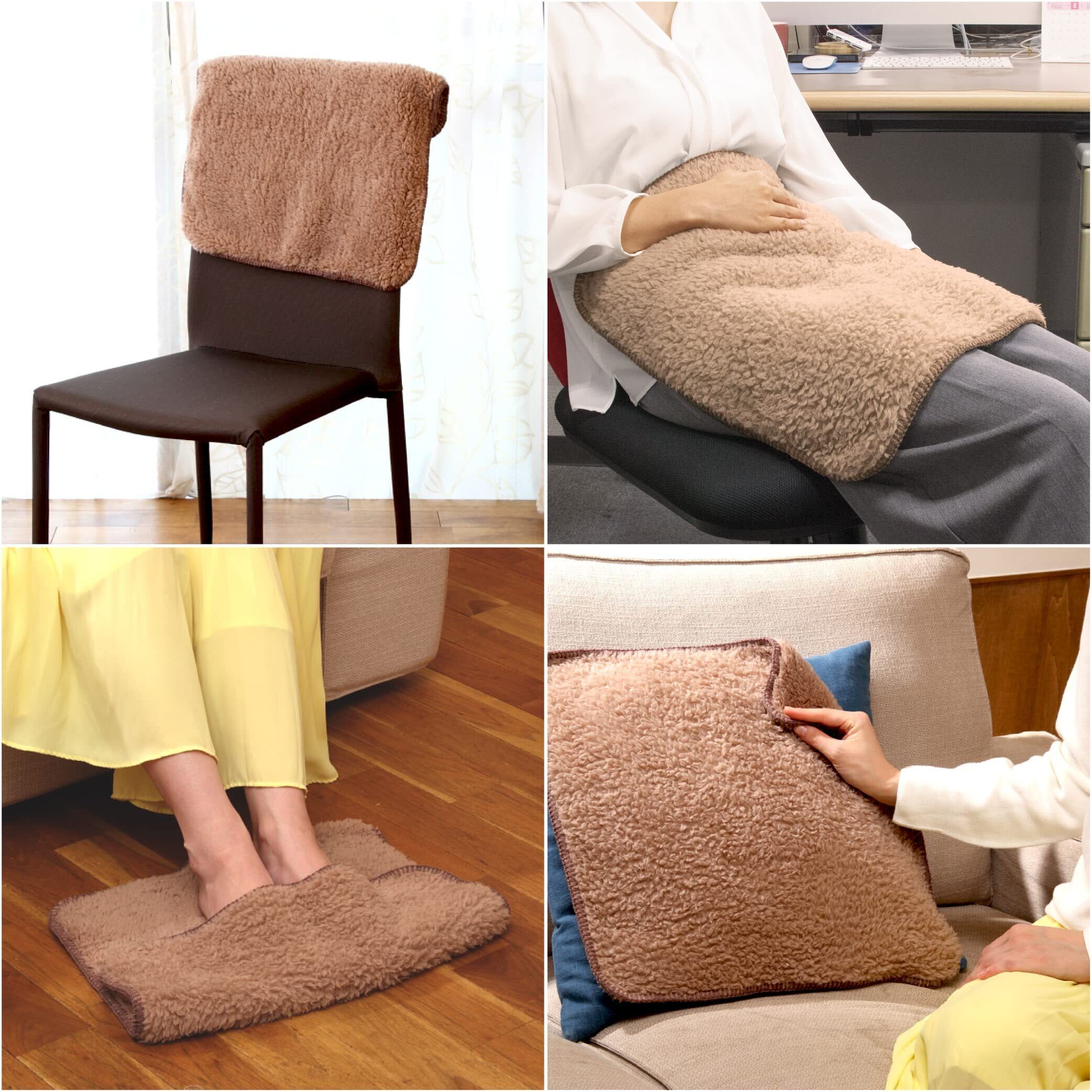 秋冬は防寒具の1つとして、春夏は肌寒いときにサッと取り出して。座面に敷く以外にも使い方いろいろ。ひざ掛けに、背もたれに、お腹に・足元に・クッションカバーに。