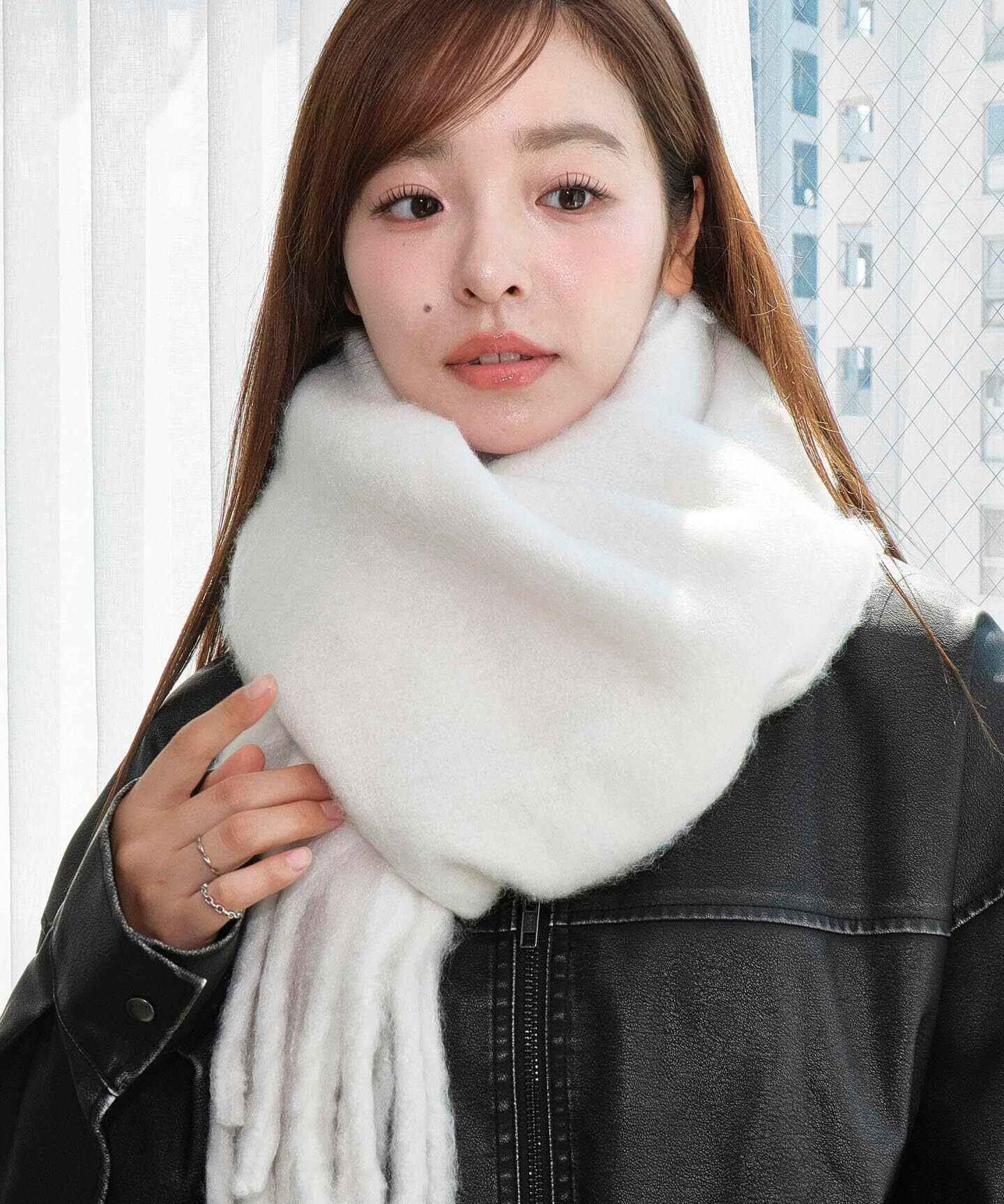 ボリューム感たっぷりのサイズで、首に巻くのはもちろん肩にかけるスタイルもできる万能ストール