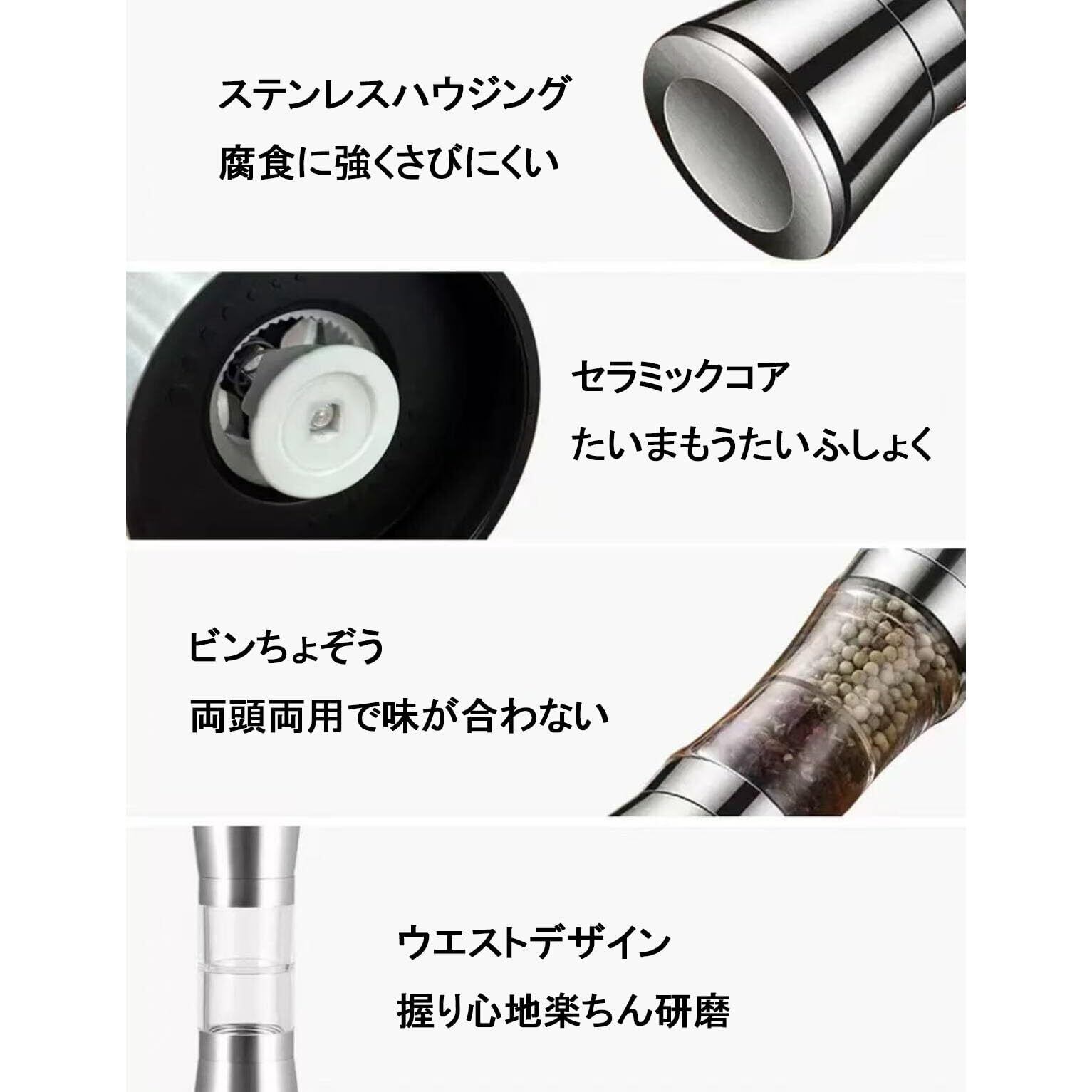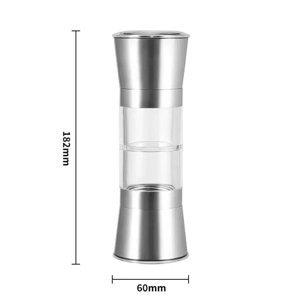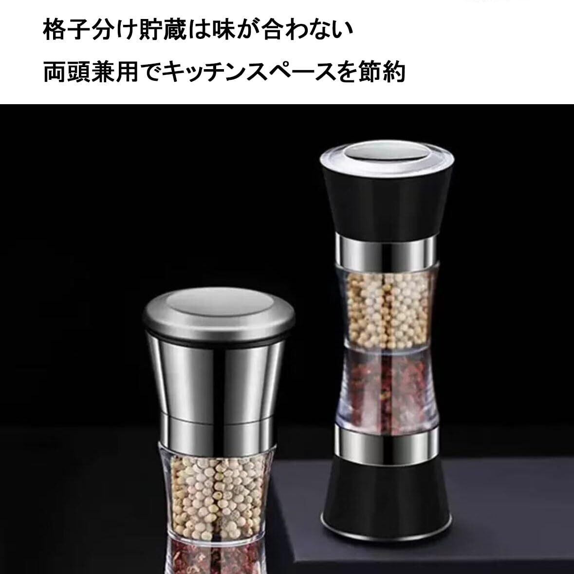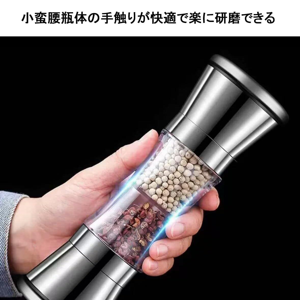 ペッパーミル 手動 両頭用 スパイス用 粗さ調節 胡椒 ソルト 岩塩 結晶塩 調味料入れ 透明 ふた付きステンレス鋼 操作簡単 分解洗浄 キッチン用品