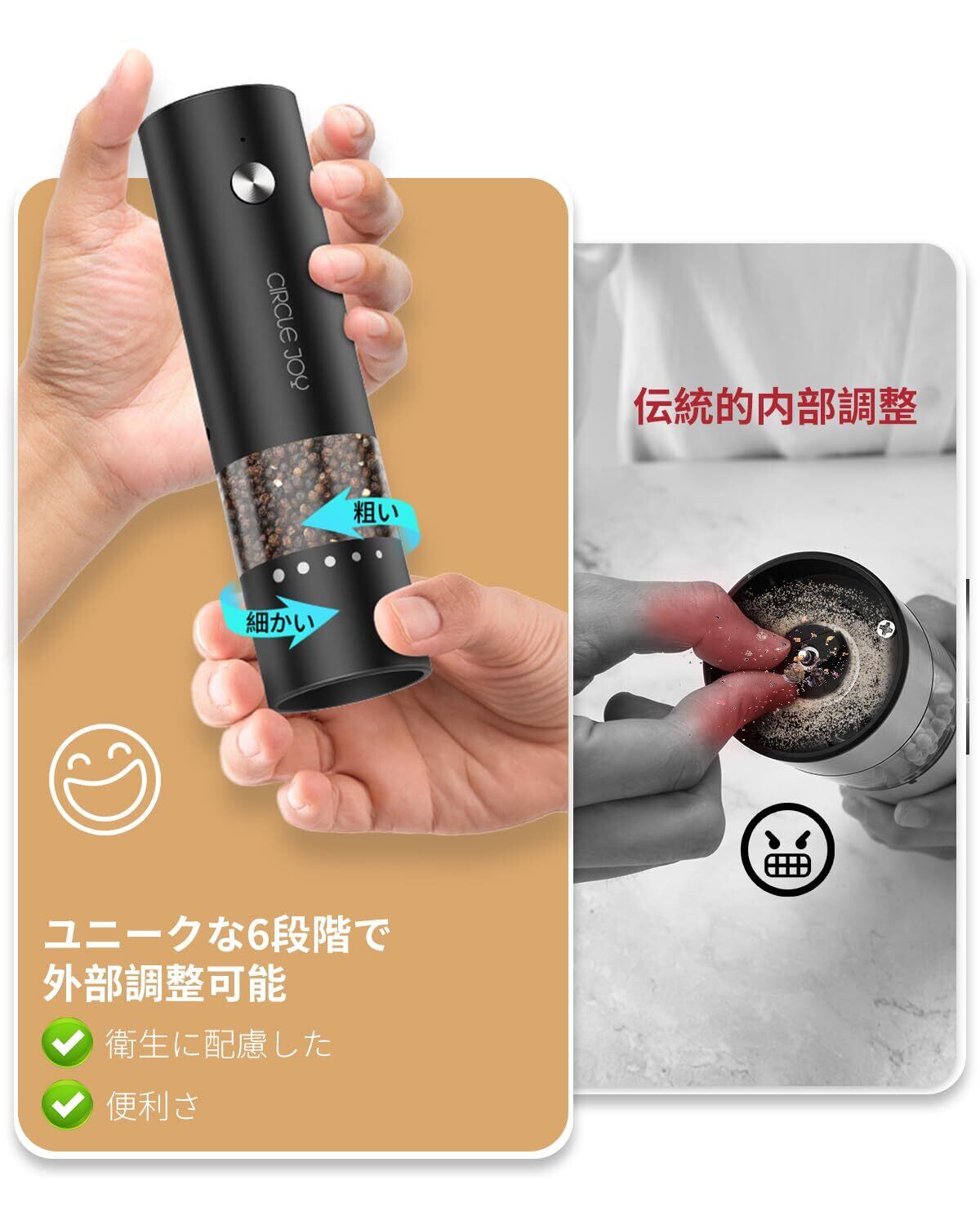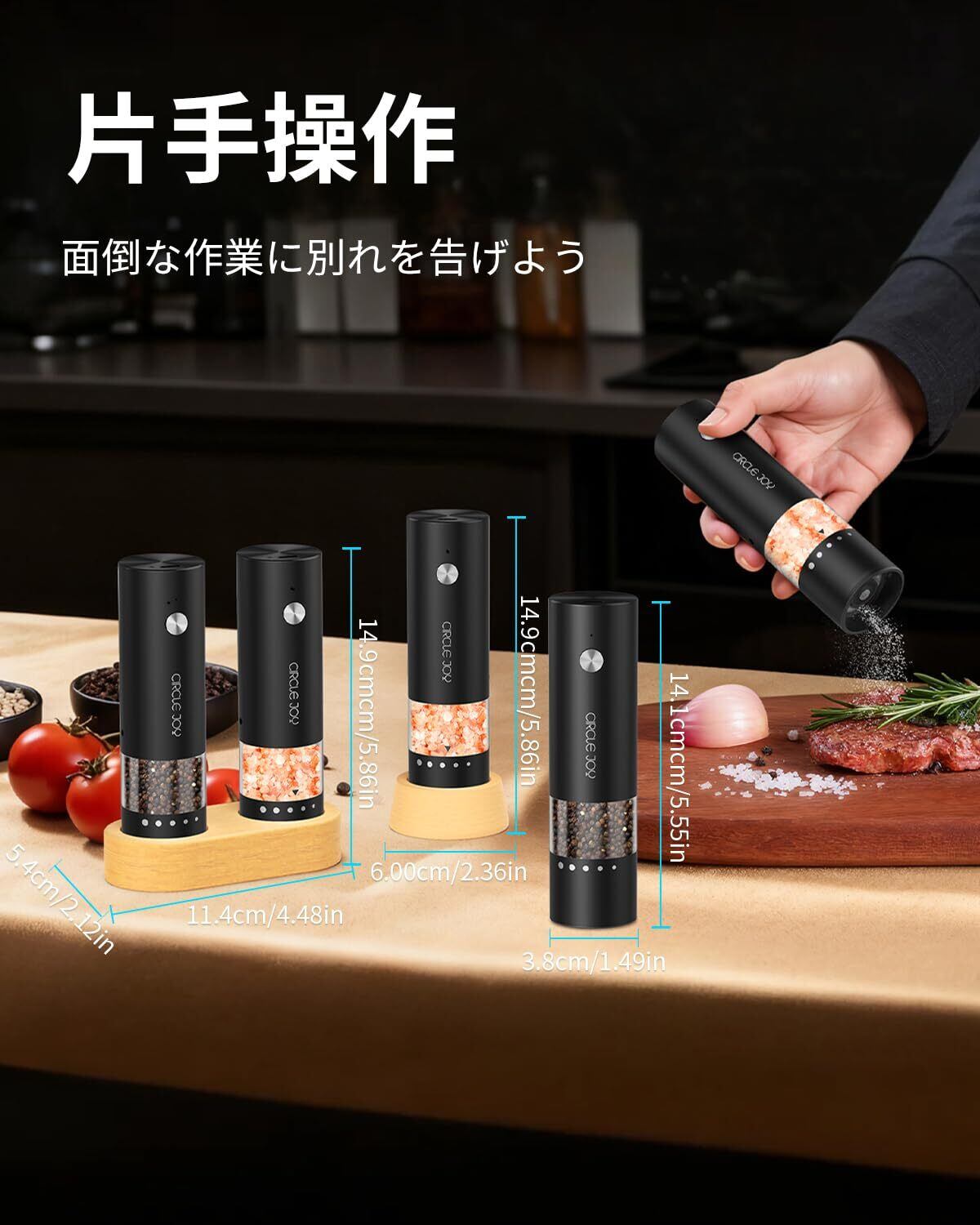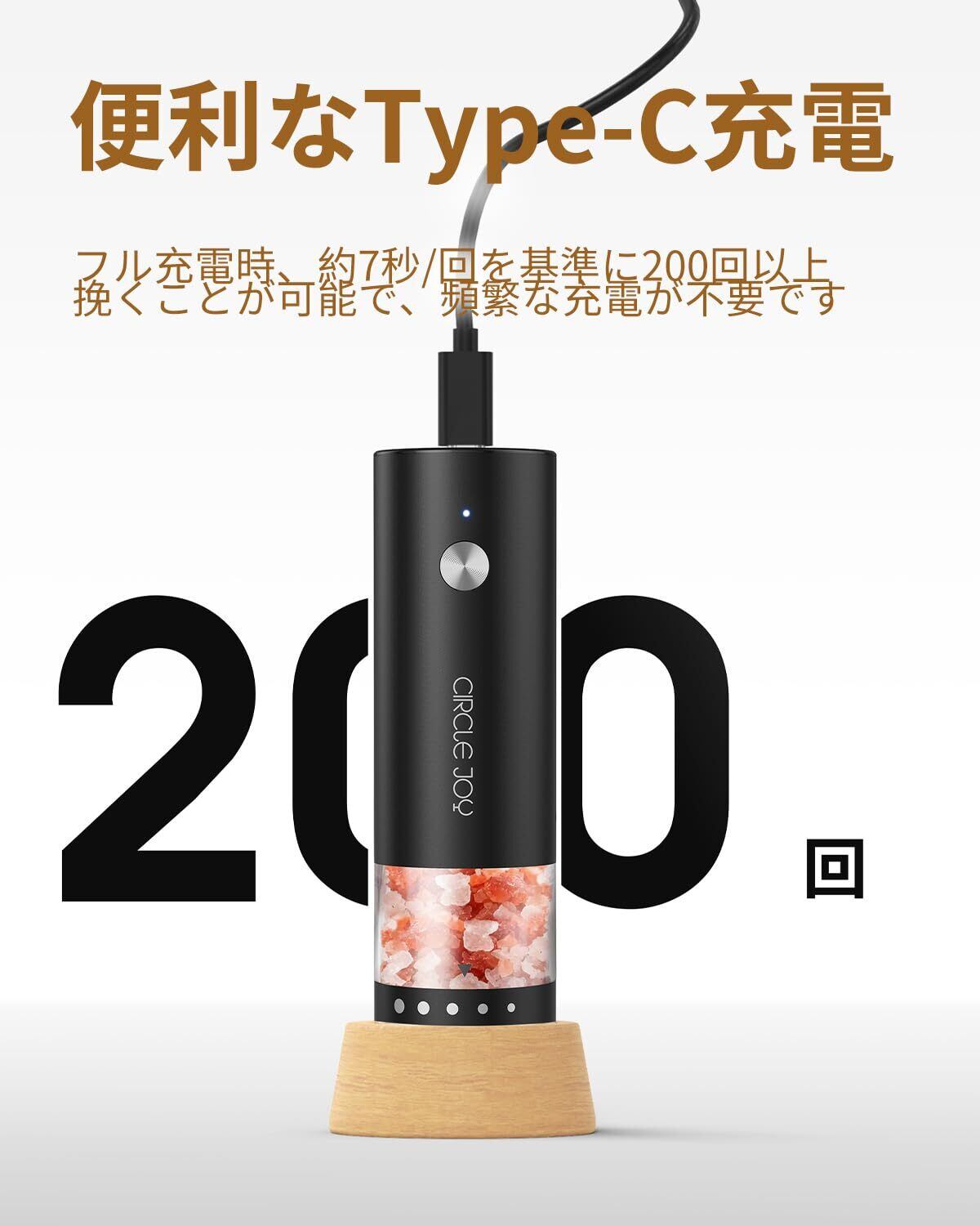 CIRCLE JOY 小型 充電式ペッパーミル 電動 ステンレス製ペッパーミル 厚さを外部で調整する 30ml容器 木製収納ベース ミニサイズ ブラック