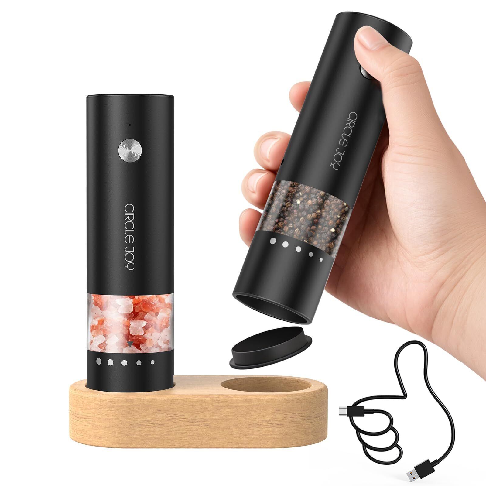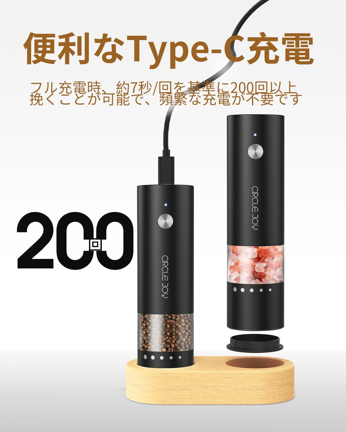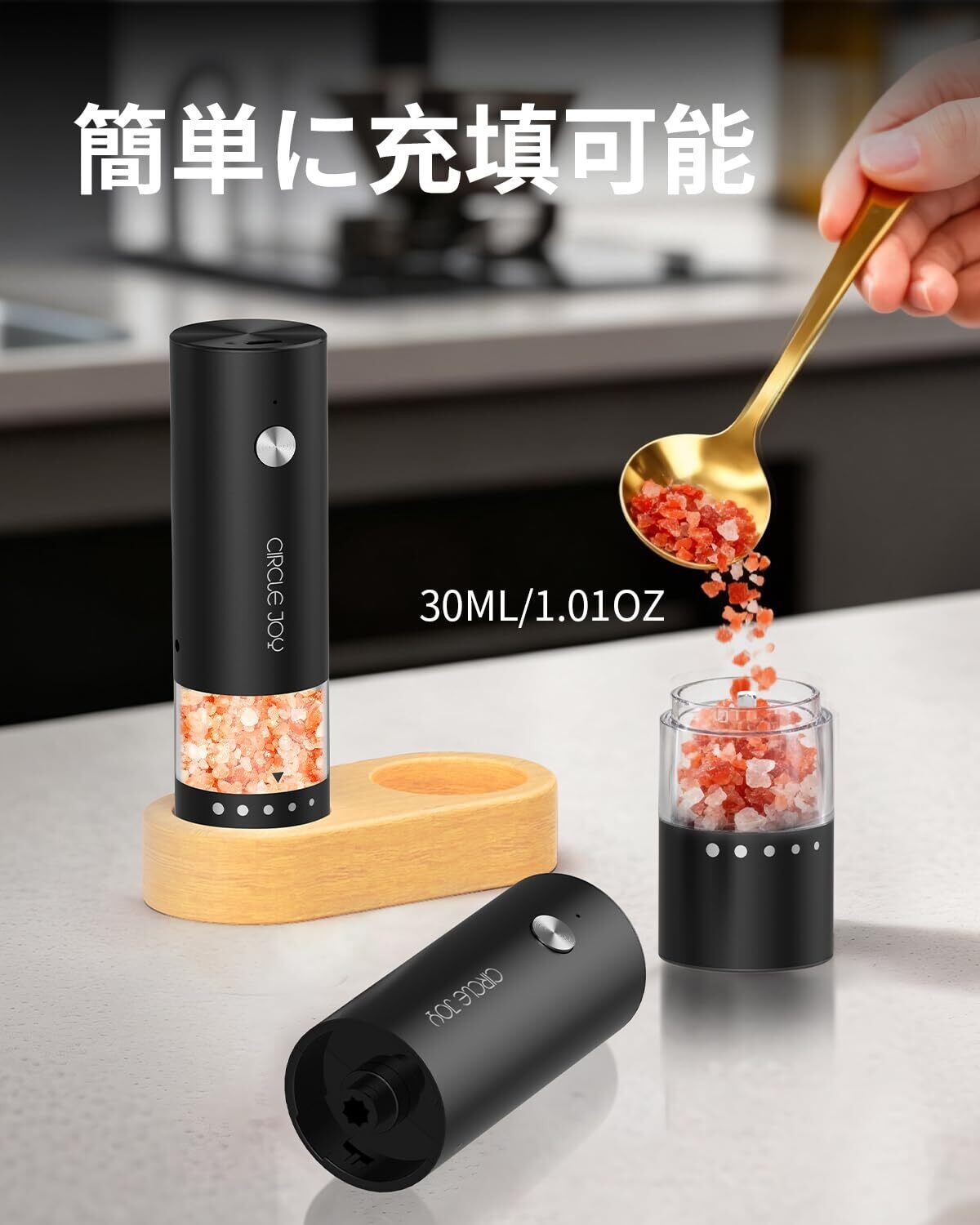 CIRCLE JOY 小型 充電式ペッパーミルセット 電動 ステンレス製ペッパーミル 厚さを外部で調整する 30ml容器 木製収納ベース 2本セット ミニサイズ ブラック