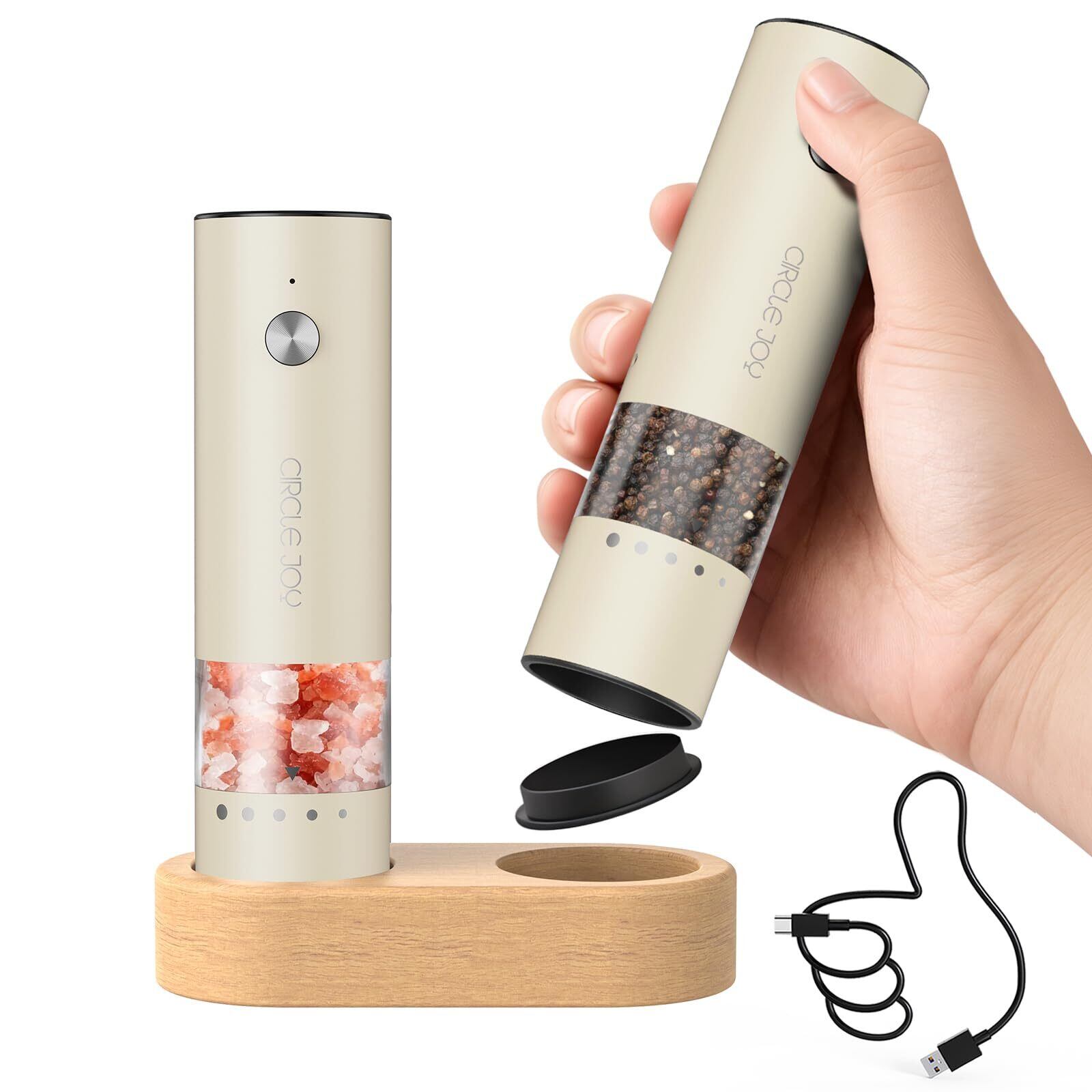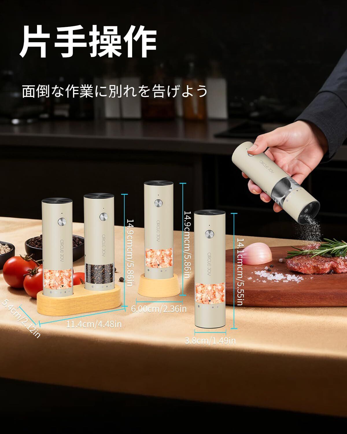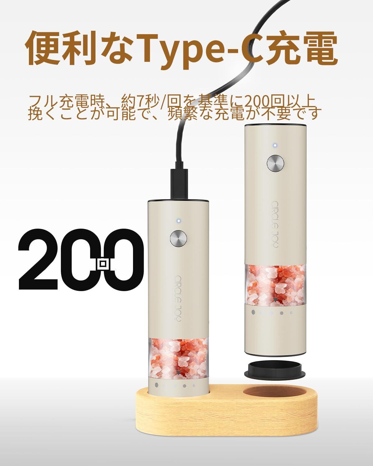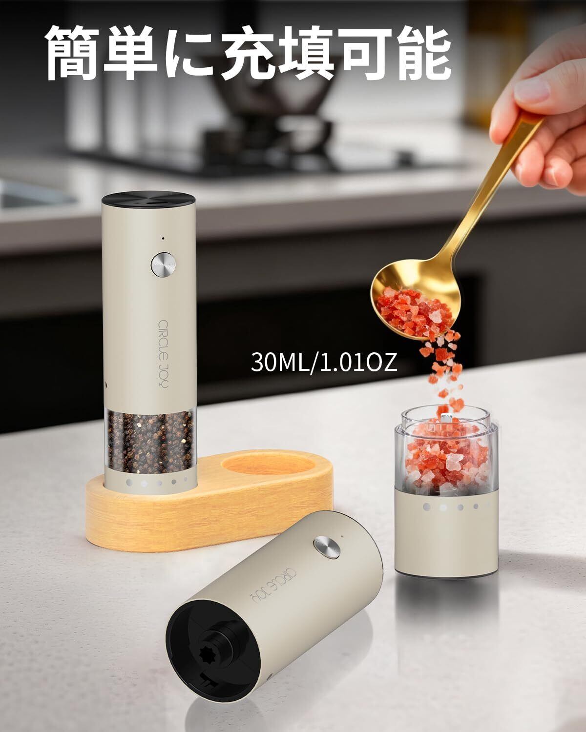 CIRCLE JOY 小型 充電式ペッパーミルセット 電動 ステンレス製ペッパーミル 厚さを外部で調整する 30ml容器 木製収納ベース 2本セット ミニサイズ ベージュ