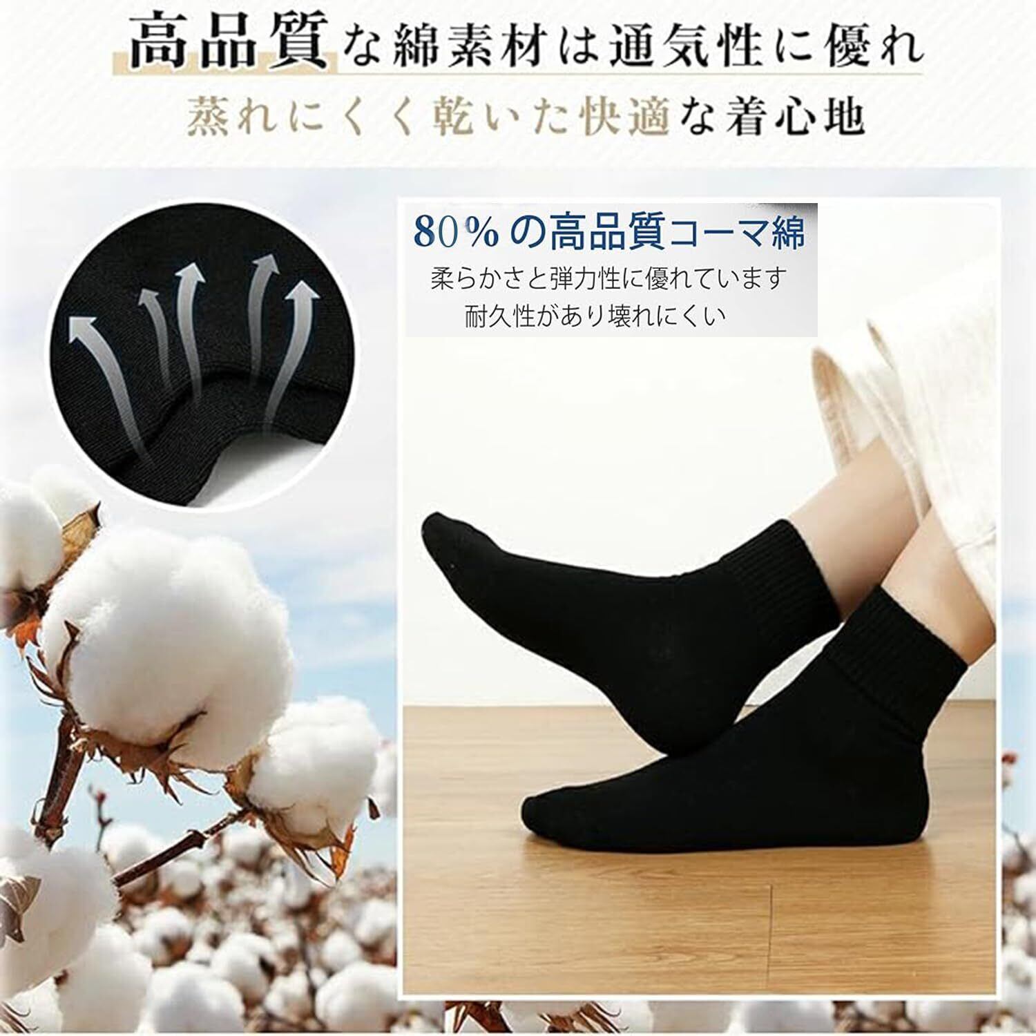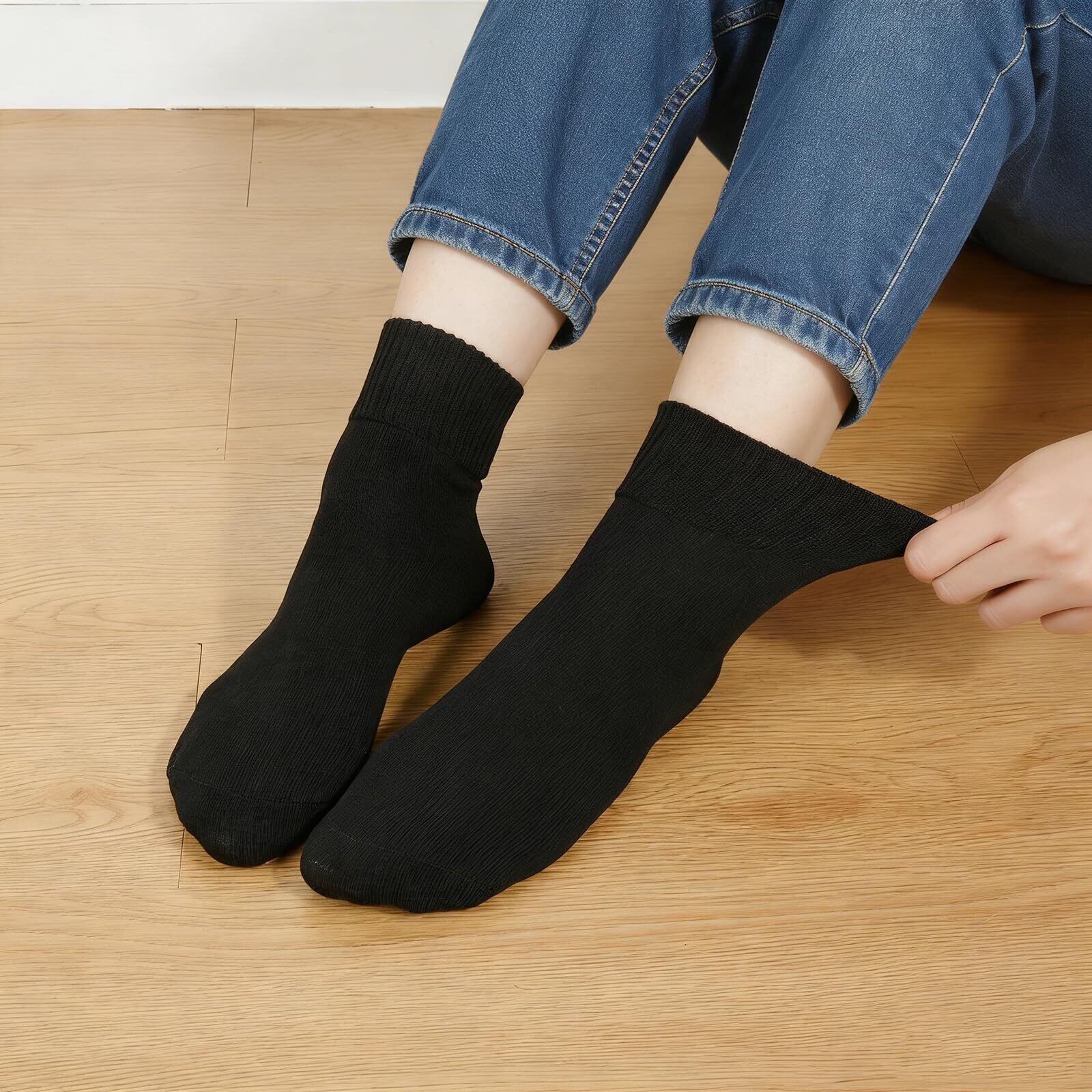 【綿履き口ゆったりソックス レディース】:この黑靴下レディースは通気性が高く履き心地の良い綿素材のため、蒸れを防いで素足をやさしく包み込む防寒ソックスです。〇弾力ゴムを利用したリブ編みタイプの履き口なので足首はゆるゆるで締め付けない程度のしっかりフィットな履き心地です。綿80%を使用したオールコットンソックスなので、生地は滑らかで、柔らかく、密度が高く、収縮せず、変形せず、耐久性があり、一度履いたらクセになる!ズレ落ちないカジュアルな黑のお洒落靴下。