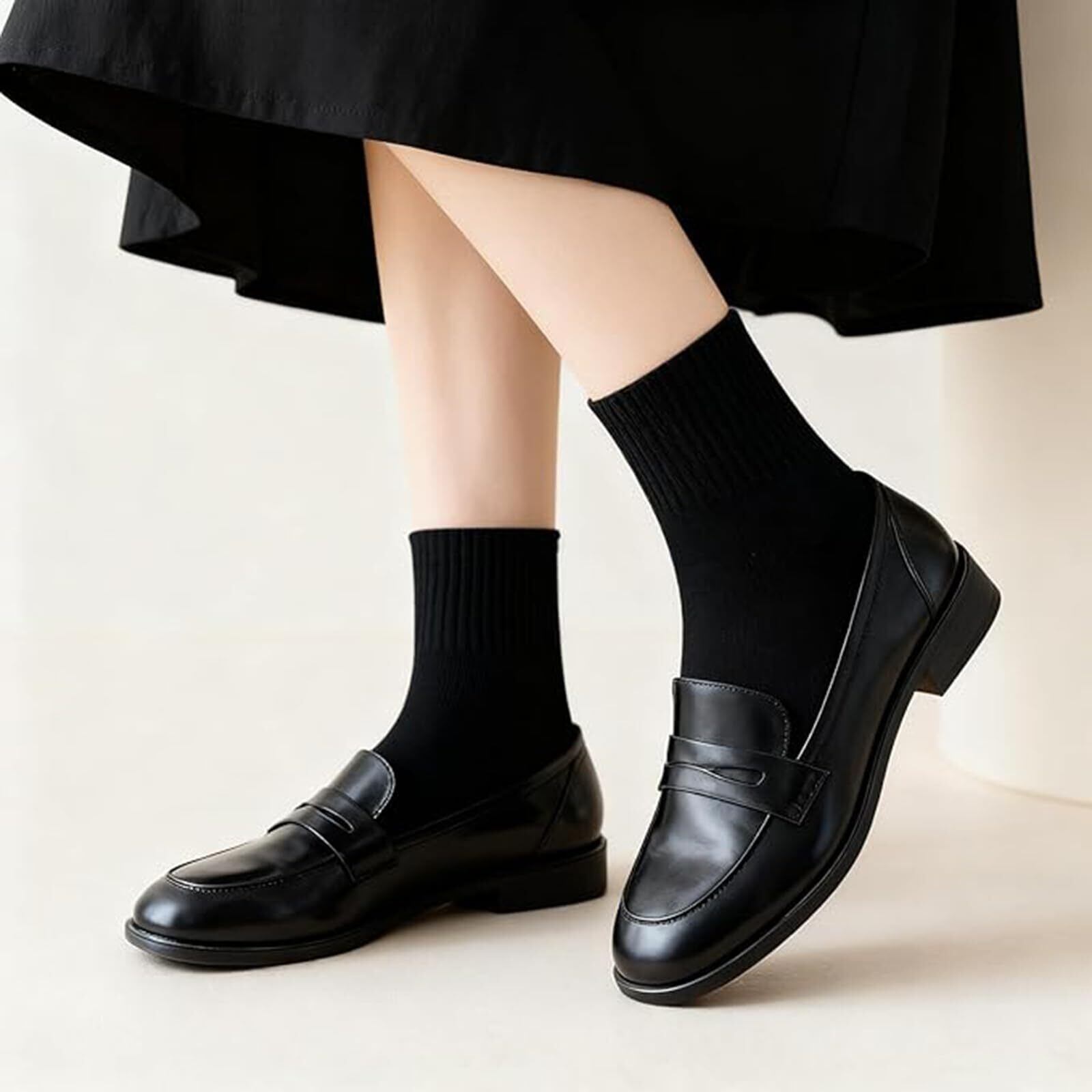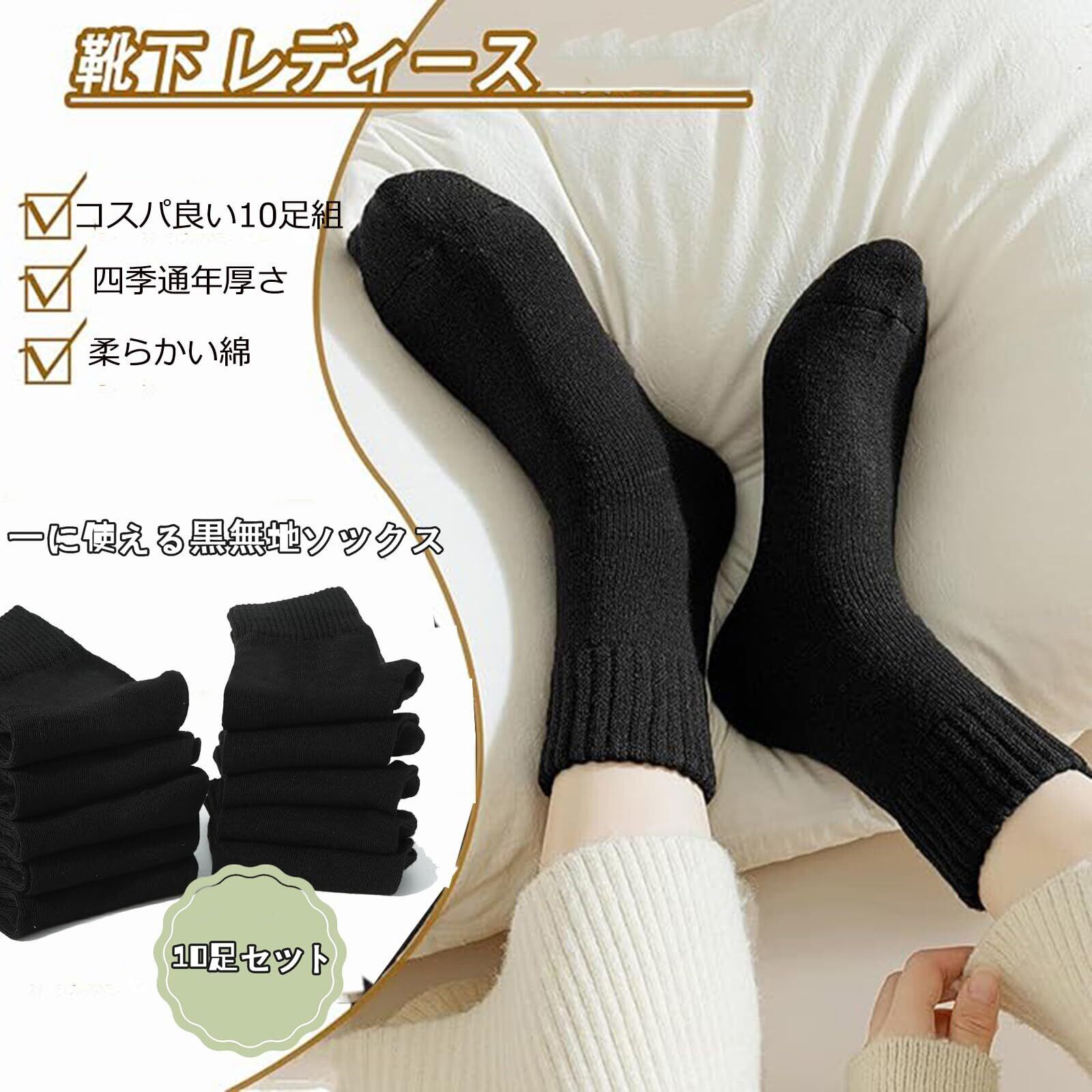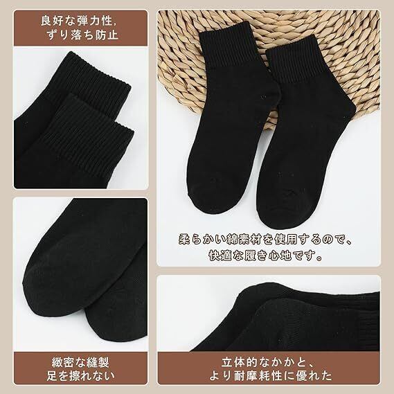 【yazon黒の靴下商品仕様】レディース用のまとめ買い10足セットの黒ソックス。素材:80%綿+ボリエステル+スパンデックス。サイズ:22-25cm。伸缩性良いフリーサイズで大部分の日本女性の足に適用大きめ靴下。厚さ:厚手と薄手の中間厚さ。季節対応:四季。春秋の着用に最適が、夏は蒸れにくい、冬にも保温防寒靴下。パーケージ内容:黒色10足セット。普段の生活に活躍する黒のクルーソックス、制服 スクール 高校生 婦人通勤通学ファション小物です。年間通して履いていただけるレディース靴下です。