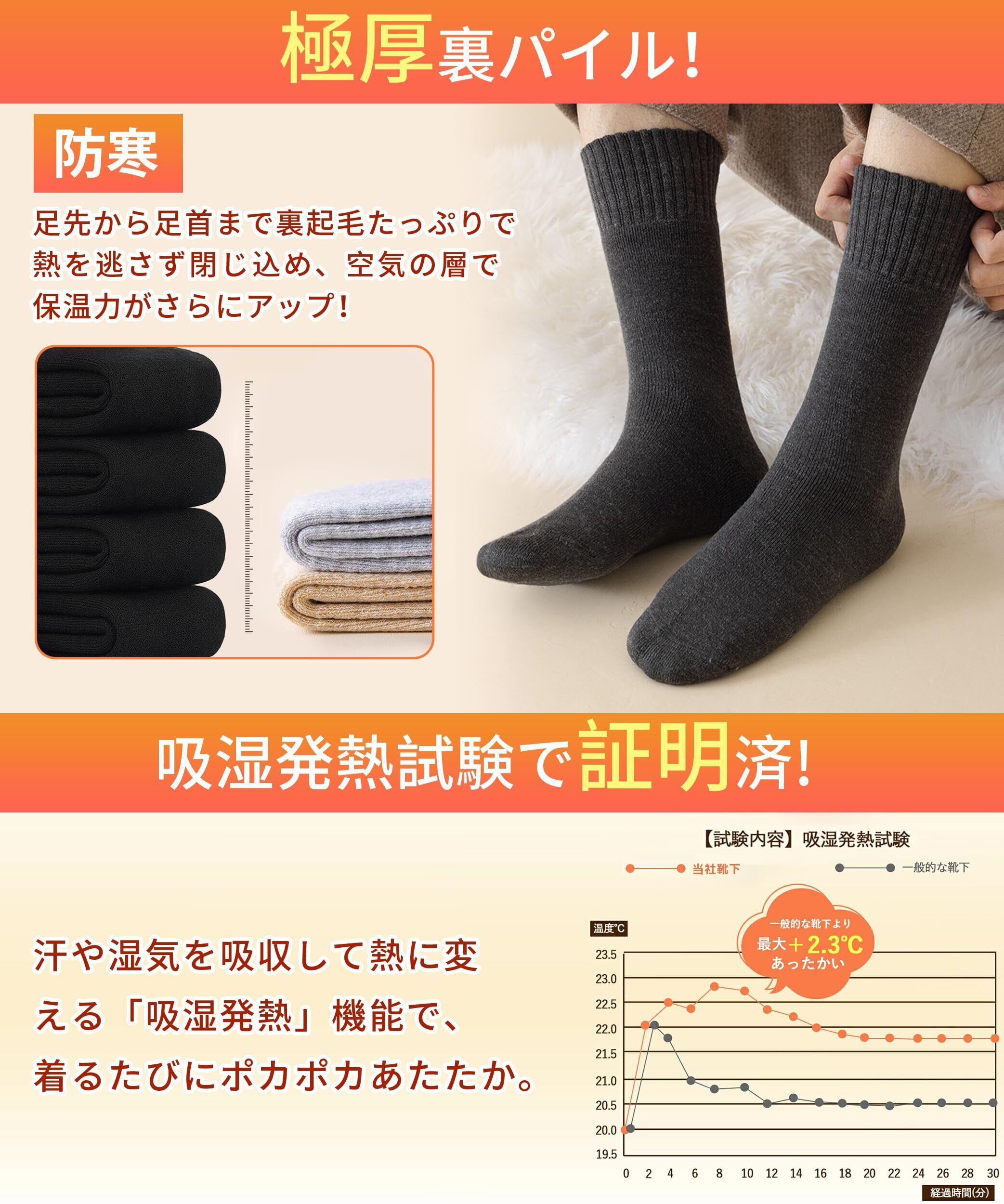 【商品説明】肌寒い季節に大活躍して、秋・冬・春の3シーズン対応メンズ靴下です。【素材】ウール、コットン、ポリエステル、スパンデックス【サイズ】24-28㎝【重量】:約56g。寒い冬の日には、一歩一歩に暖かさが必要です。 こたつのように暖かい靴下は、繊維の1本1本に暖かさのパワーを秘めています。 冷たい風が吹いても室内暖房が不足しても暖かさを感じることができます。冷たい足から離れて、冬の暖かさと安らぎをお楽しみいただけます。