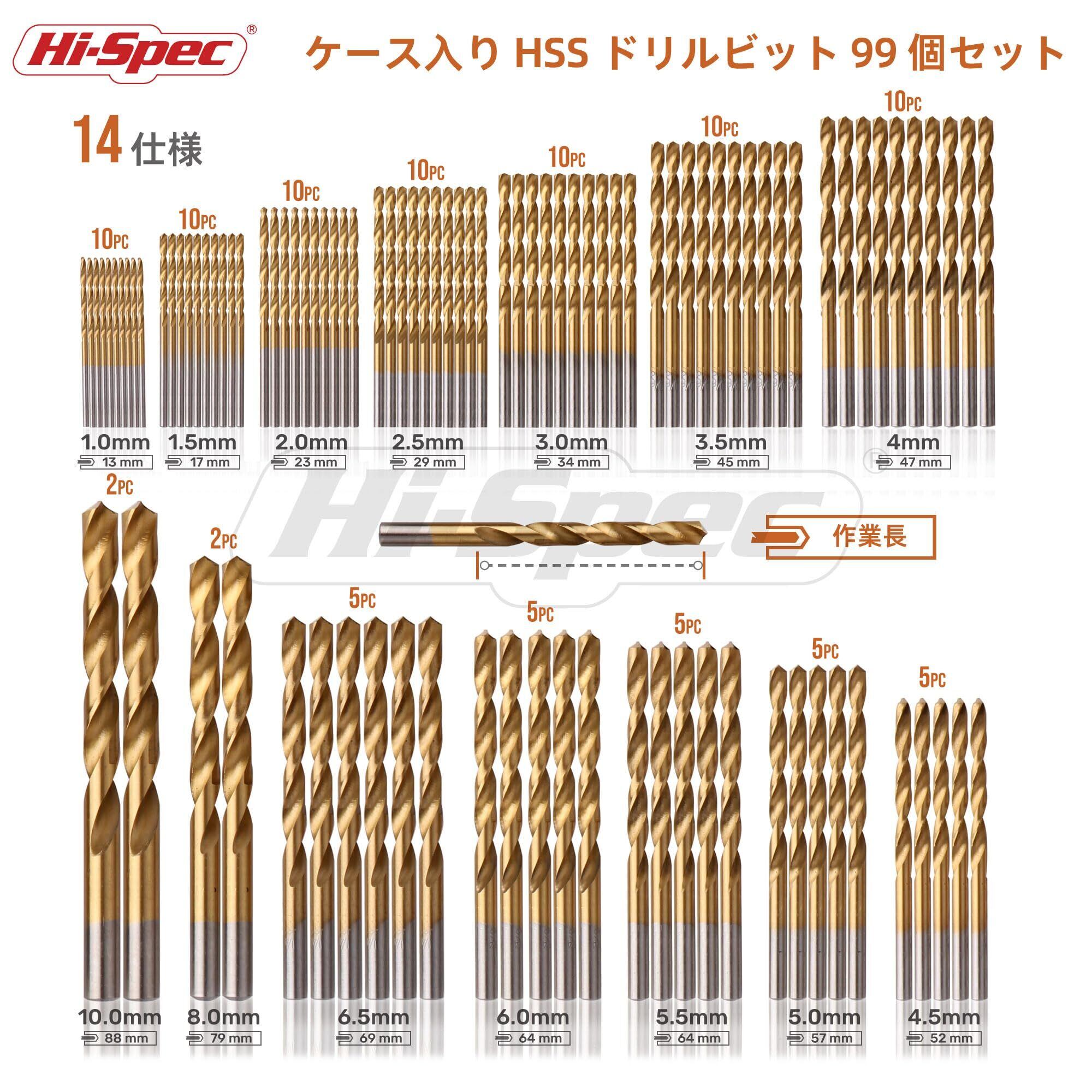 Hi-Spec 【プロ仕様99点セット】HSS チタンコートドリルビット 1-10mm 金属・木材・プラスチック・レンガ・コンクリート用 高硬度高速鋼 収納ケース付き(電動ドライバー・インパクトドライバー対応)