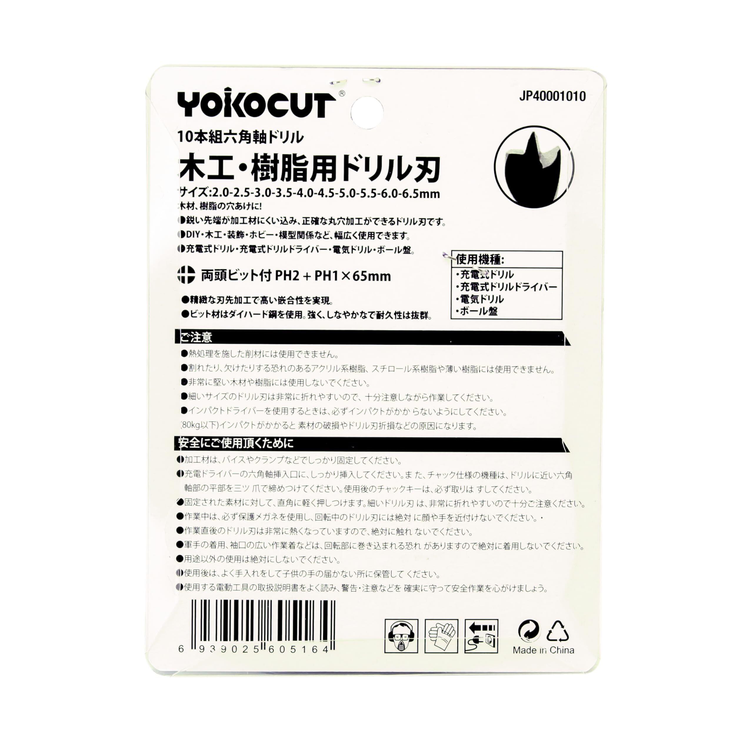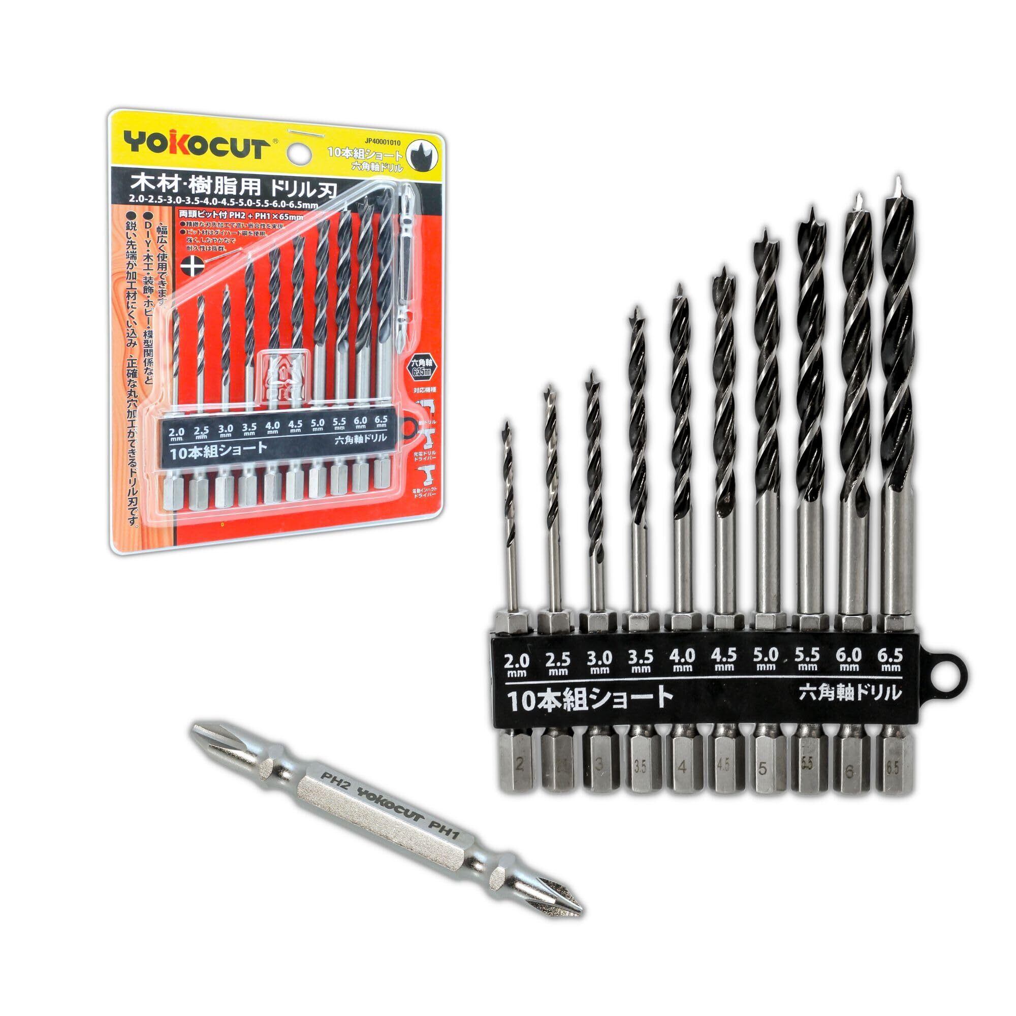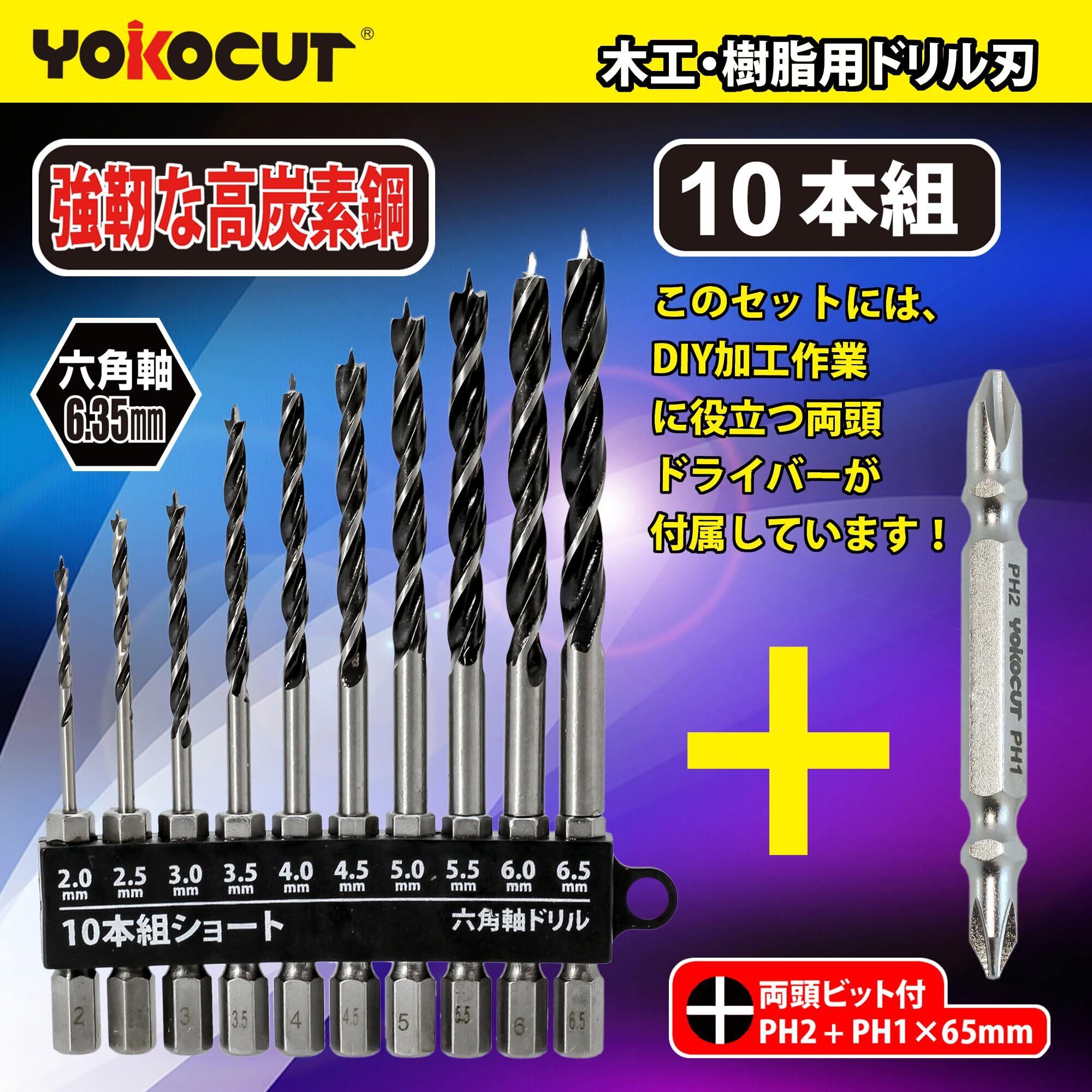 YOKOCUT ドリルビットセット 木工用ドリル 六角軸 10本組 木材 穴開けドリル 先三角木工用ドリルビット で インパクト両頭ドライバービット。 YOKOCUT ドリルビットセット 木工用ドリル 六角軸 10本組 で インパクト両頭ドライバービット, 高炭素鋼の素材を使用し、熱処理を施しています。製品の加工性能が良く、強度と靭性が高いです。刃を研磨した後も切れ味が鋭く、品質が安定しています。 木工作業に使用頻度の高いサイズをまとめたドリルセットです。 鋭い先端で加工材の狙った箇所に確実にくい込み、正確な穴あけ加工が行えます。刃先はブラッドポイント刃先で穴あけ時の位置決めが容易です。刃先には誘導ネジが無いため押しつけた分だけ穴あけできる安全設計です。止め穴加工(ダボ穴)も可能です。六角軸仕様ですのでインパクトドライバーへワンタッチで着脱可能で、DIT・木工・装飾・ホビー・模型関係など、幅広く使用できます。 セット内容 (ドリルビット): 2.0、2.5、3.0、3.5、4.0、4.5、5.0、5.5、6.0、6.5mm; セット内容 (ビット): (長さ65mm) No2+No2 シャンク径: 6.35mm 電気ドリル・充電ドリルドライバー・充電インパクトドライバーに適合する日式6.35mm六角柄を採用しています。取り付けやすく、安定した回転を実現します。 木工用ドリルビット ドリル ビット ビット木工 木材 穴開けドリル 竹用ドリル ドリルビット 六角軸 ドリル 先三角木工用ドリルビット インパクト両頭ドライバービット