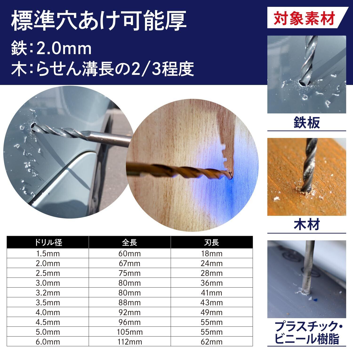 【汎用性の高い118度 刃先角】 ドリル歯の角度は、汎用性の高い118度を採用。鉄板(厚さ2mmまで)はもちろん、木材への穴あけもスムーズに行えます。DIYでの一般的な作業に幅広く対応できる、頼れる存在です。