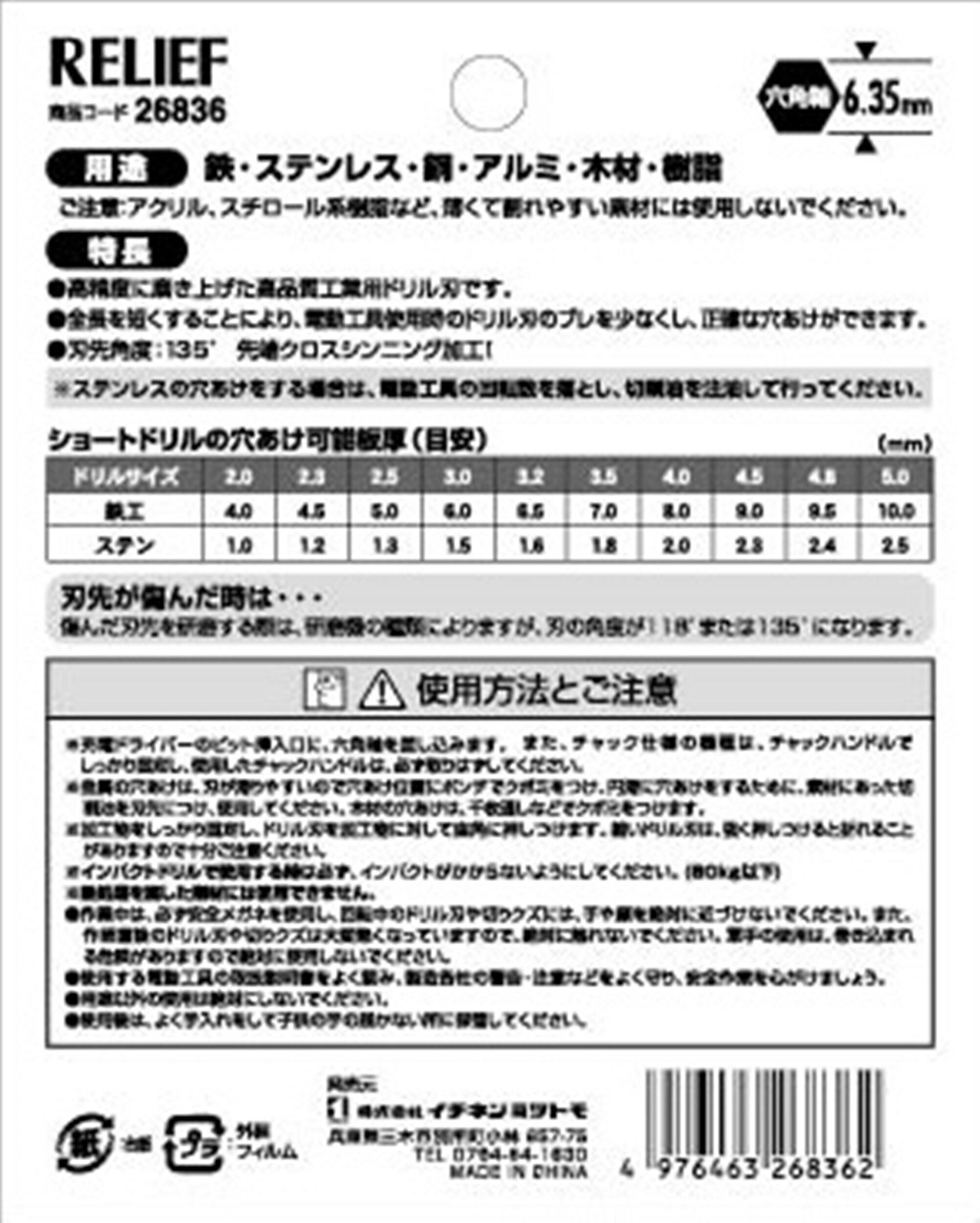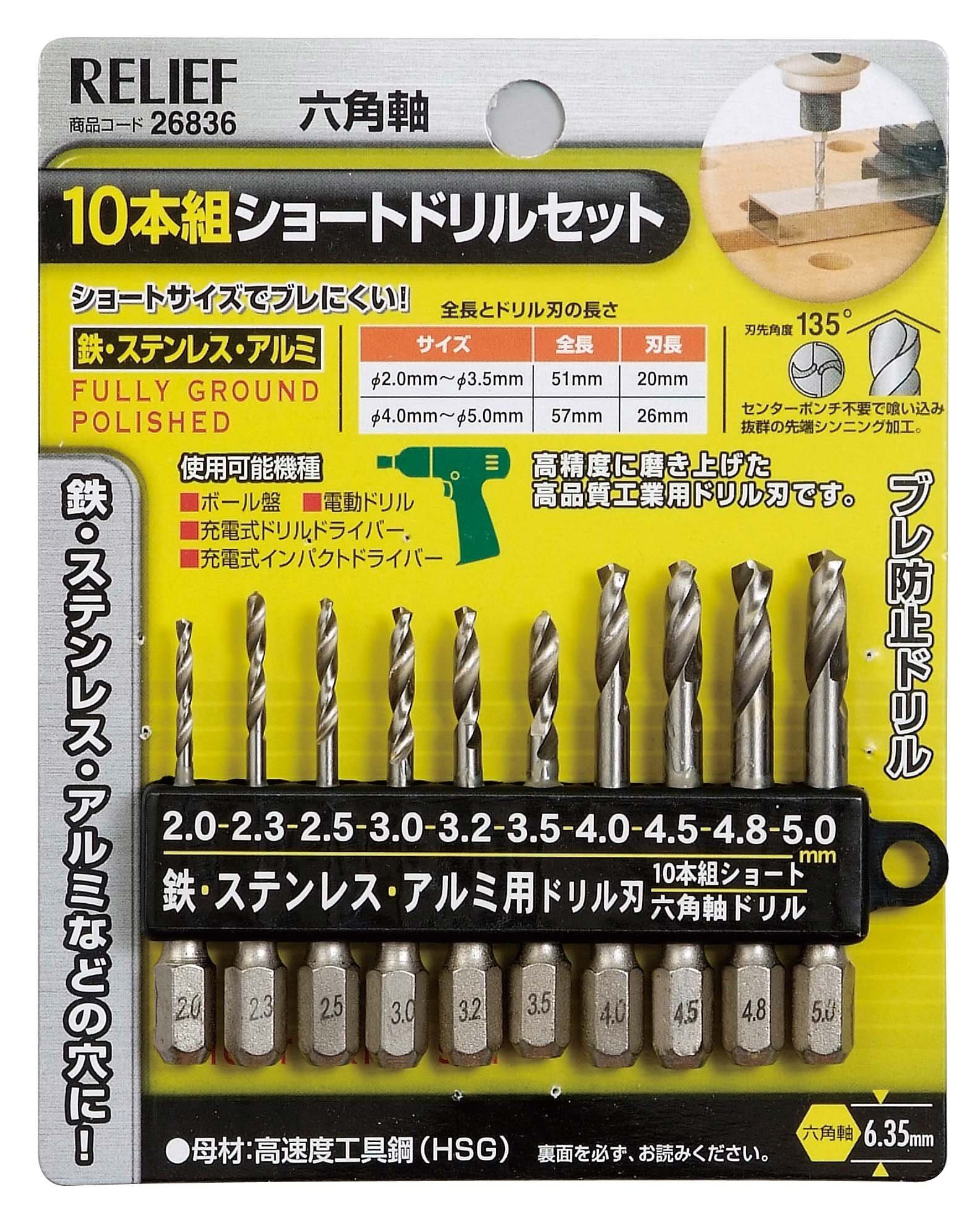 イチネンアクセス RELIEF(リリーフ) 鉄工ドリル 10本組 六角軸ショートドリルセット 26836 鉄工用