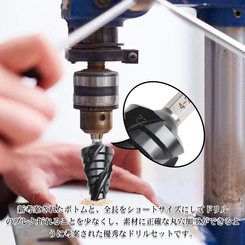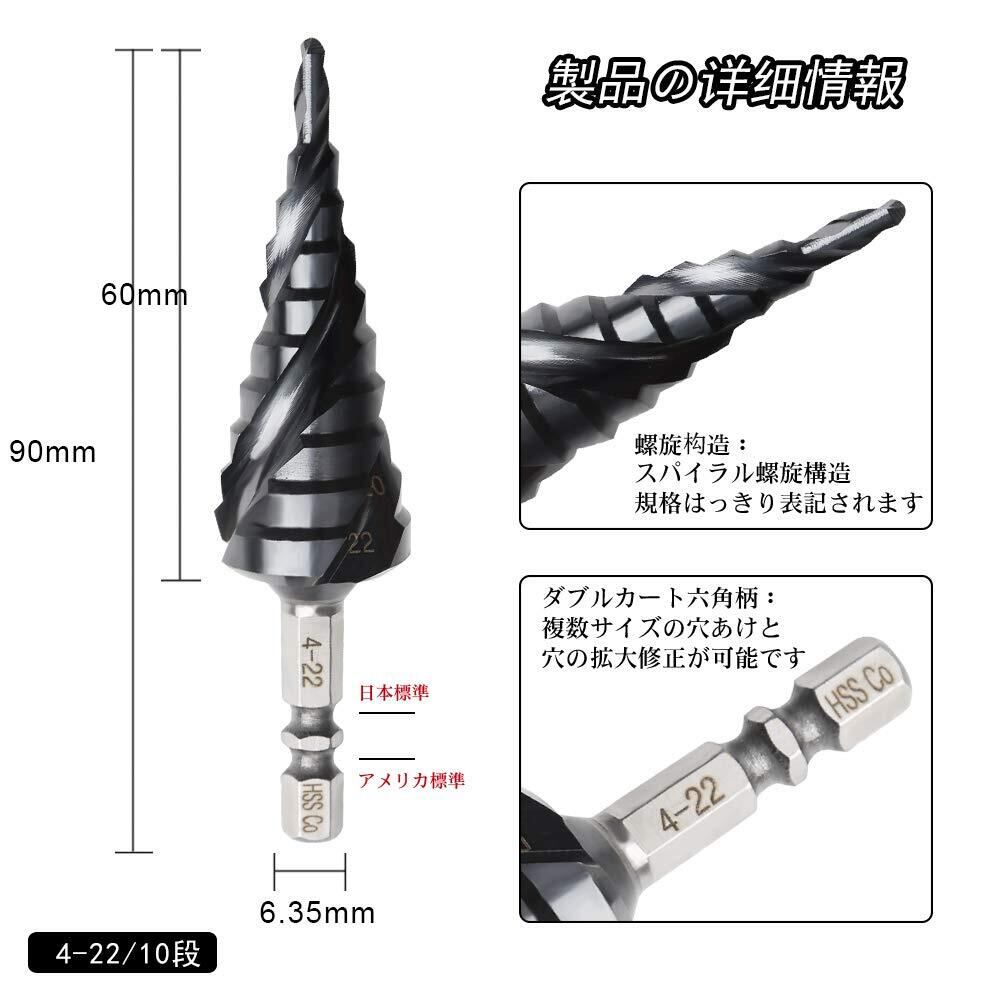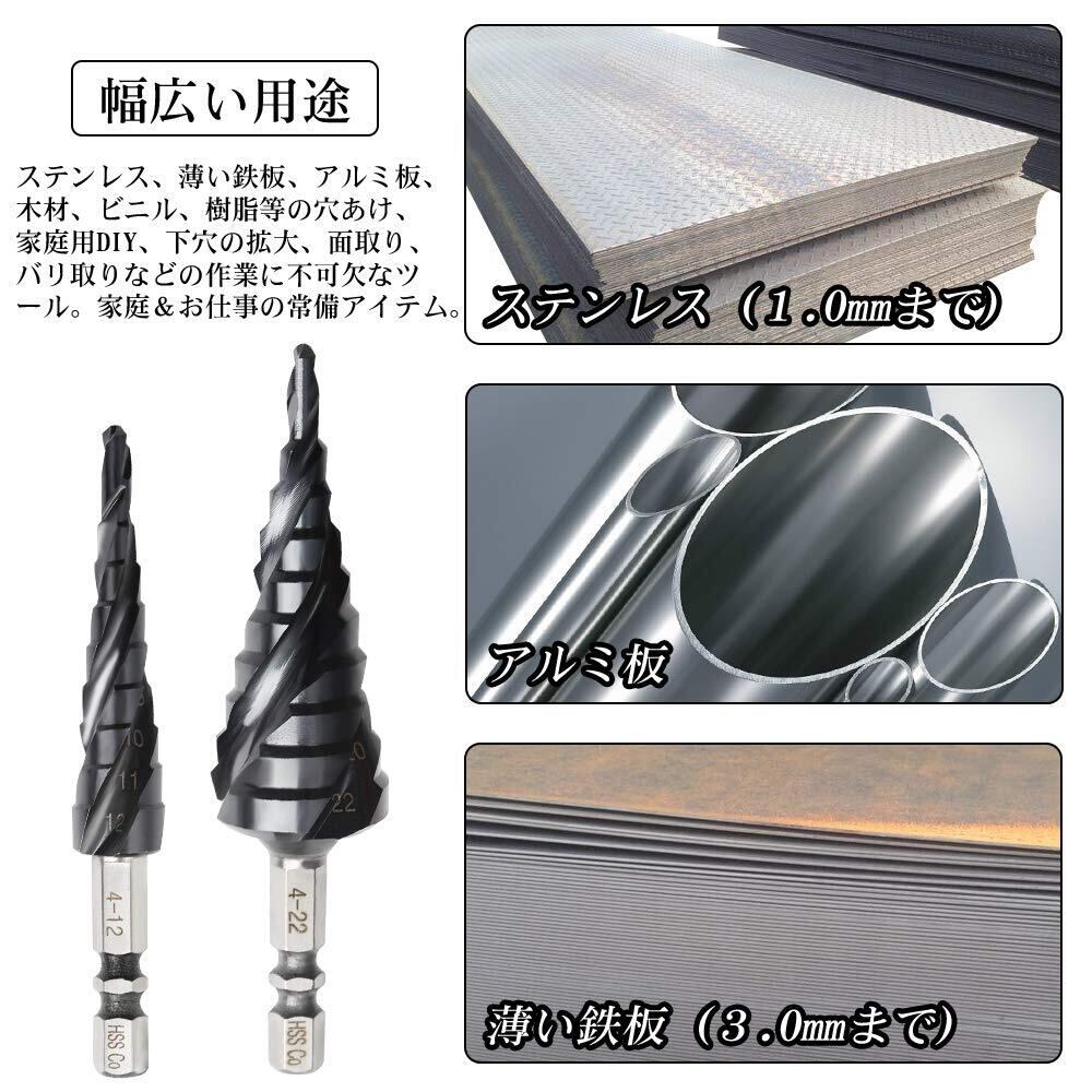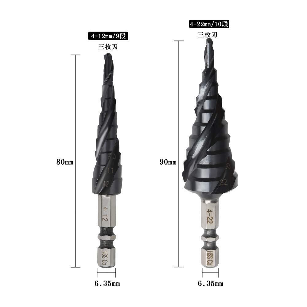 【2個セット】:4-12mm<9段> (4,5,6,7,8,9,10,11,12)。4-22mm<10段> (4/6/8/10/12/14/16/18/20/22)。ステップドリル収納ケースも付きます。
