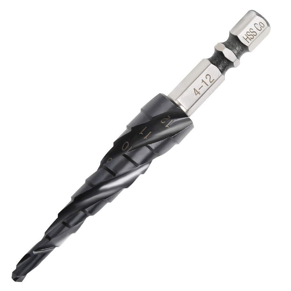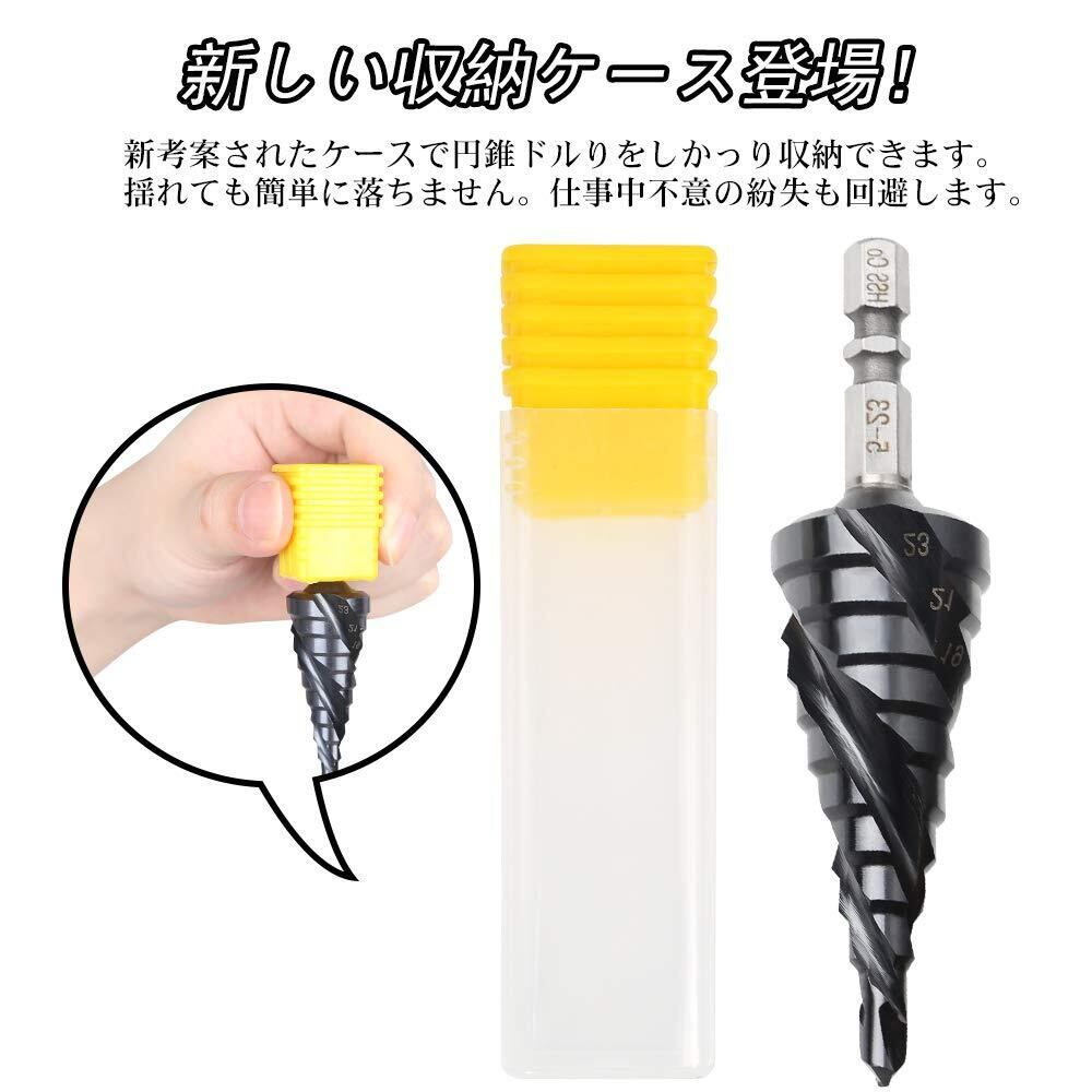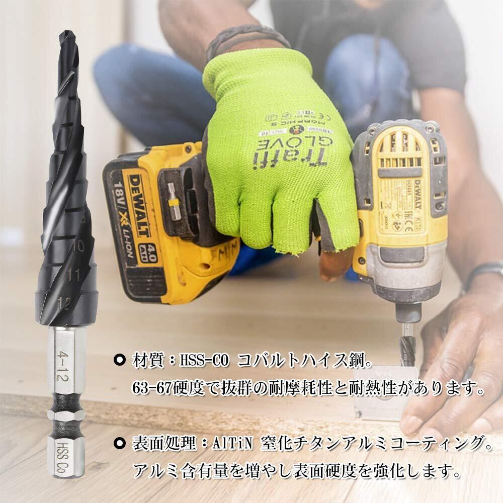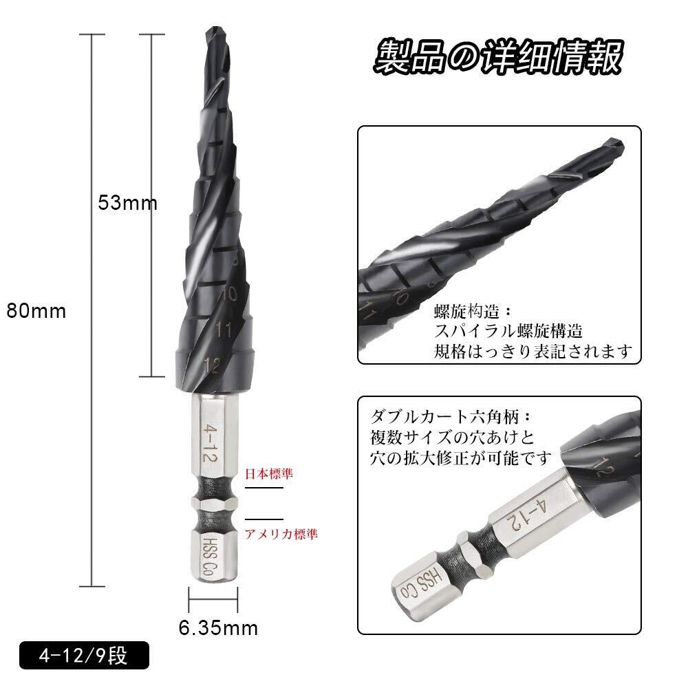 三枚刃ステップドリル ステンレス用 六角軸 スパイラルドリル 穴あけ たけのこドリル 円錐ドリル チタンコーティング HSS-Co M35 (4-12mm/9段)