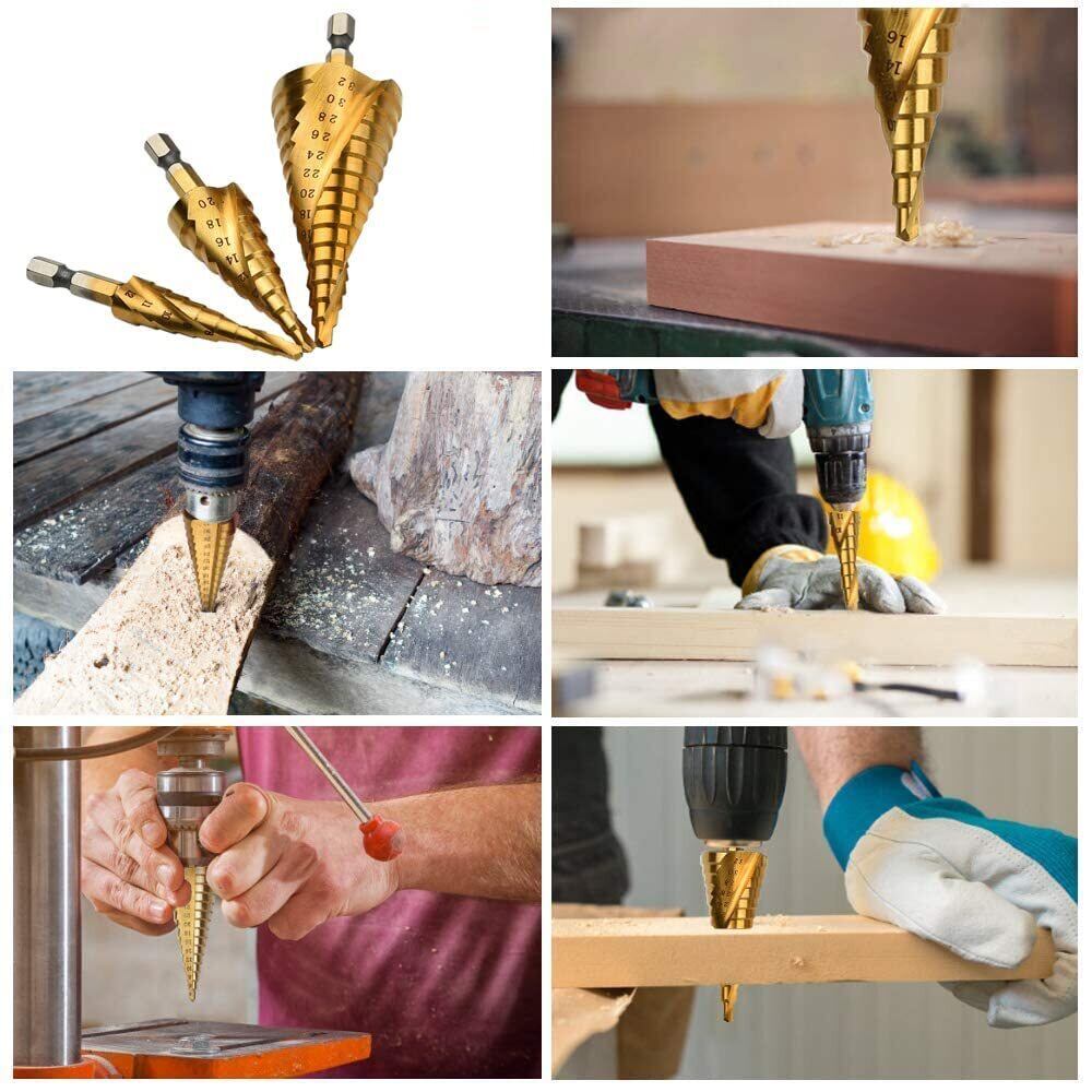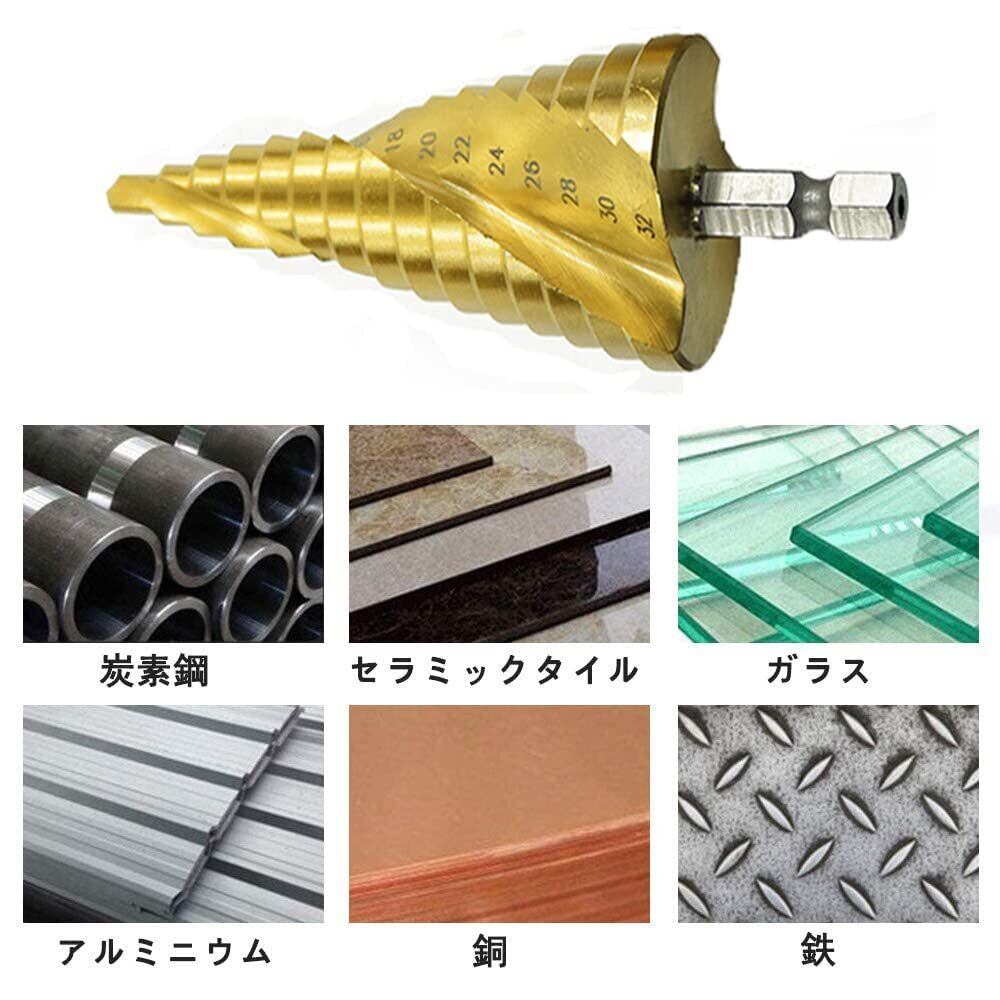 【高品質の素材】HSS高速度鋼(HSS鋼4241)ステップドリルの表面をチタンコーティングで被覆し、HRC62-64の硬度を実現しています。ステップドリルの耐高温性と耐摩耗性をさらに向上させ。耐久性があるだけでなく、とても美しいです。ほとんどの毎日のパンチングの使用に適しています。
