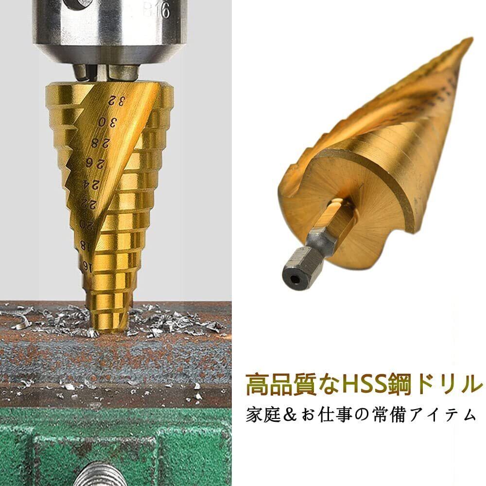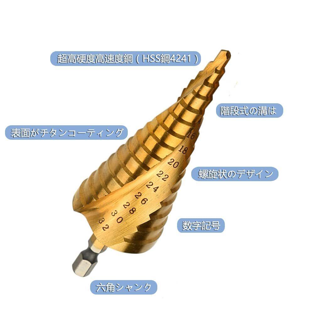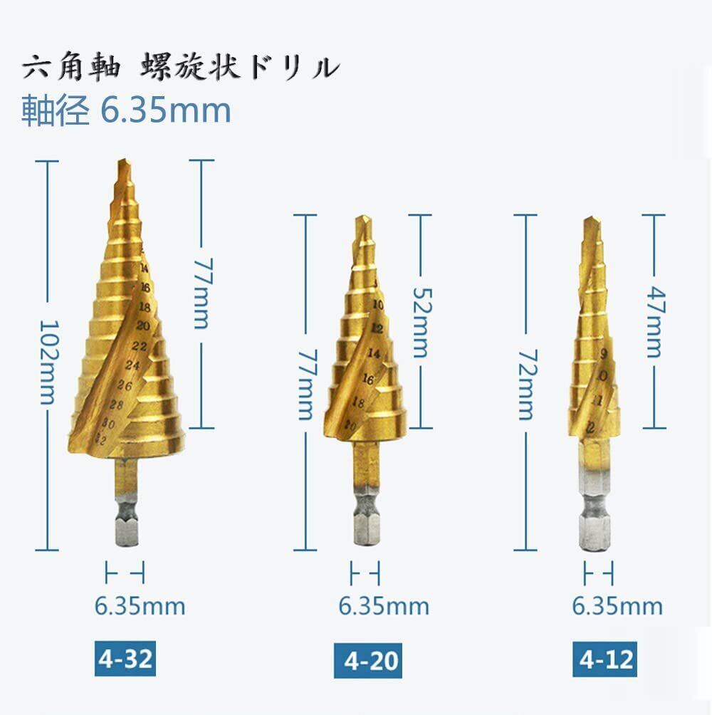 LIKENNY ステップドリル 六角軸 螺旋セット 4-32mm 15段 4-20mm 9段 4-12mm 9段 チタンコーティング スパイラル HSS钢 ドリル 3本セット 収納袋付 (たけのこドリル)