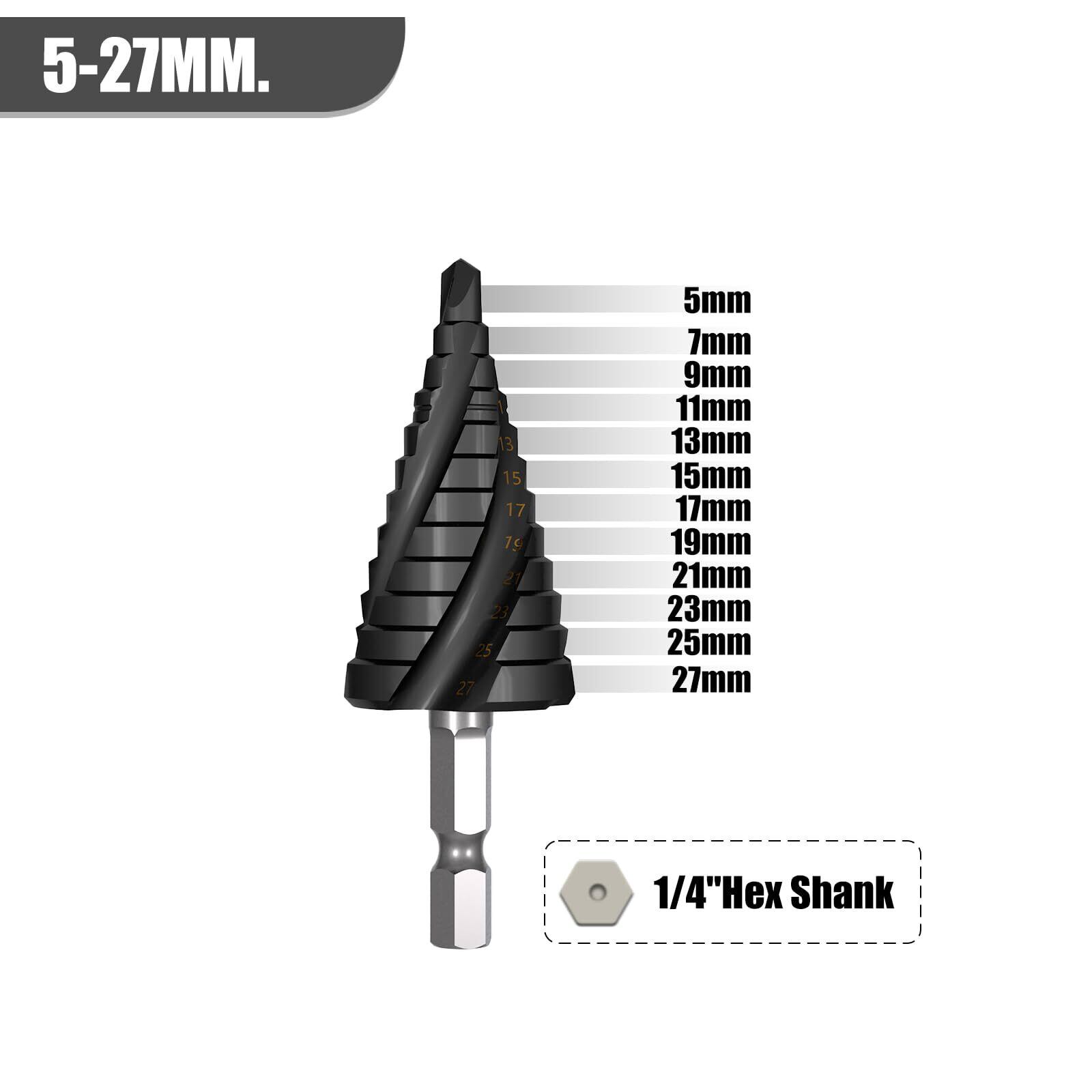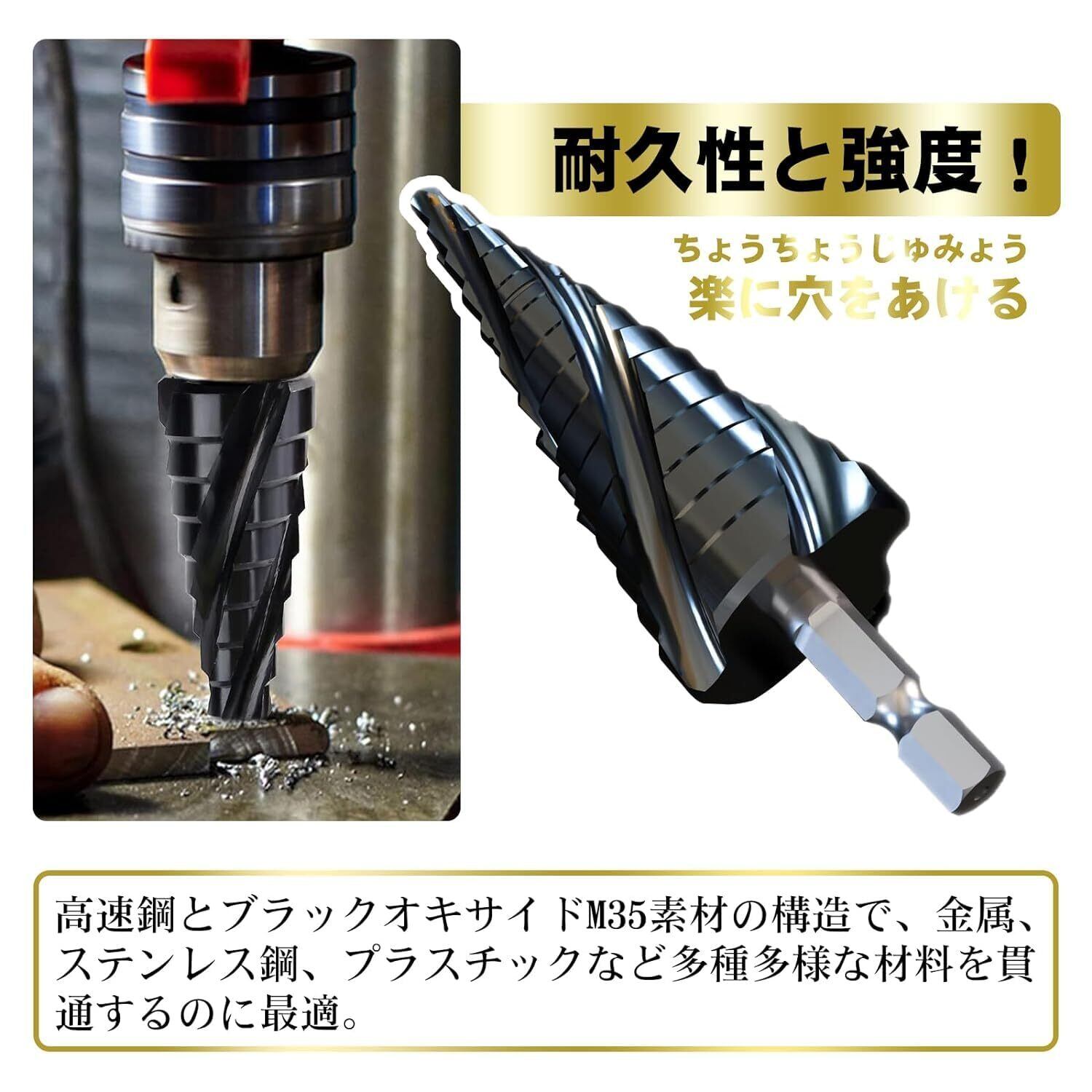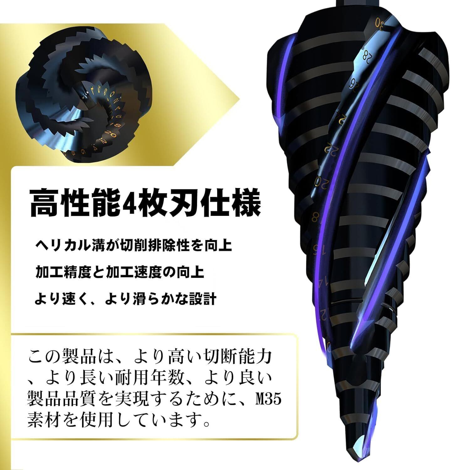 高性能4枚刃仕様 M35ステップドリルビットセット- 金属、ステンレス鋼、アルミニウム、木材、プラスチック向け (5-27mm)