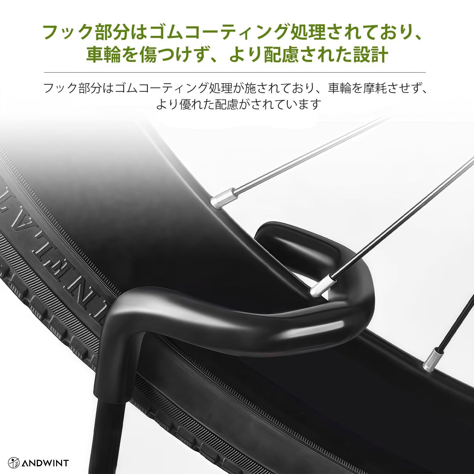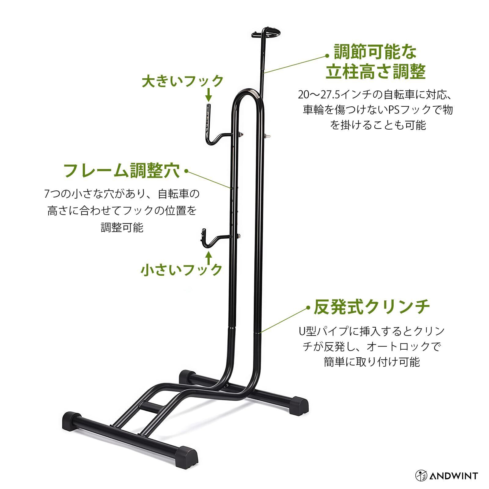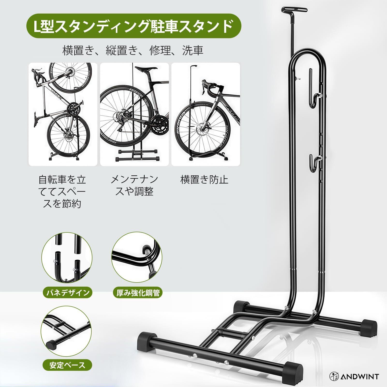 【3タイプの置き方】自転車スタンドを利用すれば、自転車は縦置き、横置き、掛け置き、3通りの方法で置くことができます!縦置きならスペースを有効活用でき、横置きではフロントホイールを差し込むだけで、自転車がしっかりと安定します。さらに、U字フックにチェーンステーを引っ掛ければ、後輪を浮かせてメンテナンススタンドとしても利用可能です。