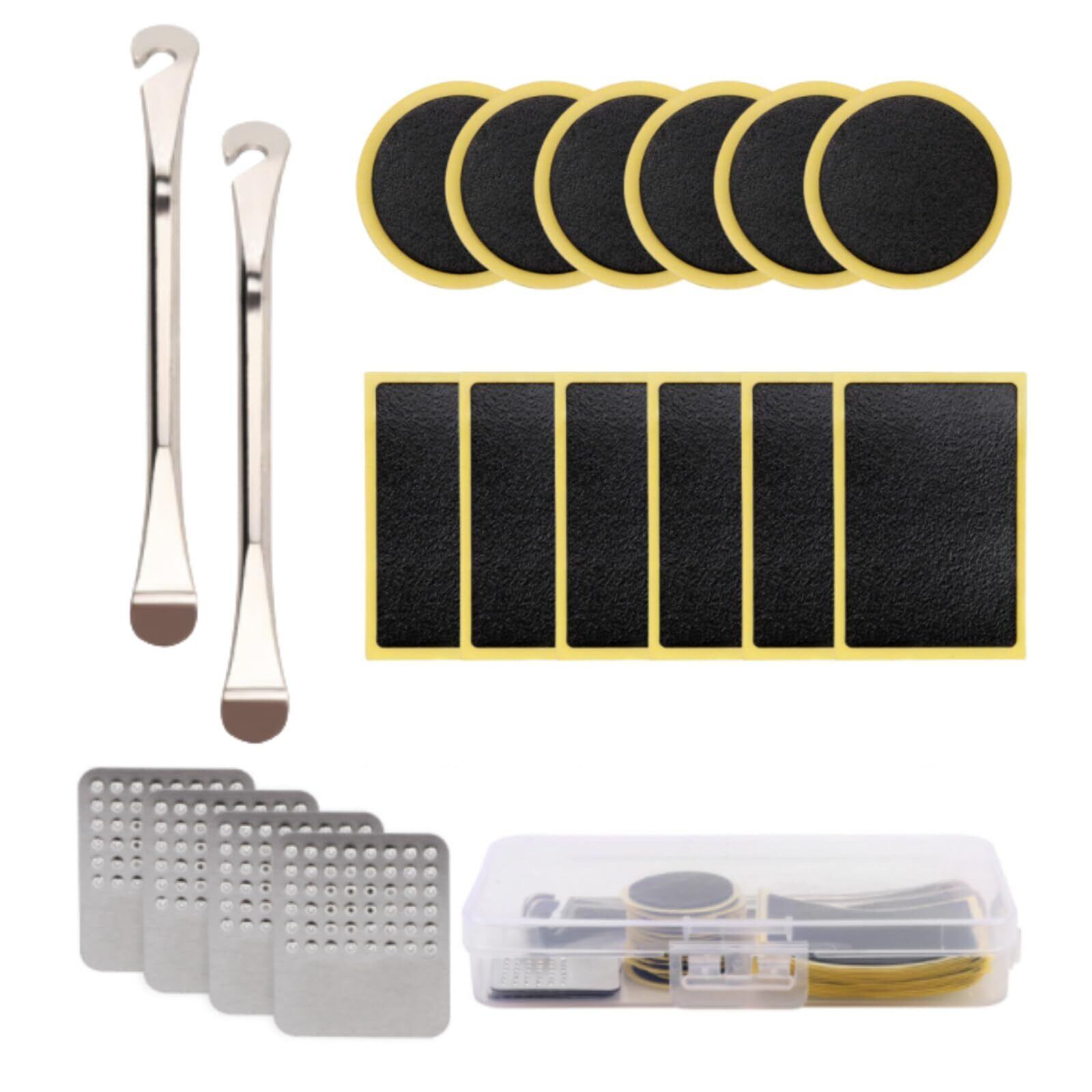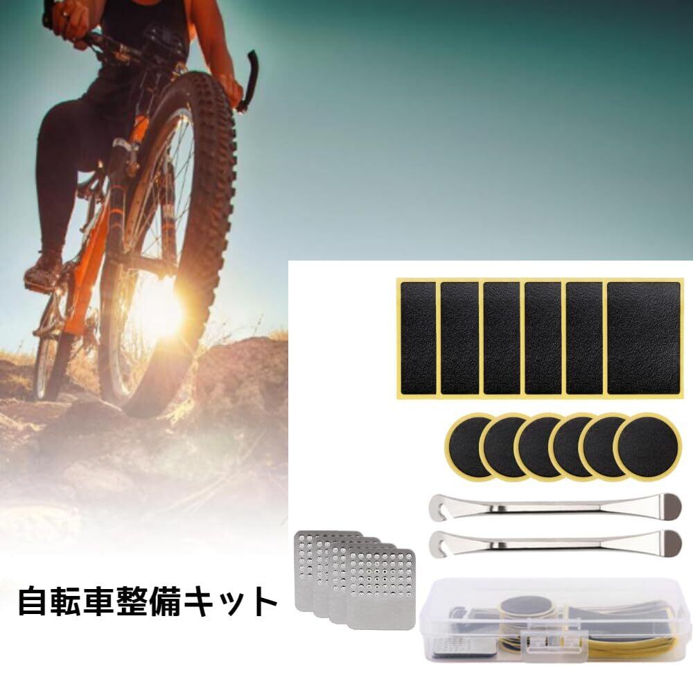 【内容】自転車修理工具セット18点:角形パッチ6個、円形パッチ6個、金属タイヤバール2個、金属ヤスリ4個。