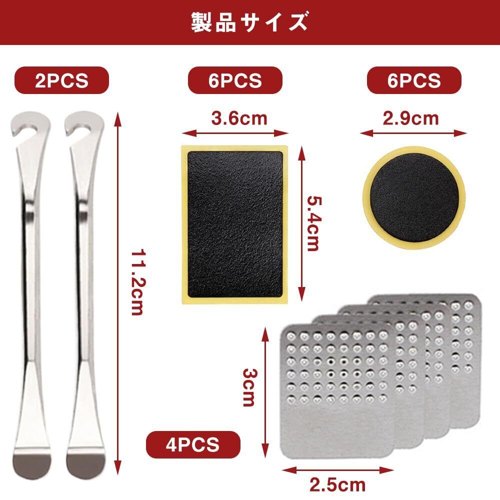 セット内容:丸パッチ6枚+角パッチ6枚+メタル・プライヤー2本+メタル・ヤスリ4本,の計18個セット。このキットがあれば、他の補助器具を使わずにパンクしたタイヤを効率よく修理できる。