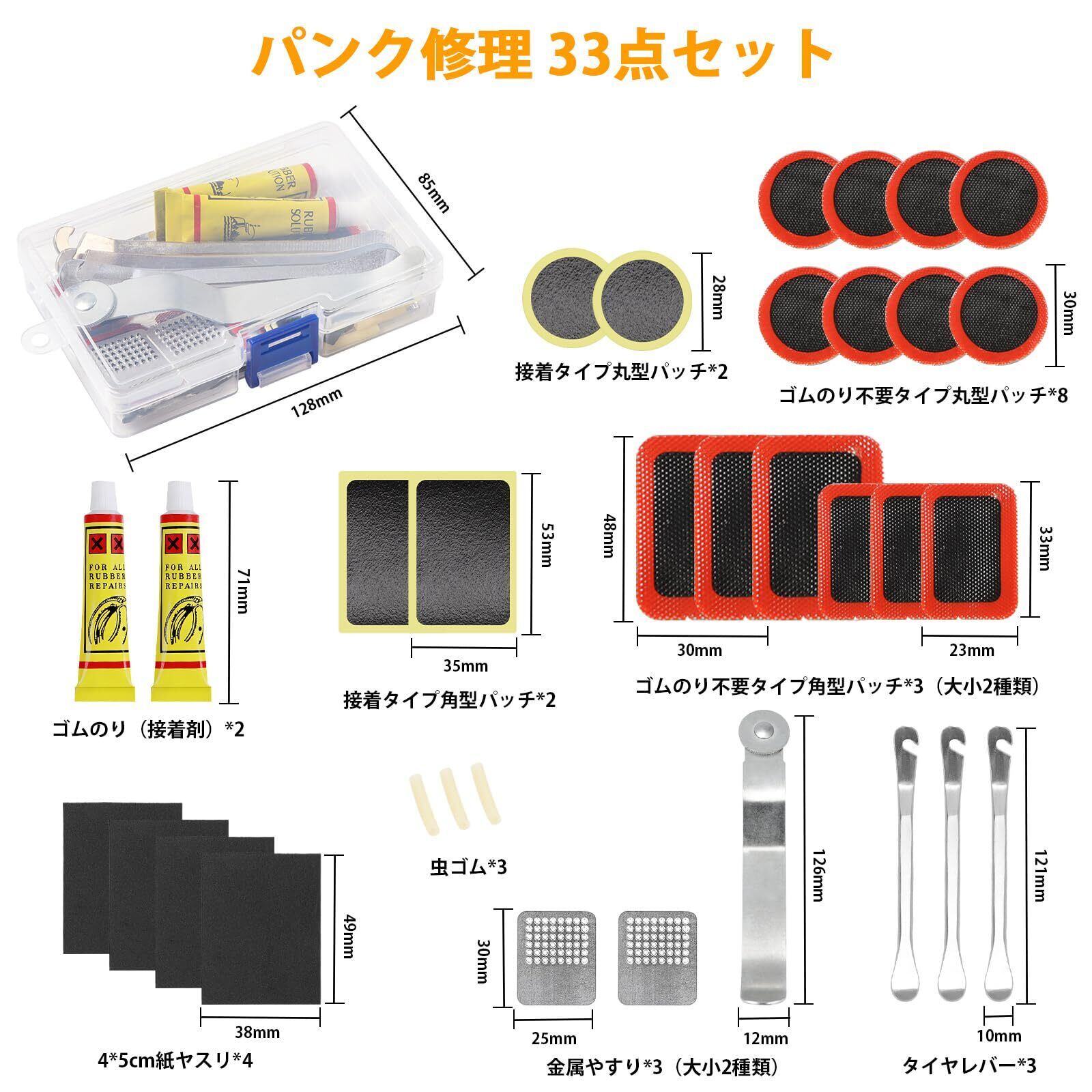 33点パンク修理セット登場:市場およびお客様のニーズに合わせてセット内容を更新し、ゴムのり、紙ヤスリ、さらに多くのパッチを追加します。自転車のパンク修理キットには18枚2種類のパッチ、3つの金属タイヤレバー、2本のゴムのり、3つの金属やすり(大小2種類)、4*5cm紙ヤスリ、3つの虫ゴムが含まれています。通勤、通学のバックに入れておいて自転車に乗ることも心強い!
