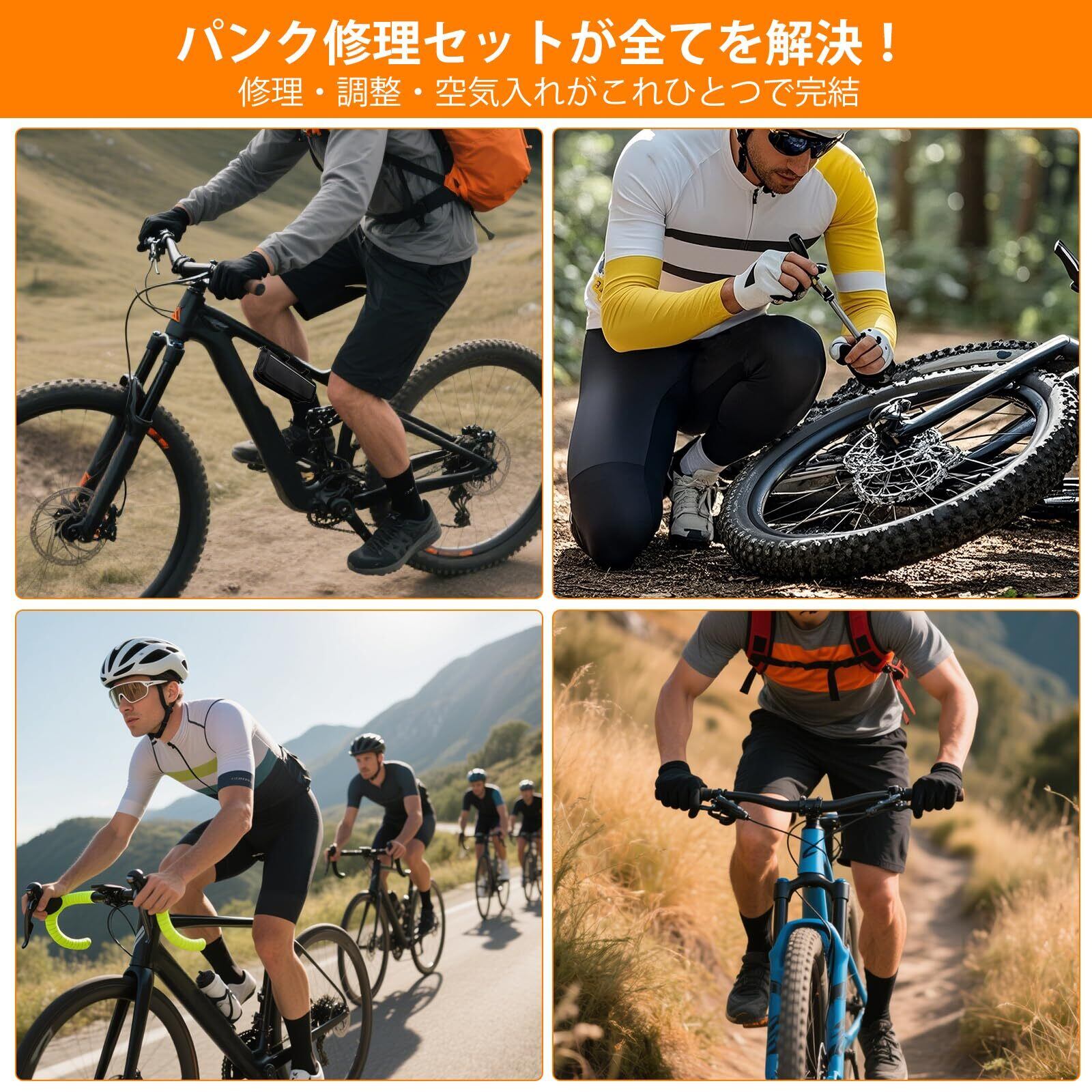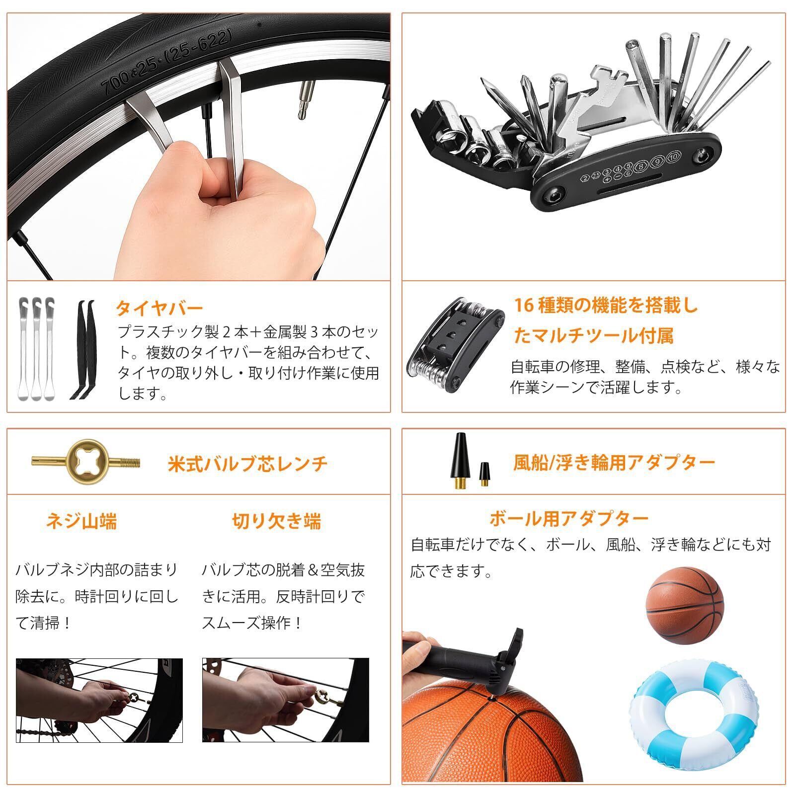 【全自転車種カバー!ママチャリからMTBまで】米式/仏式/英式バルブ対応:変換アダプター付きで、あらゆる自転車(ロードバイク、マウンテンバイク、MTB、ママチャリ)に互換性あり!家族のママチャリ、愛用のロードバイク、山岳用マウンテンバイク——全ての自転車が修理可能です。