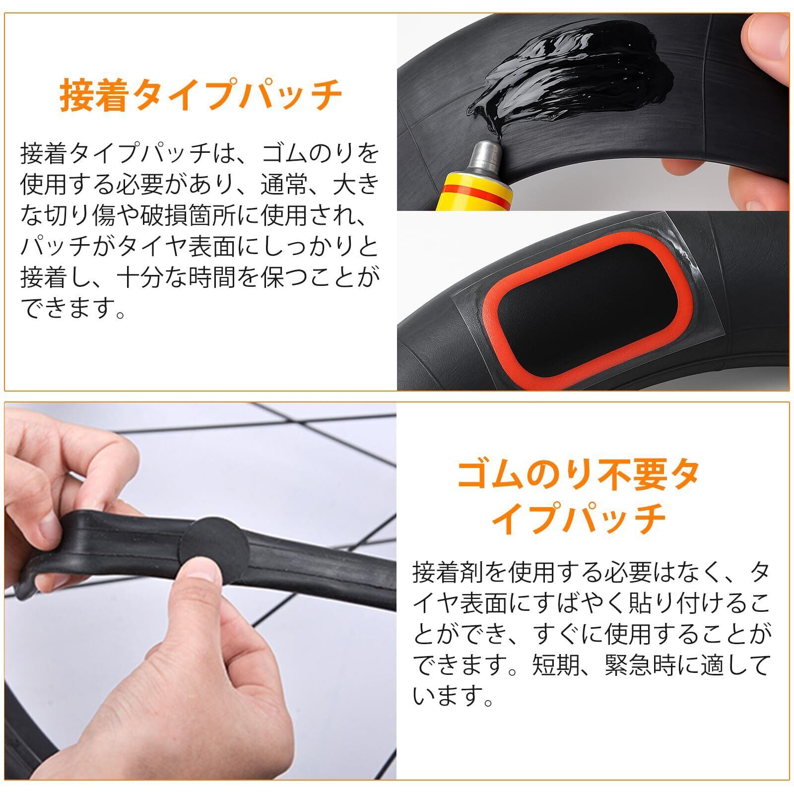 【コンパクト・2種類パッチ付き】緊急時も冷静に!「ゴムのり不要パッチ」で迅速な修理!雨の通勤中や山道でのツーリング中にパンク……そんな焦りを解消する「粘着剤不要パッチセット」を6枚同梱。裏面の粘着テープが即座に穴を塞ぎ、タイヤ修理を瞬時に完了。本格修理用には「ゴムのり」と接着タイプパッチを用意。用途に応じて使い分け可能!