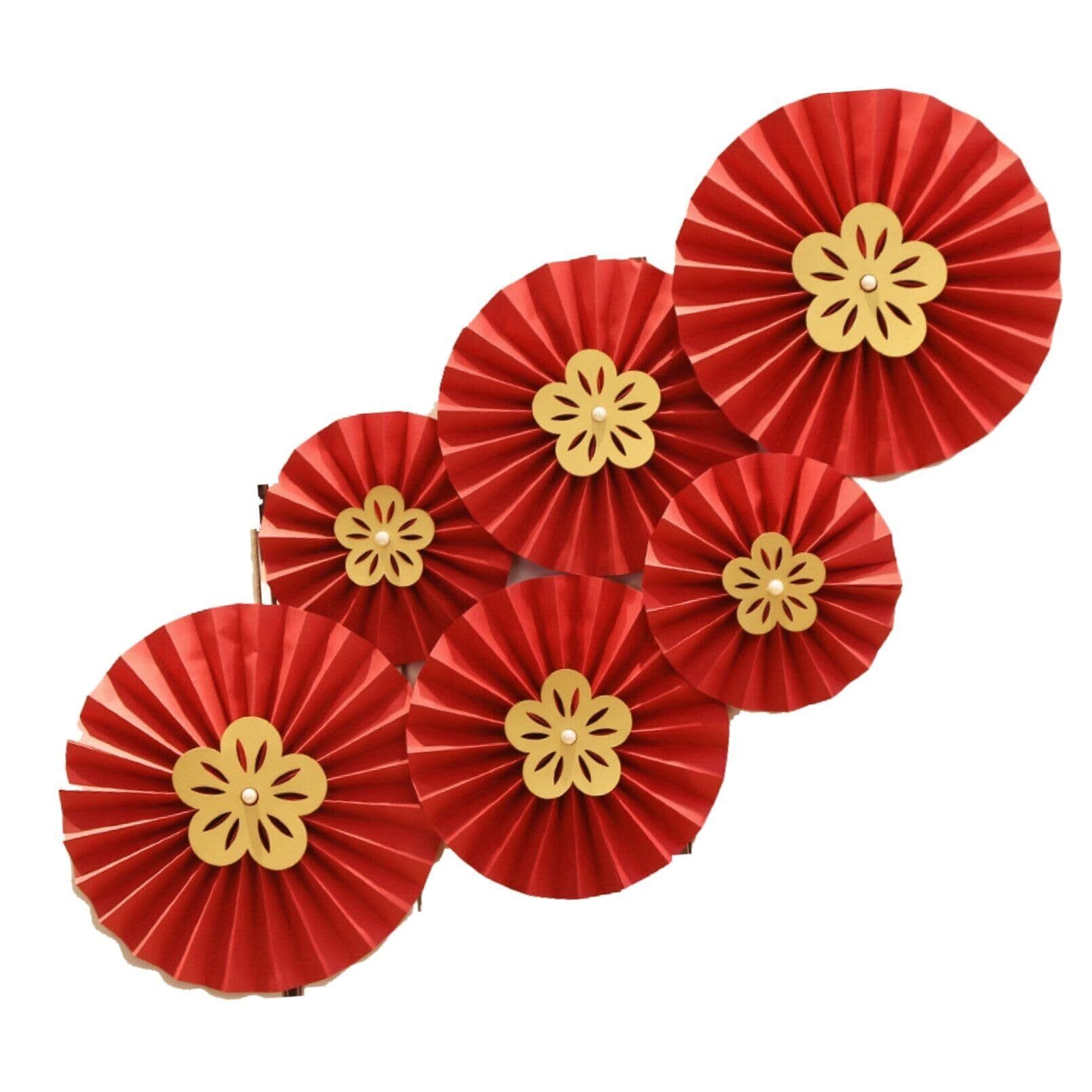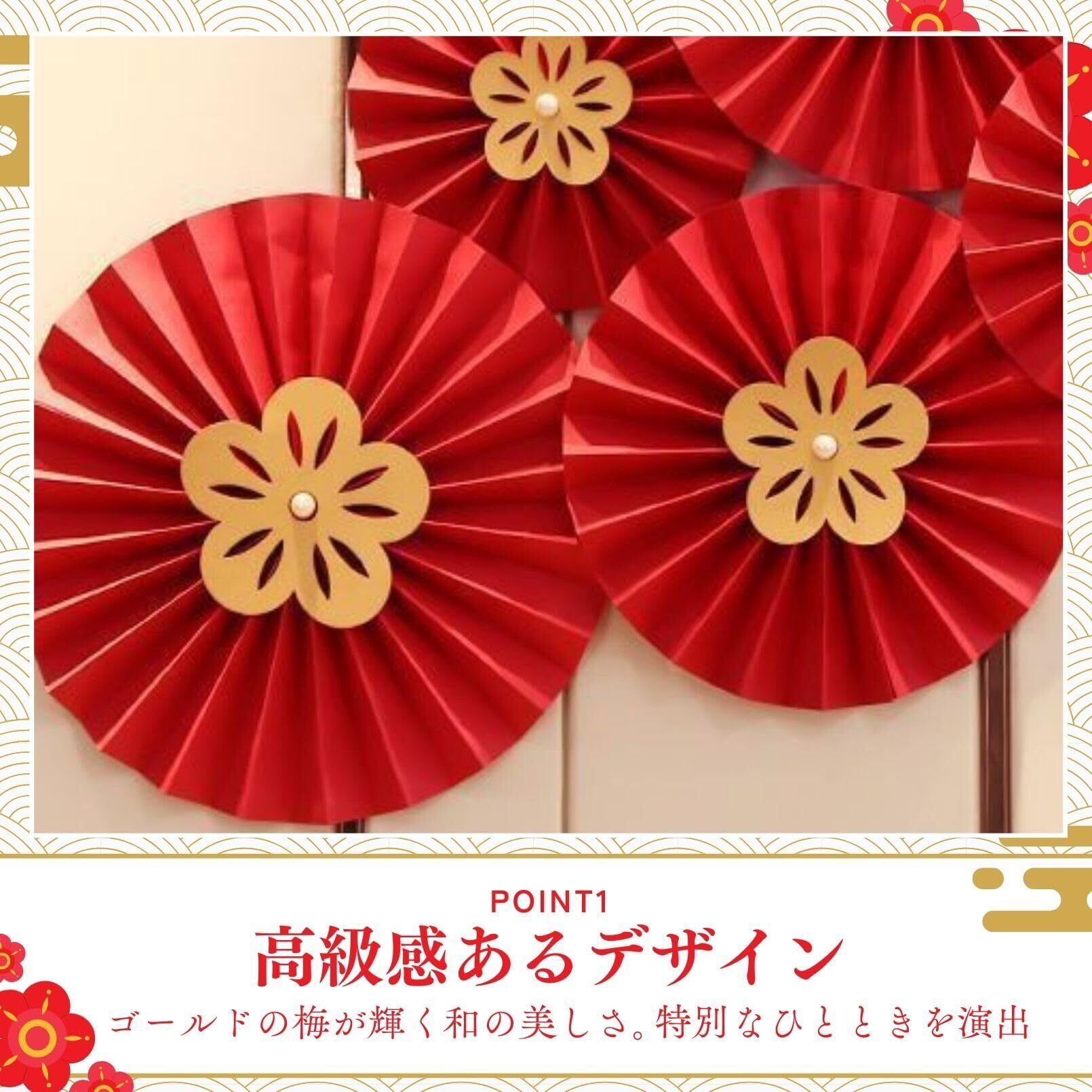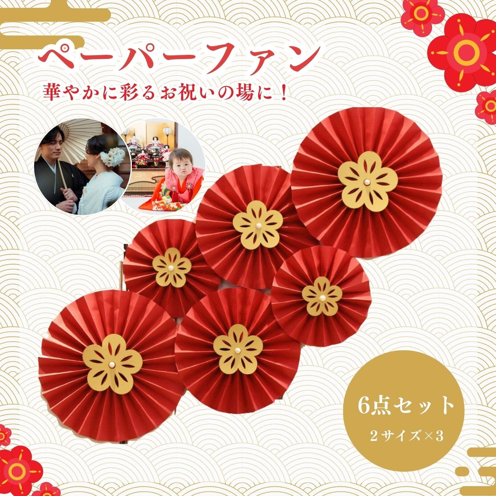 華やかな飾り付けが楽しめるペーパーファンセット。扇子状の丸い飾りの中央にゴールドの梅の花をあしらい、和風やオリエンタル風の雰囲気にぴったりです。軽量な紙製で、簡単に設置可能な6点セットです。