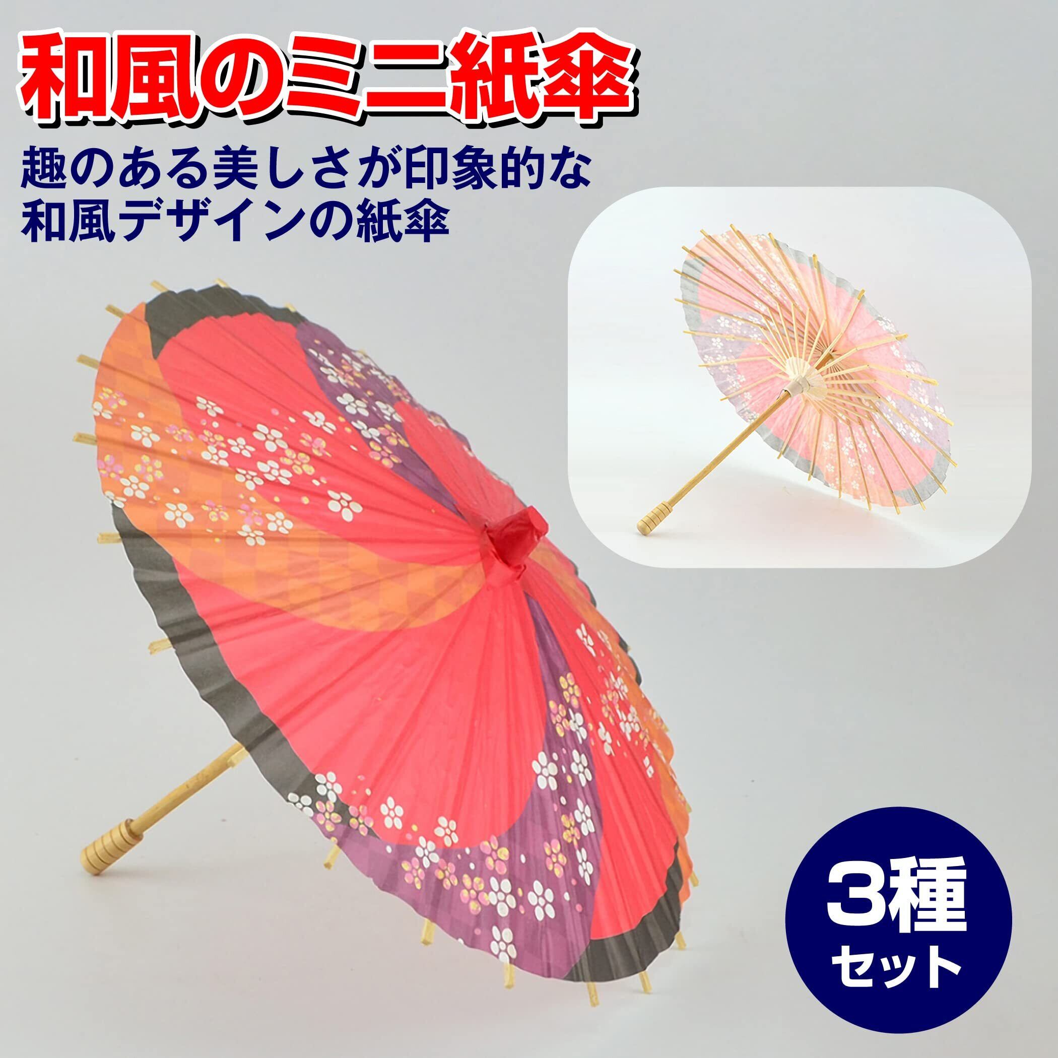 小さくてかわいい:傘の直径が約30cmのとても小さくてかわいらしいサイズ感の紙傘です。飾り棚やテーブルの上などにも置きやすい大きさなので、使いやすくて便利です。3種類の紙傘が揃ったセットなので、置きたい場所に合わせて使い分けもできます。