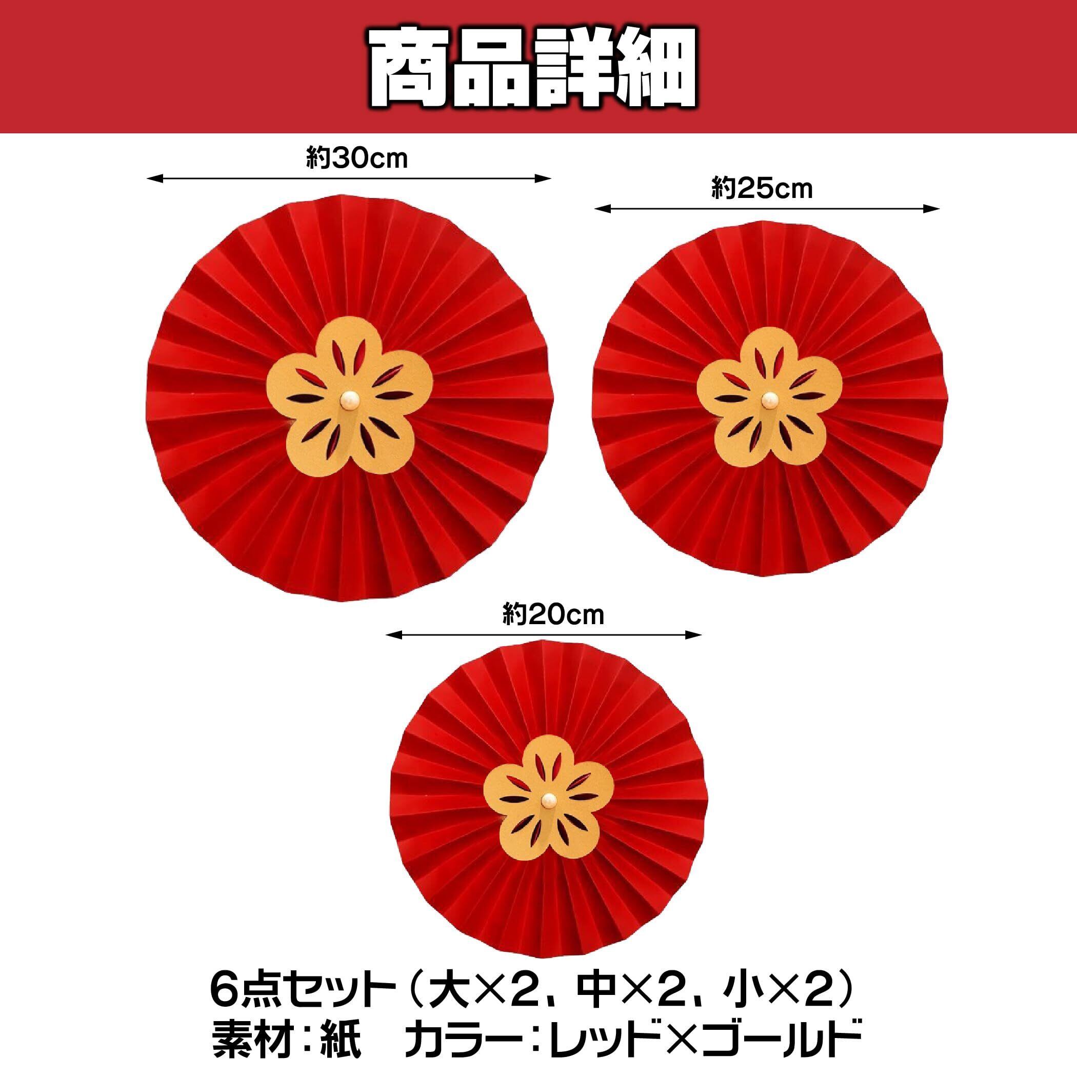 セット内容:6点セット(大直径約30cm×2、中直径約25cm×2、小直径約20cm×2) 素材:紙 カラー:レッド×ゴールド ※モニターの環境等により、色の見え方に若干差が生じる場合がございます。