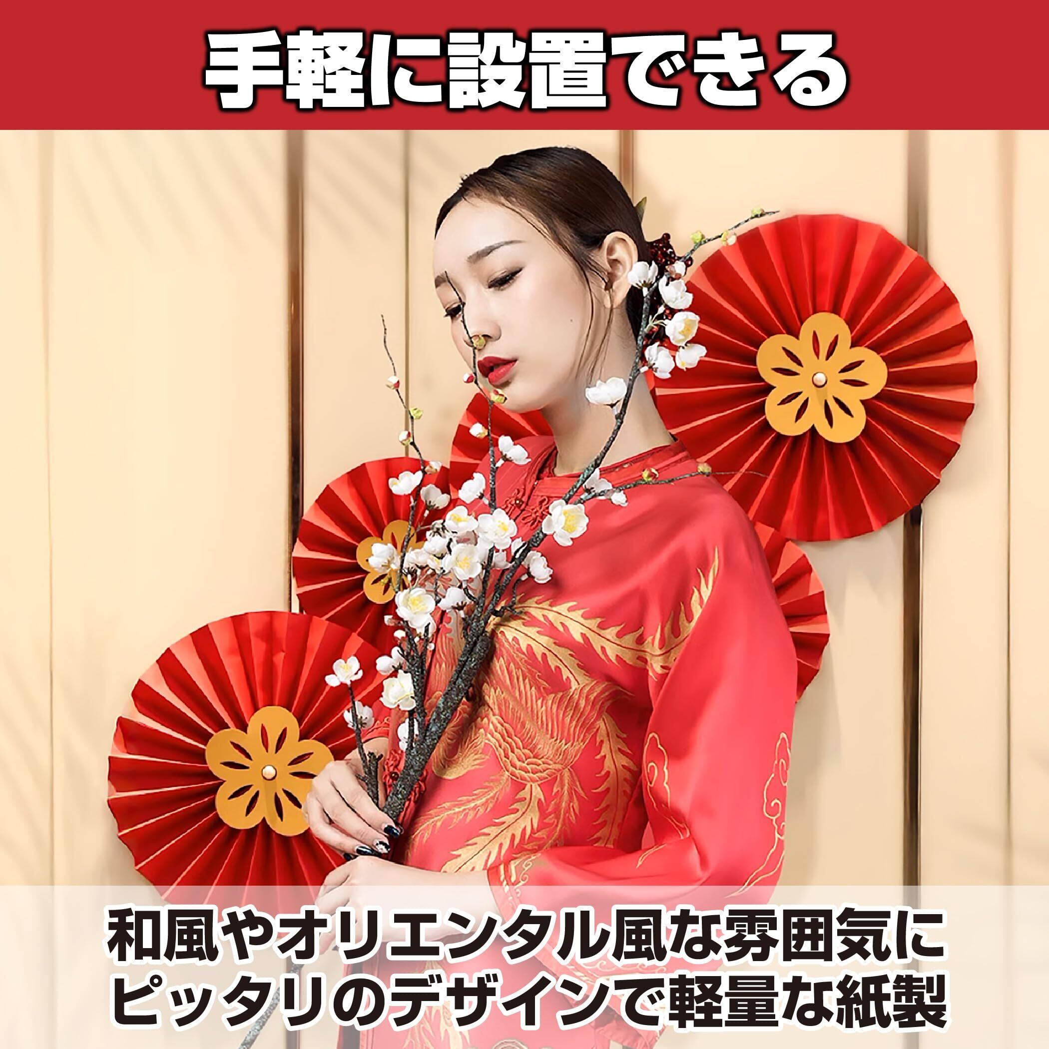華やかな飾り付けができるペーパーファン:扇子状の丸い飾りの中央に、ゴールドの梅の花を配置した華やかなペーパーファン6点セットです。和風やオリエンタル風な雰囲気にピッタリのデザインで、軽量な紙製なので手軽に設置できます。