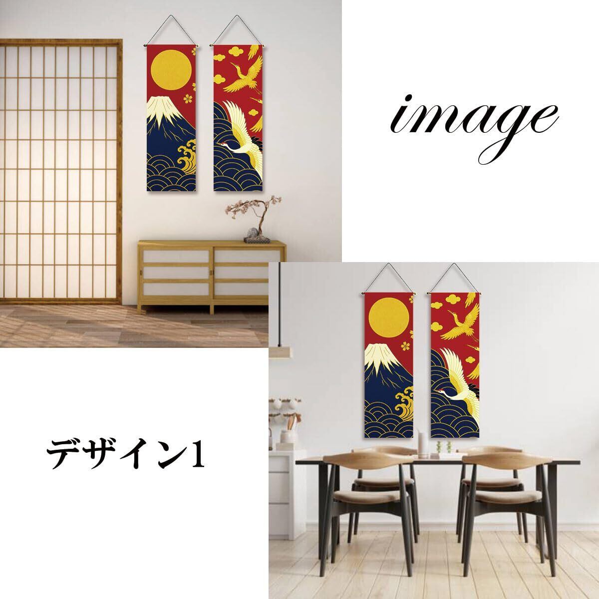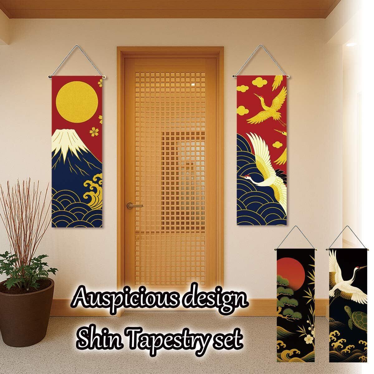 next.design タペストリー 掛け軸 2枚セット 鶴 富士 日の出 亀 松竹梅 吉祥模様 風景 正月 和風 癒し 飾り 壁掛け 壁面 吊るし 飾り ミニ 旗 コンパクト 室内用 おしゃれ アパート マンション インテリア (デザイン1)