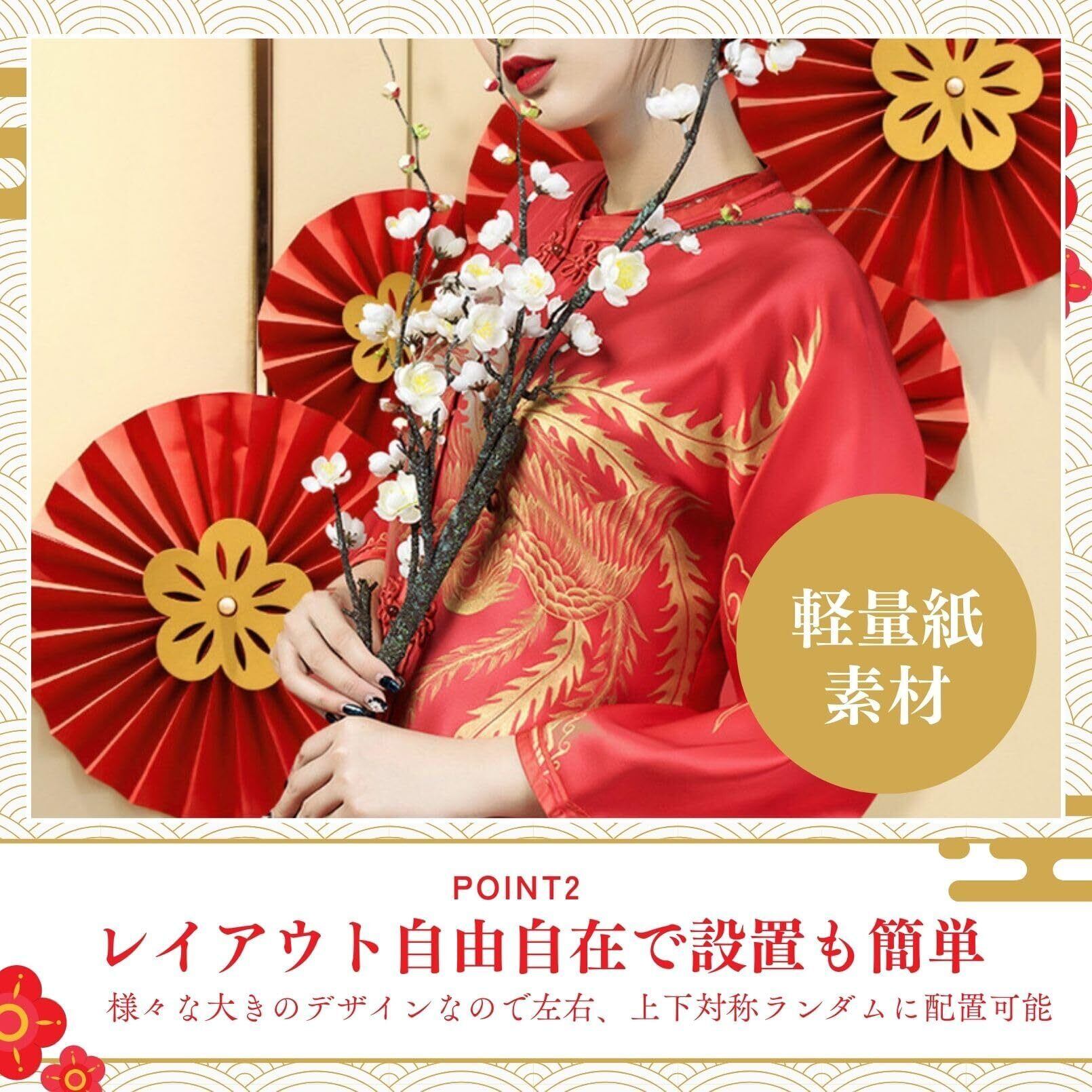 【設計】扇子状の丸い飾りの中央にゴールドの梅の花をあしらい、和風やオリエンタル風の雰囲気にぴったりです。