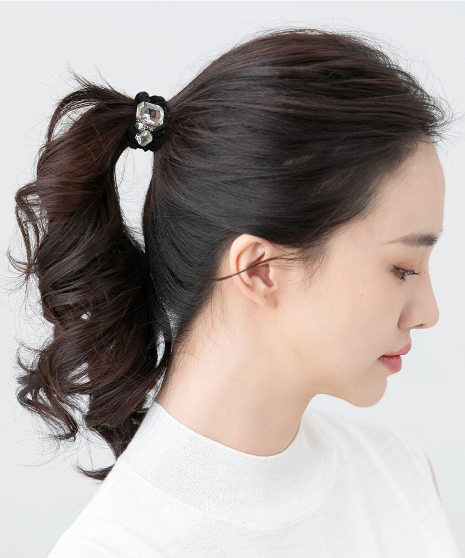 【上品】シックな色合いで艶感が綺麗な印象。定番のシュシュも女性らしい光沢のあるサテン生地で、ぐっとエレガントな印象に。
