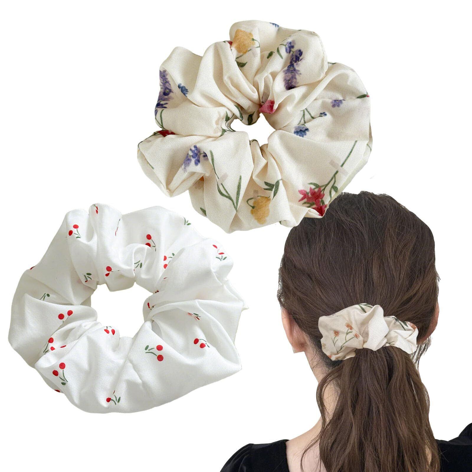 【内容】花柄シュシュ2本;太さ約5cm;直径約13cm。シックな色合いで艶感が綺麗な印象。柔らかくて、光沢のある生地で、ぐっとエレガントな印象に。