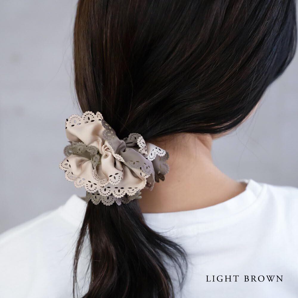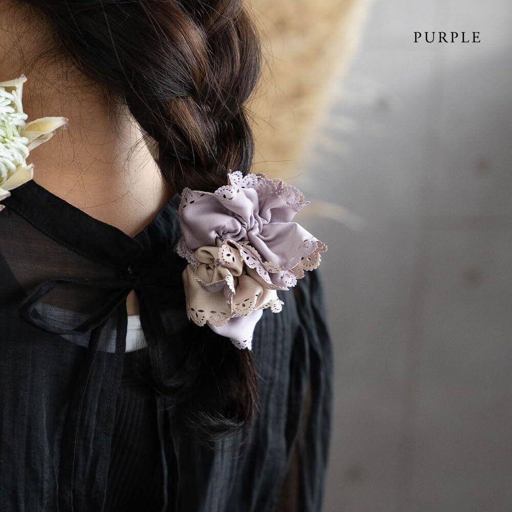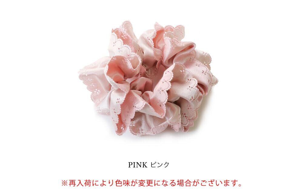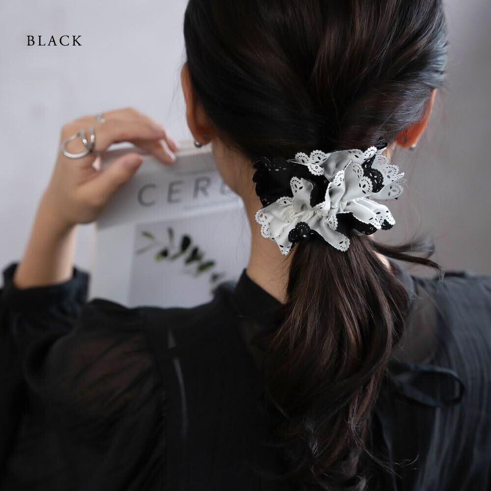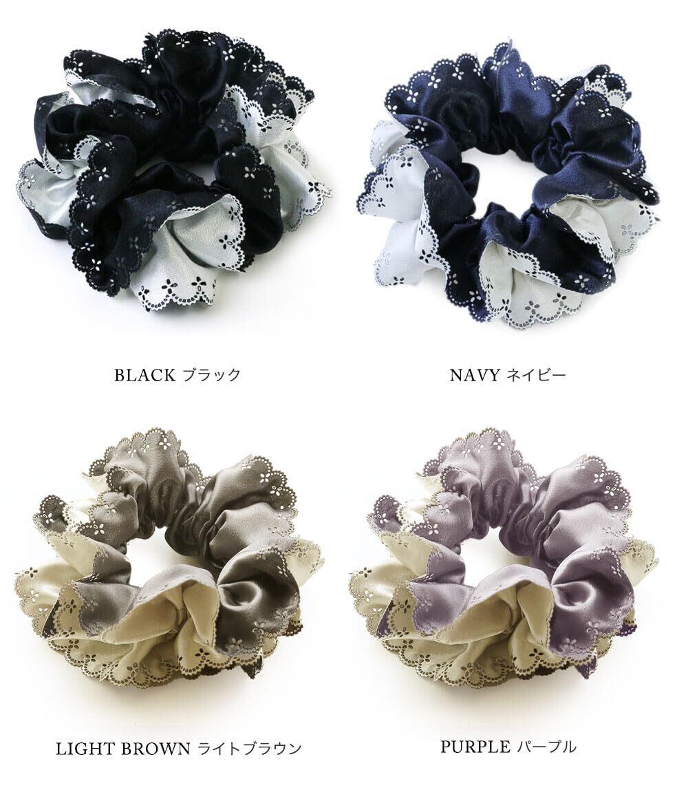 【人気デザインのシュシュ】人気のレースカットシュシュがリニューアル! 女性らしいレースカットを施した縁取りが大人可愛い雰囲気です。 生地は柔らかいサテン生地で上品な光沢感があり、シーンを選ばずどんなコーデにも合わせやすいデザインです。