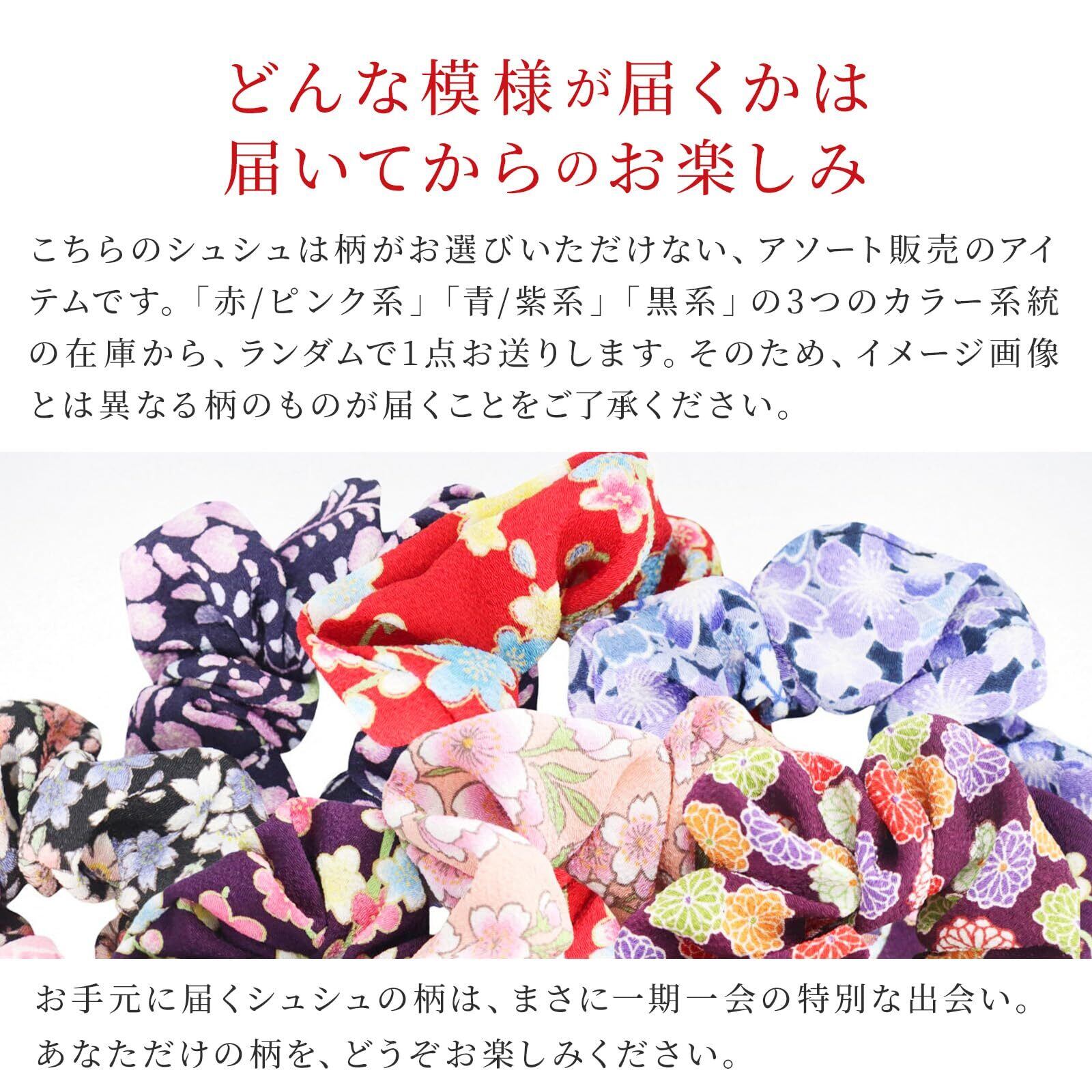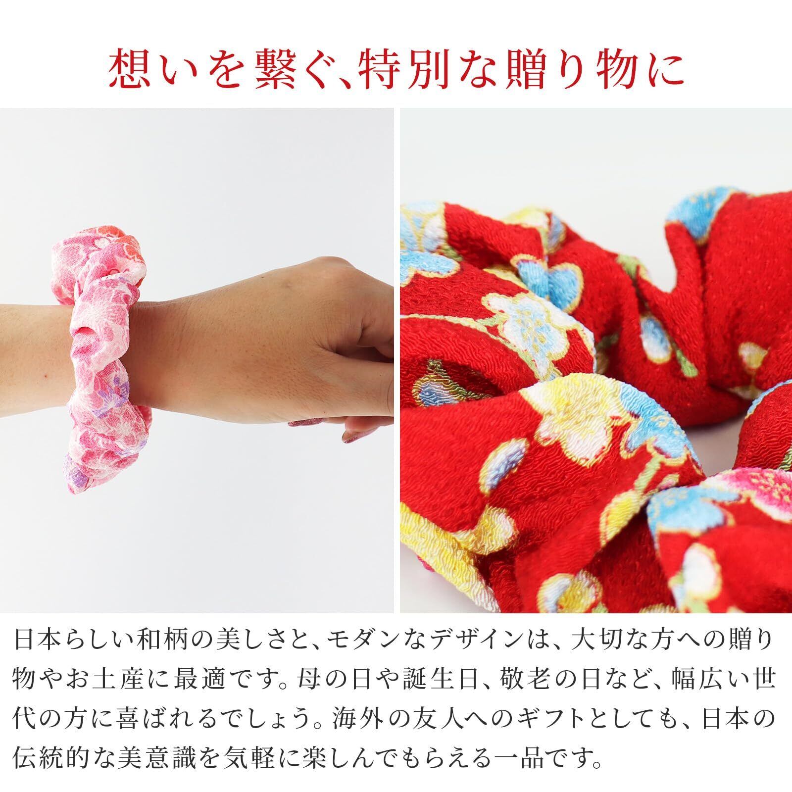 和柄をいつでも楽しめて、気軽に普段使いできる和柄のちりめんや、和柄の生地を使った和風のシュシュです。黒色・赤/ピンク・紫/青の3系統の色目があり、和布ならではの上品で可愛らしいデザインがそろっております。手首にはめてブレスレットがわりにしたり、ちょっとしたおしゃれに髪の毛を彩るヘアアクセサリーとしても、持っておけば重宝するアイテムです。