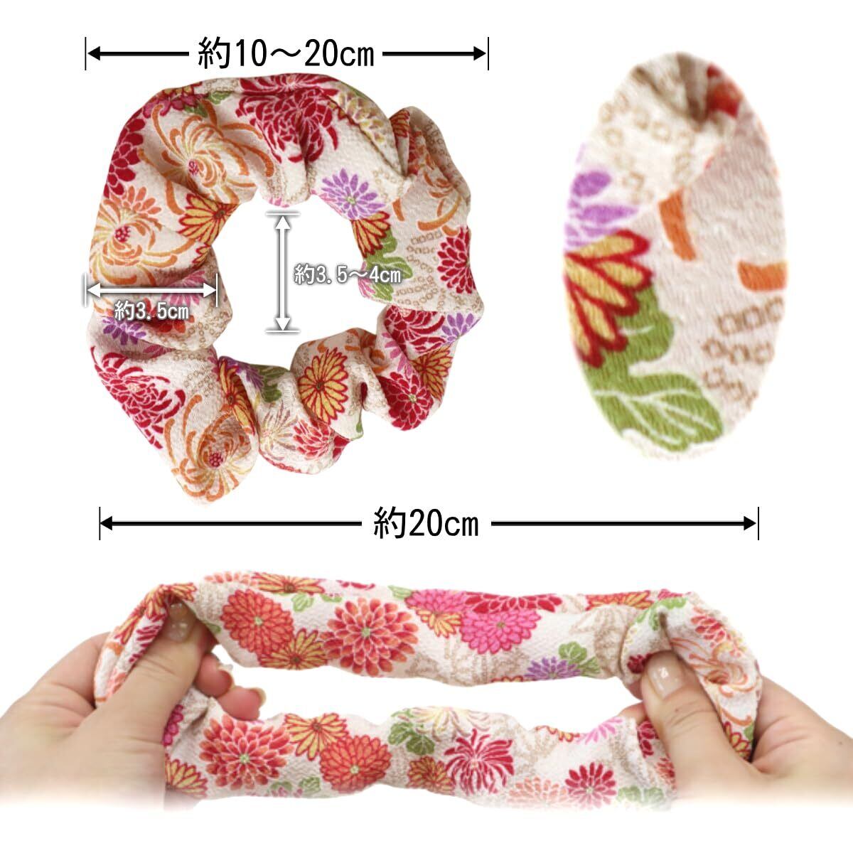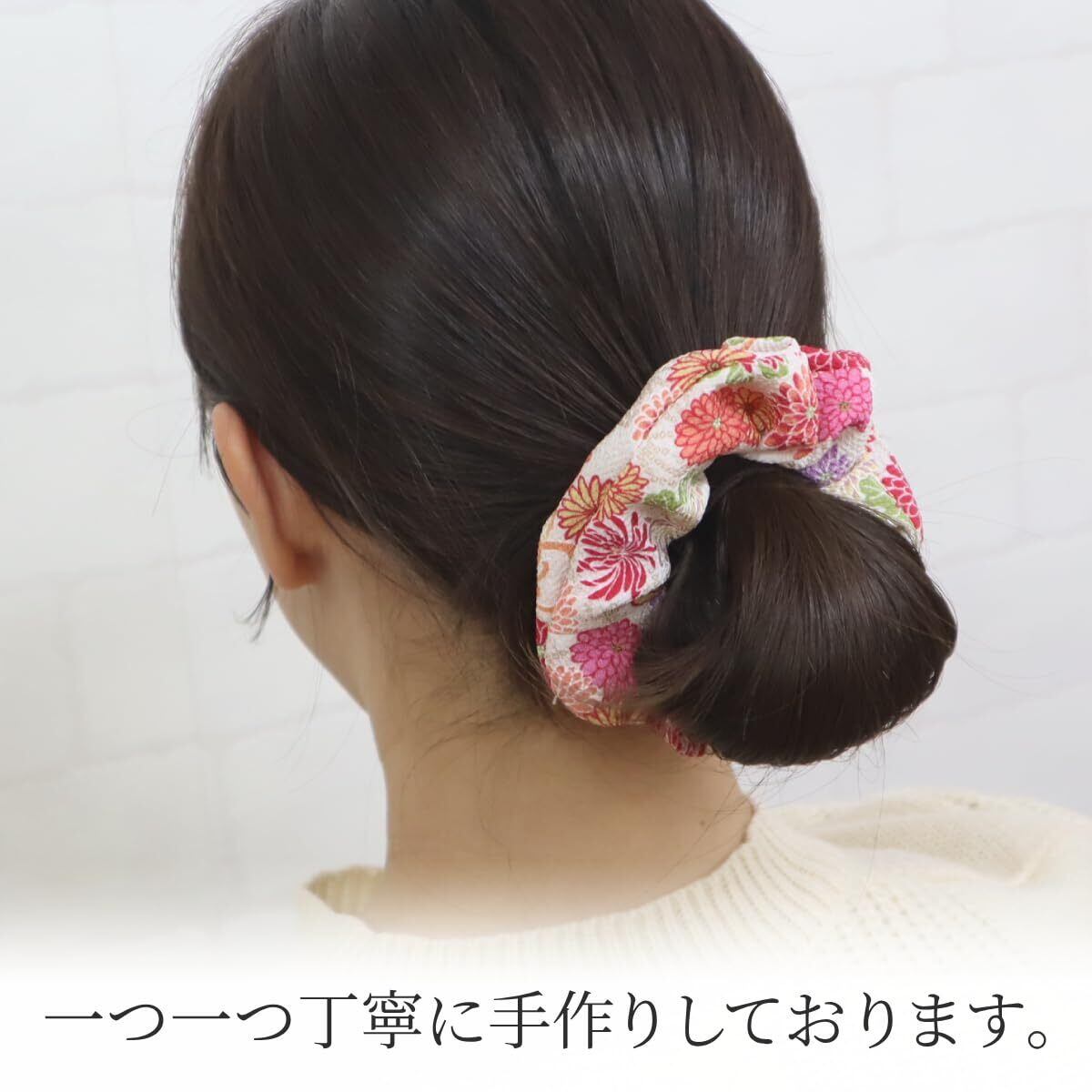 ◆【様々なシーンに】ポニーテールやお団子ヘアの仕上げ、チャームのようにバッグにつけたり、手首に巻いてブレスレット替わりに使ったり用途いろいろ。色鮮やかな和柄のシュシュを使ってテンションをあげたり、おうちでのリラックス時に愛用して下さい。