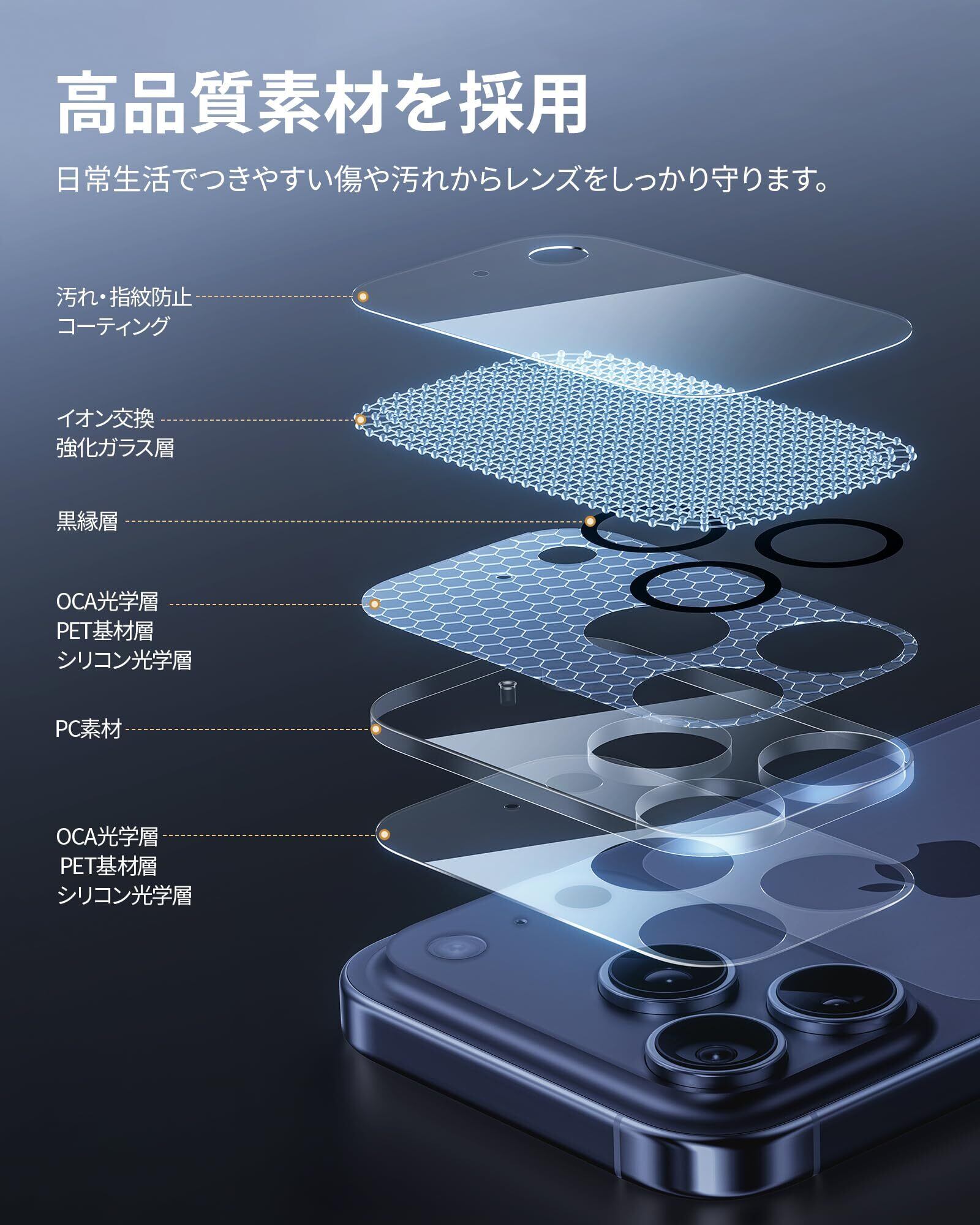 【9H硬度&·傷付きにくい】iPhone 17 Pro カメラフィルムは 9H硬度の強化ガラスを採用しているため、鍵、砂利などの日常的な衝撃からカメラをしっかり保護します。特殊な多層構造で割れても破片が飛散せず、安全性も高いです。ポケットやバッグの中で他のものとぶつかってもiPhone 17 Pro カメラに傷がつきません。