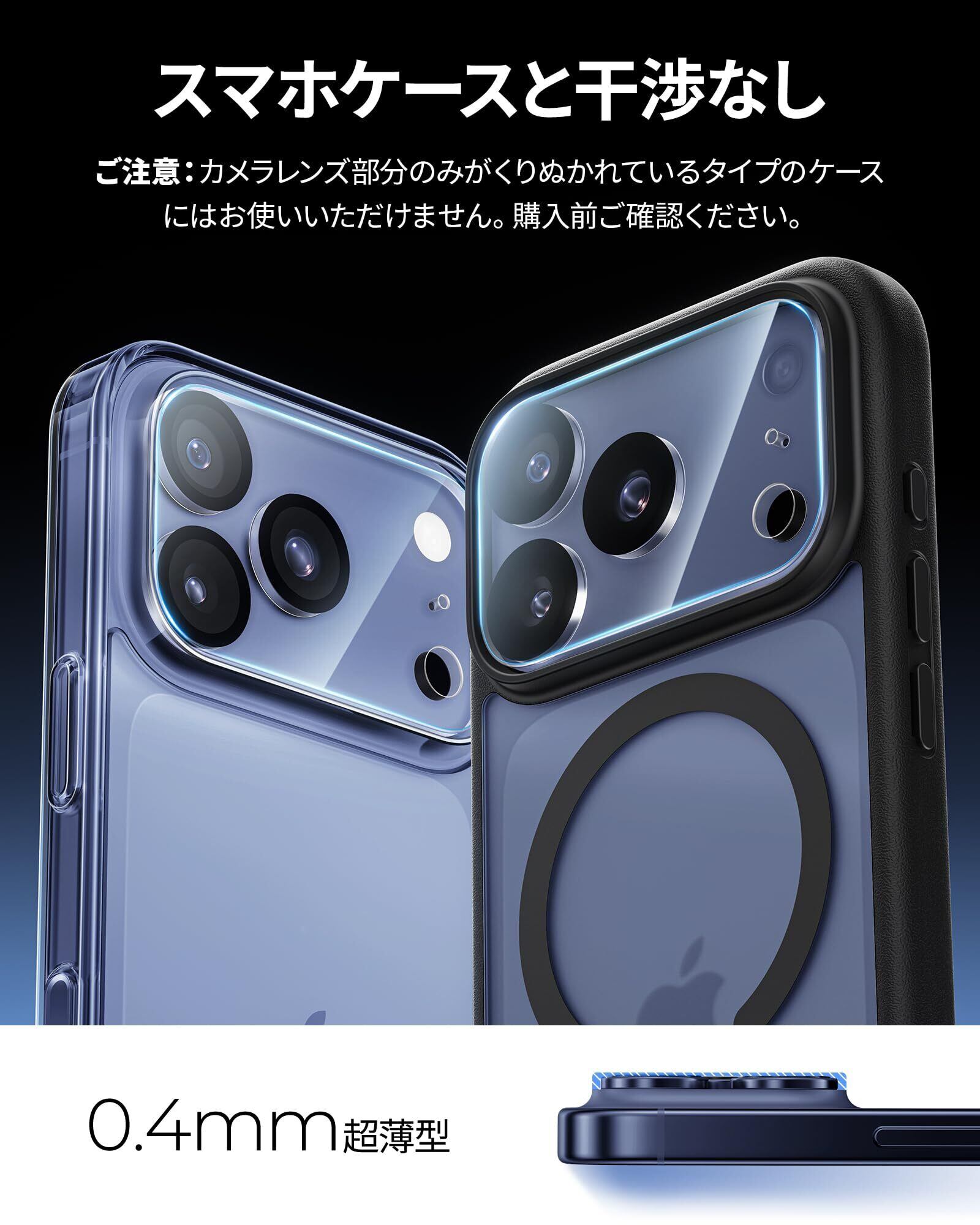 【全面保護&防塵効果】iPhoneのサイズに合わせて精密に設計されており、カメラ全体を保護しつつ、ケースと干渉しないようデザインされています。あいほん17Proのカメラレンズにしっかり密着することで、レンズの保護はもちろん、ホコリの混入や汚れを防ぎます。レンズを長時間綺麗な状態に保つことで、iPhone17Pro レンズの寿命を効果的に延ばすことができます。