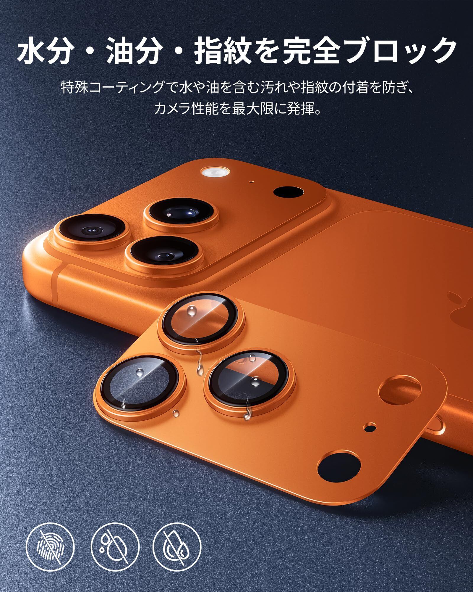 【撥水撥油・指紋防止】iPhone17pro カメラ保護には高耐久撥油コーティングを施しているため、指紋や汚れが付着しにくく、付いた汚れもサッと拭き取れるので、常に清潔な状態が維持できます。